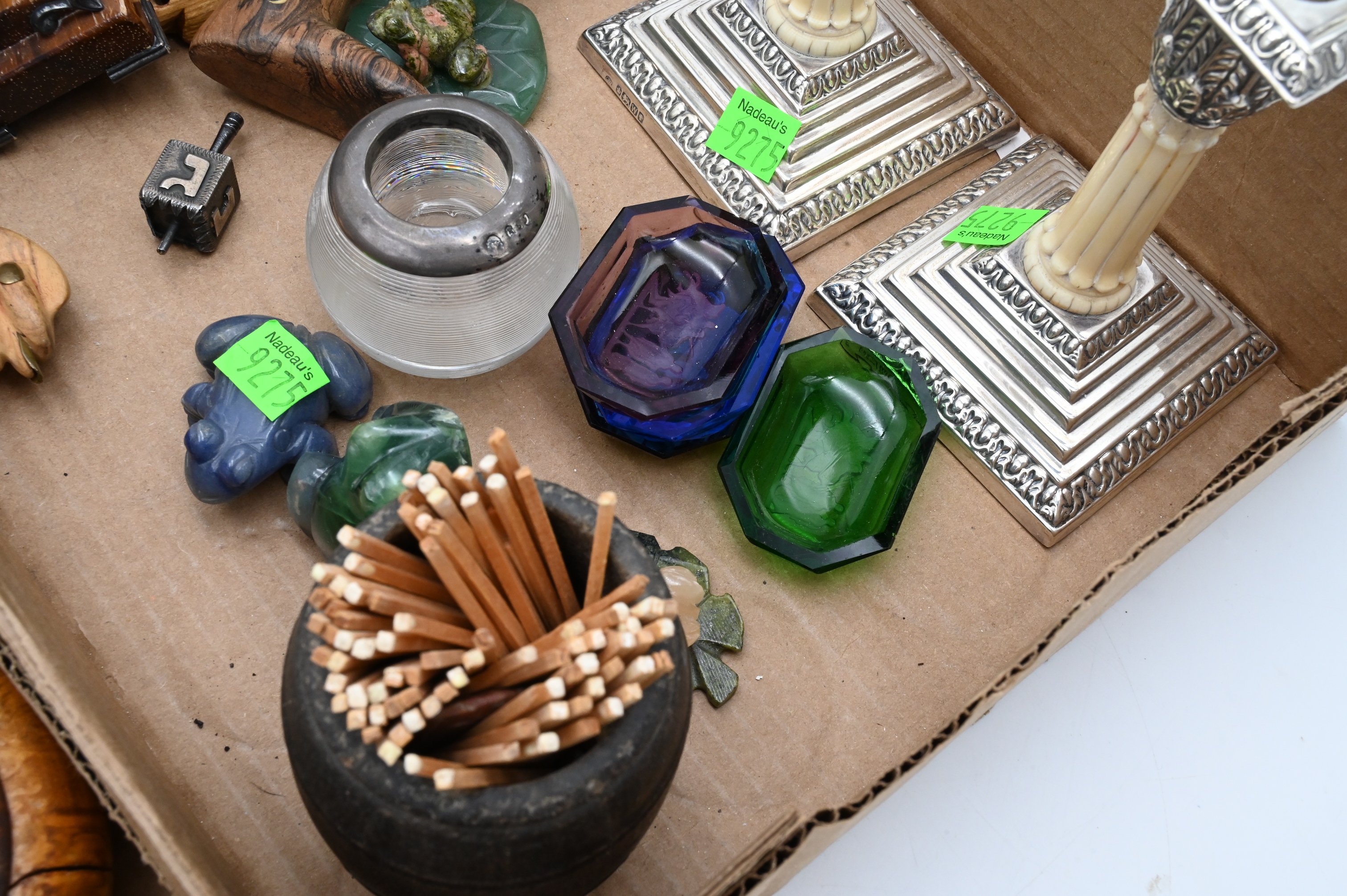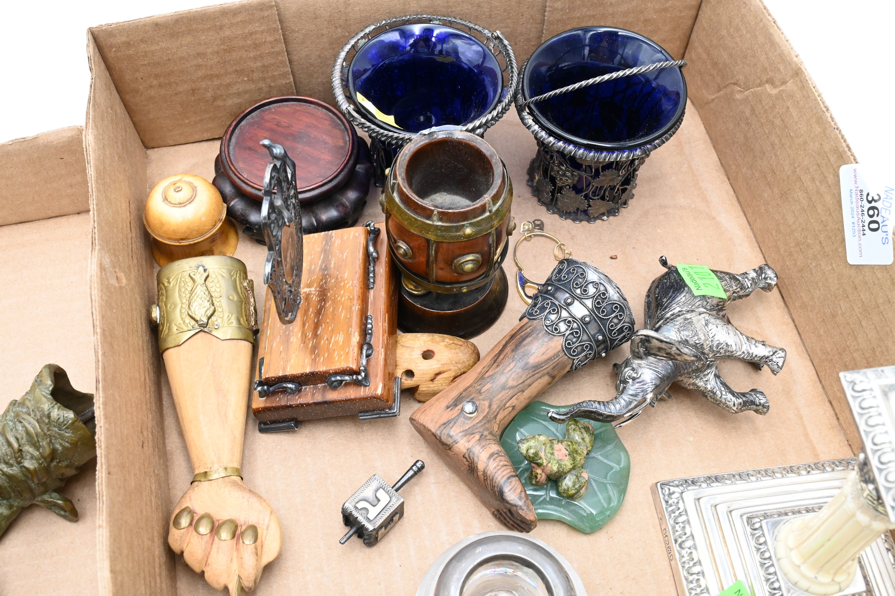 to include turned candlesticks, small barrel match stick holder, pair of cobalt salts, Judaica articles, silvered elephant, bronze ram head bell, etcetera