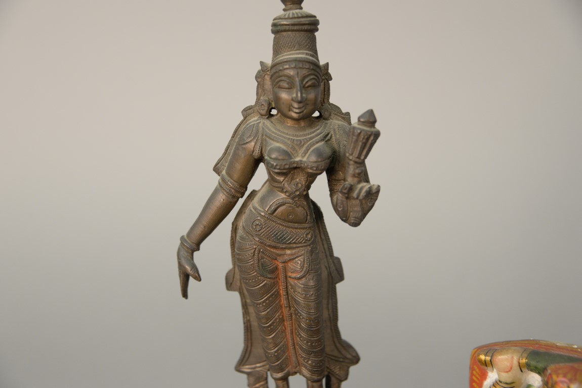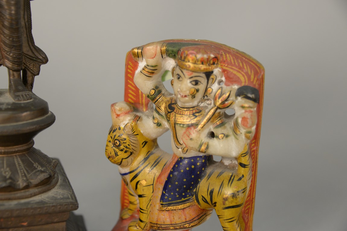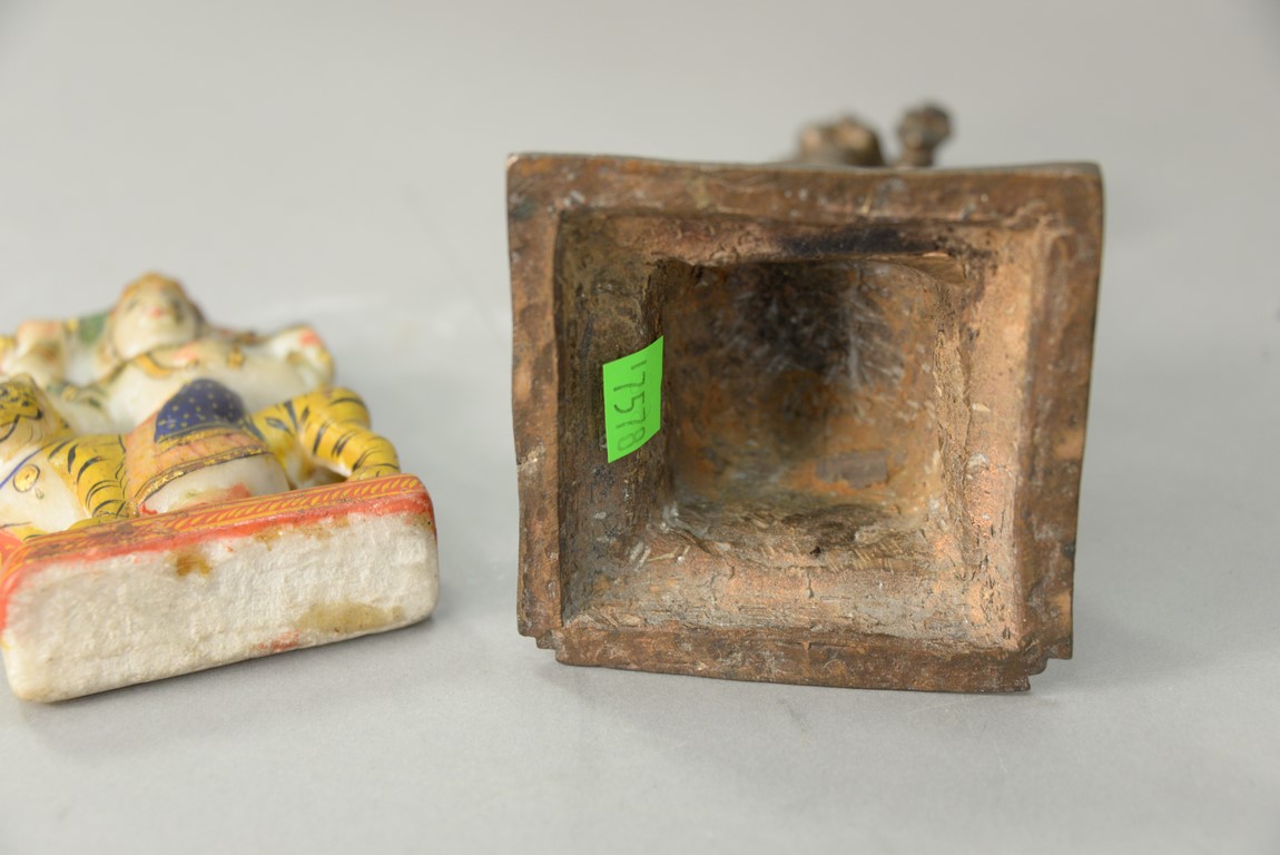 Two Oriental items to include a bronze woman standing on lotus base and a painted marble mystical figure on a tiger. ht. 9 3/4 in. & ht. 4 3/4 in.