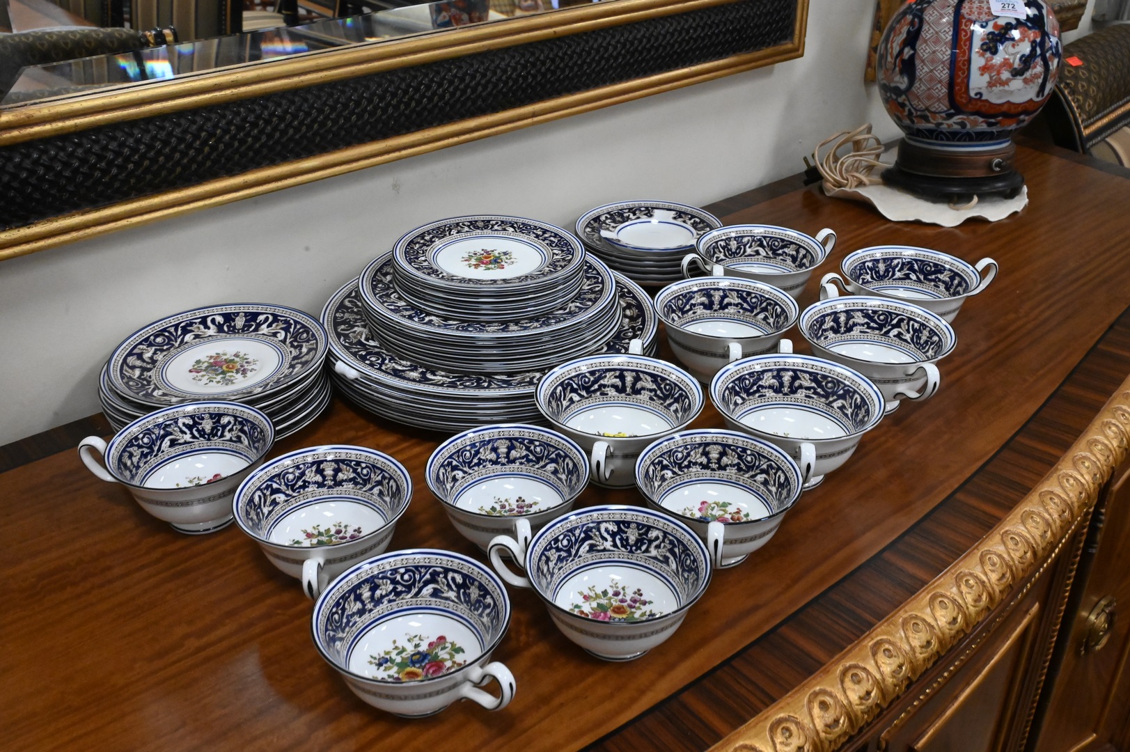 94 Piece Florentine Pattern Wedgwood Dinnerware Set, service for 12, to include 12 dinner plates, 12 salad plates, 12 bread plates, 12 teacups, 11 tea saucers, 12 cream soups, 12 cream soup underplates, 1 creamer, 1 sugar bowl, 3 ashtrays, 1 gravy boat, along with 5 serving pieces; dinner plate diameter 11 inches.