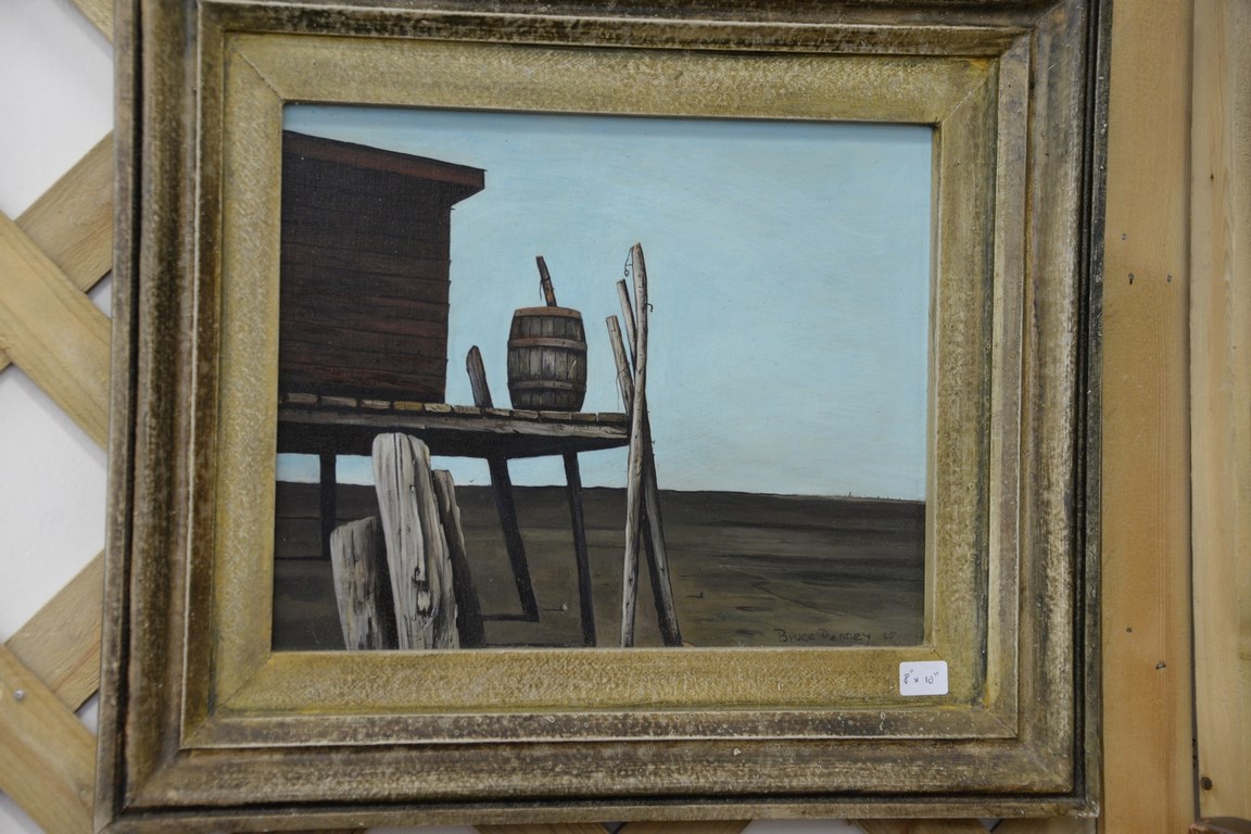 Bruce Penney 1929 two oil on board paintings, Tide Out at Docks signed lower left Bruce Penney 65 and Cabin on Water’s Edge signed lower right Bruce Penney 66. 7 1/2 x 11 1/2 and 8 x 10