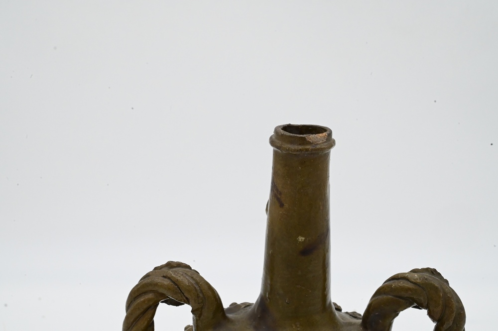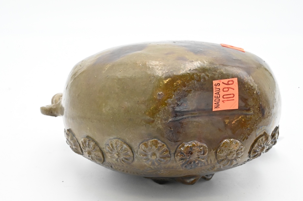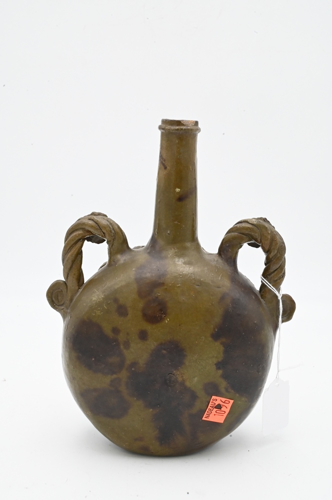 Lot 361: Ceramic Moon Flask, brown and green glazed, having twist handles, molded flowers and a figure on the neck, height 9 3/4 inches.