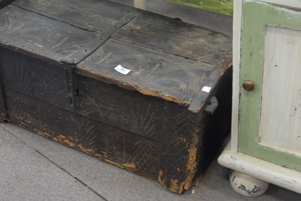 Early Continental lift top chest as is, probably 17th – 18th century, ht. 13, wd. 29.