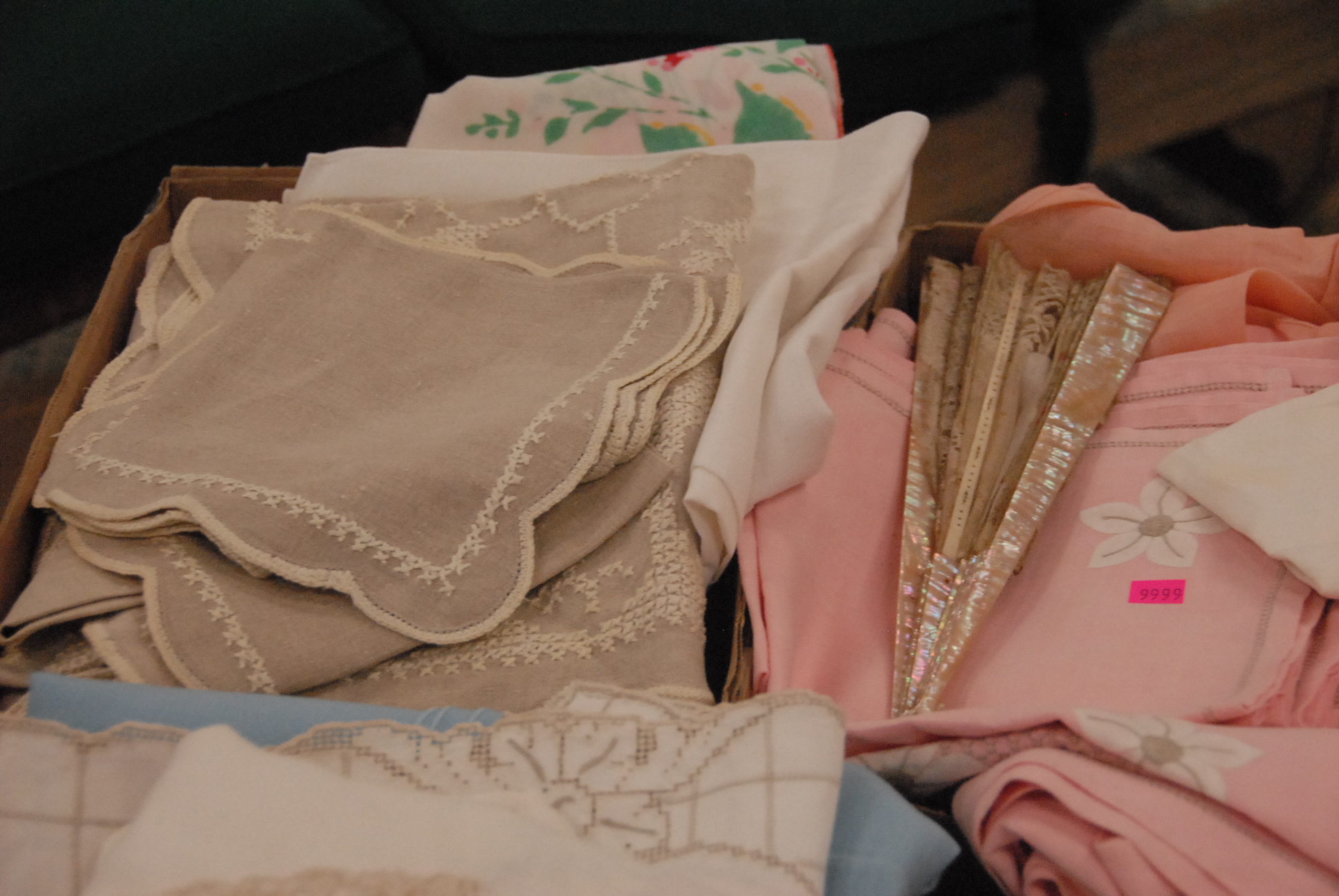 Five box lots of quality table linens and doilies.