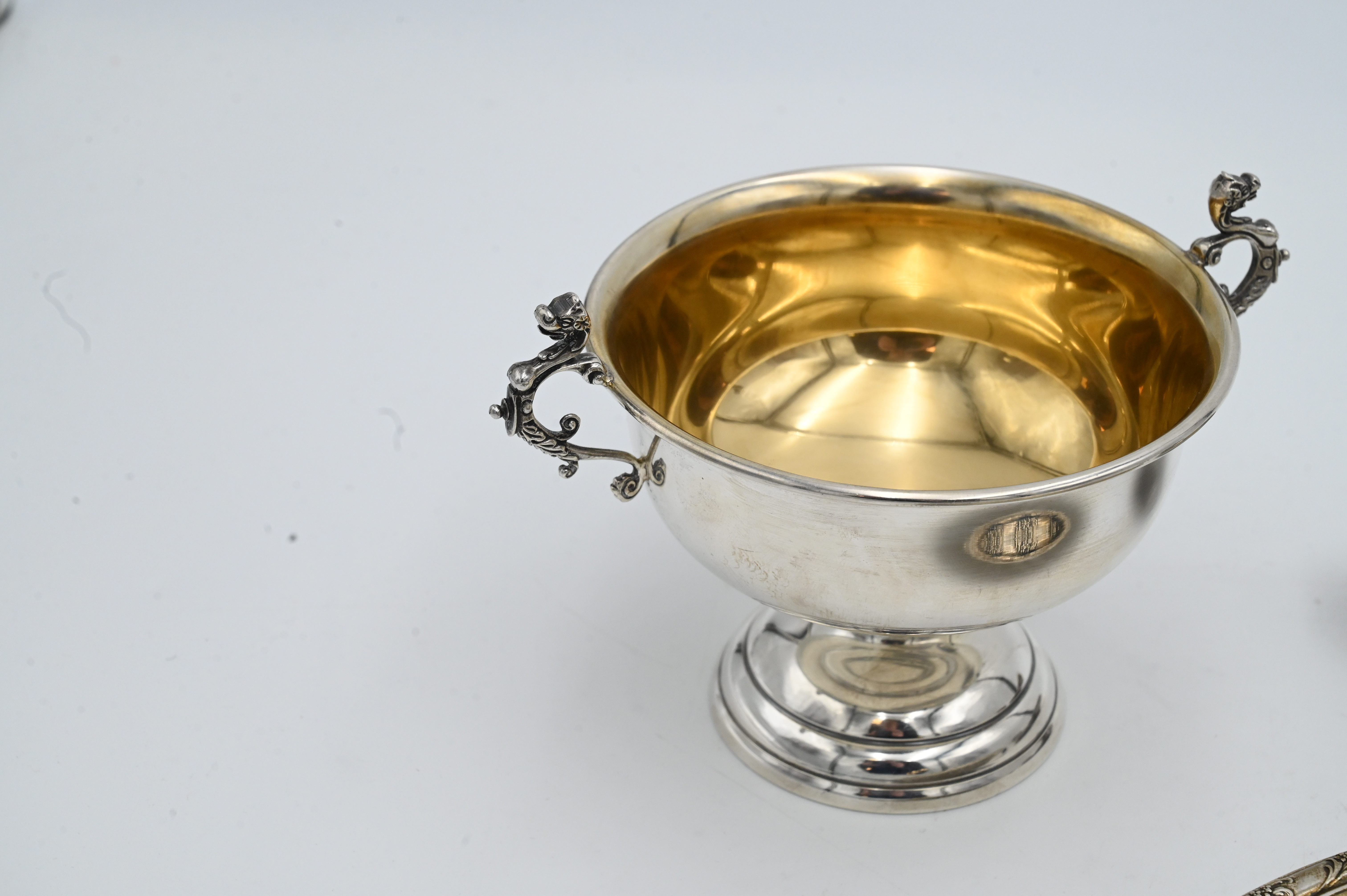 Five Piece Silver Lot, to include a two handled Reed & Barton bowl, shaped tray, round monogrammed plate, snuffer, along with a creamer having a cobalt liner, plate diameter 10 1/2 inches, 25.0 t.oz.