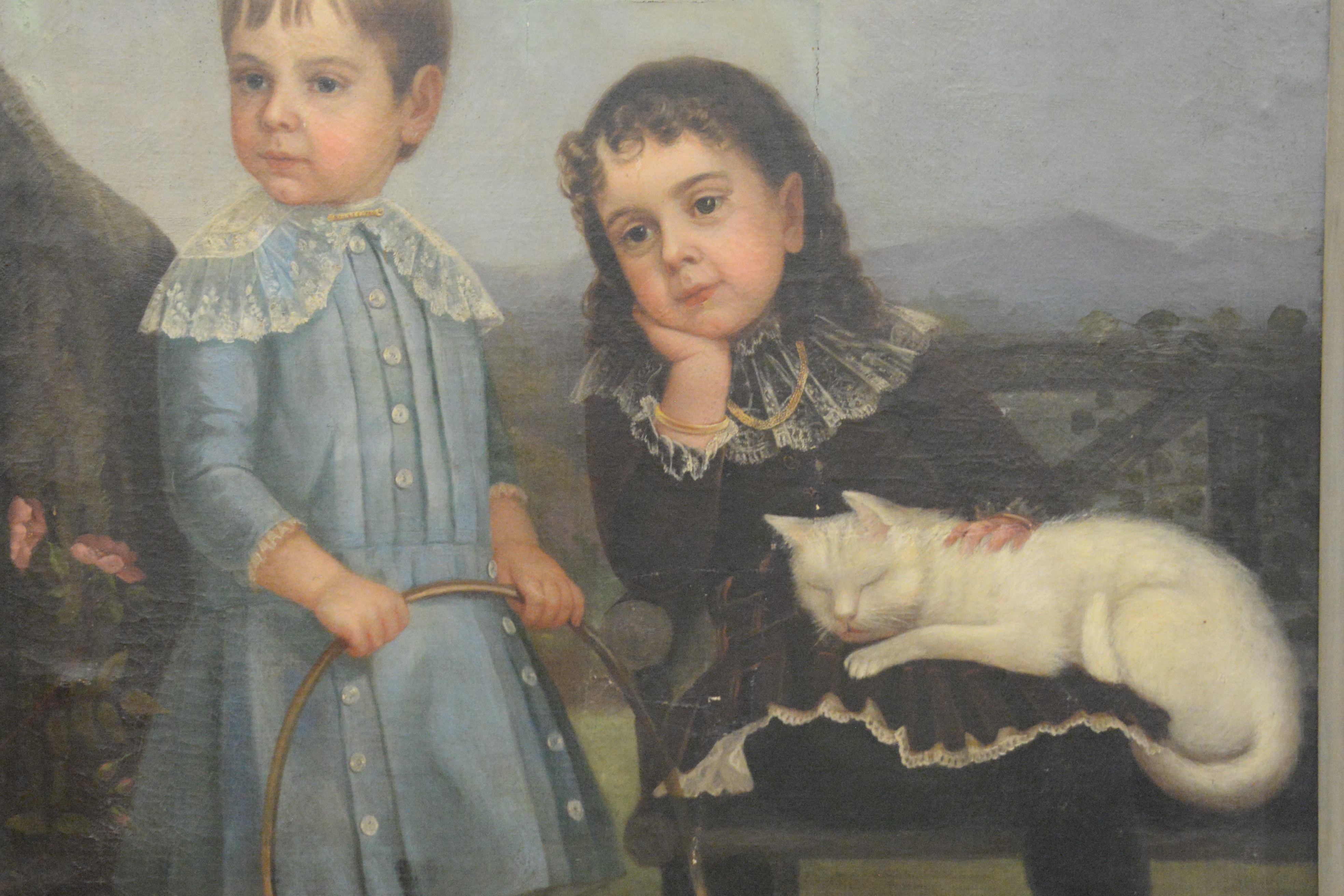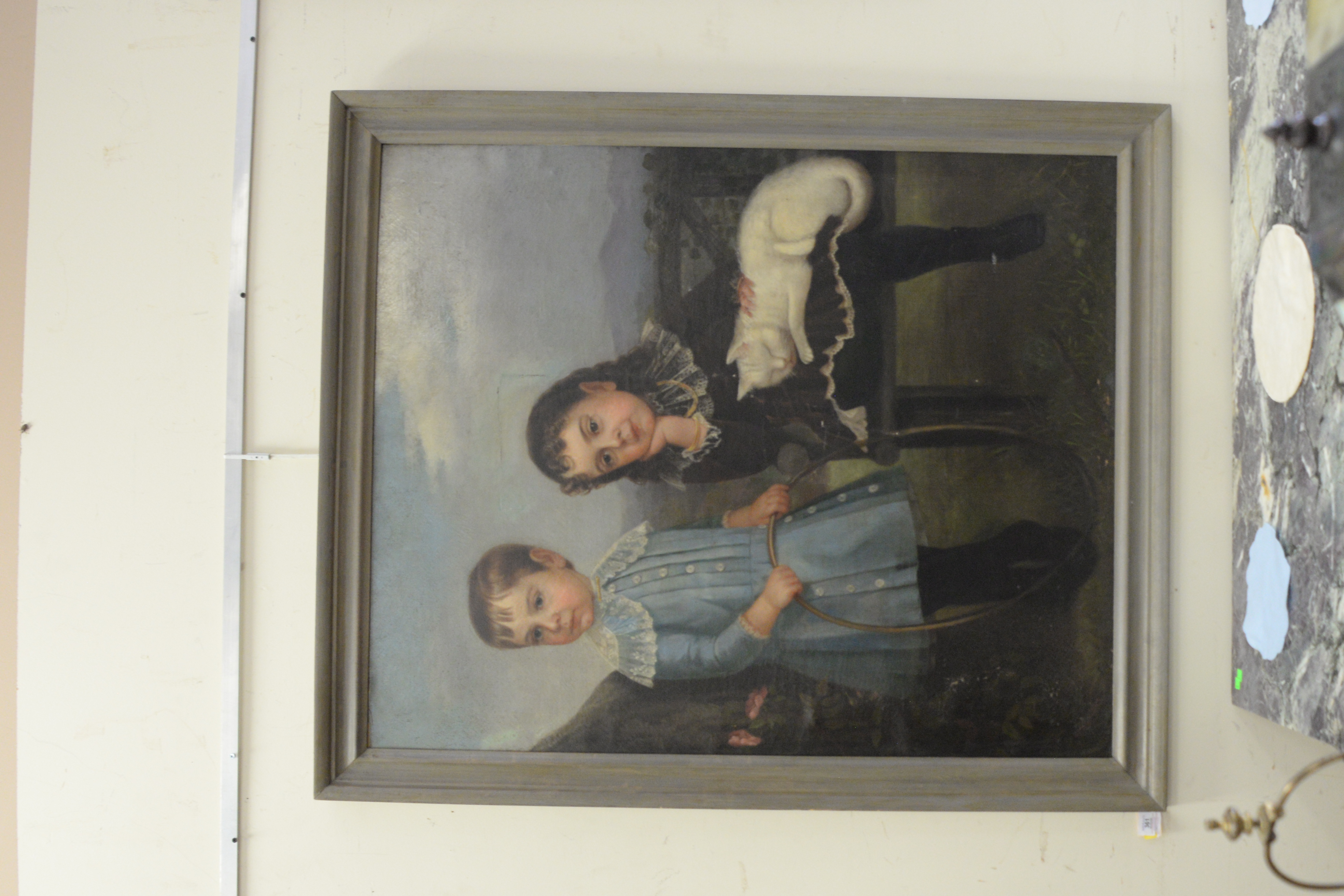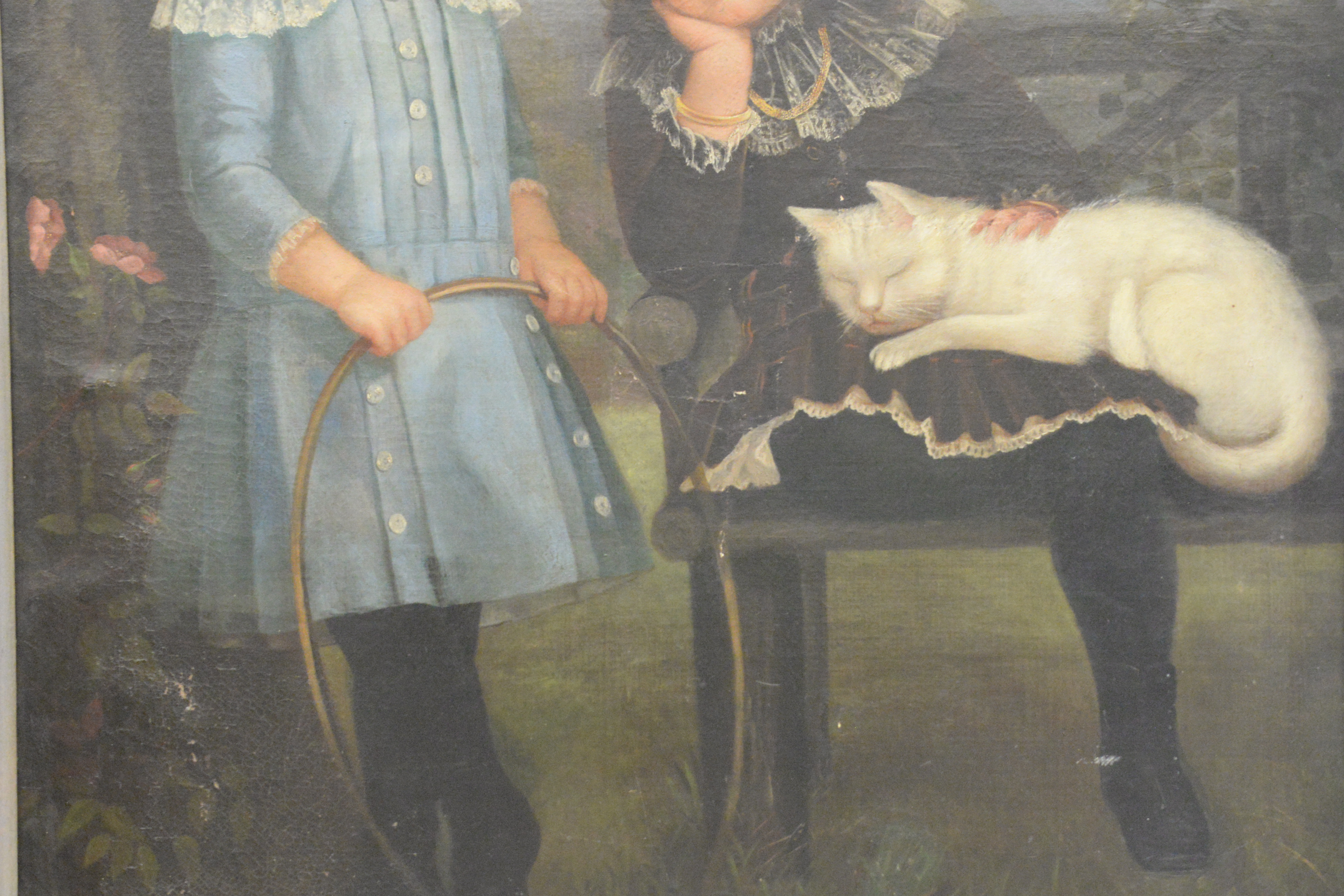 Featuring a boy in blue holding a hula hoop and girl petting a white cat