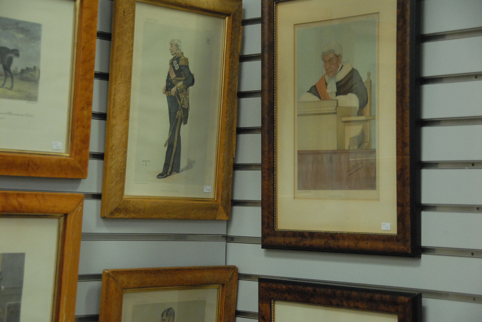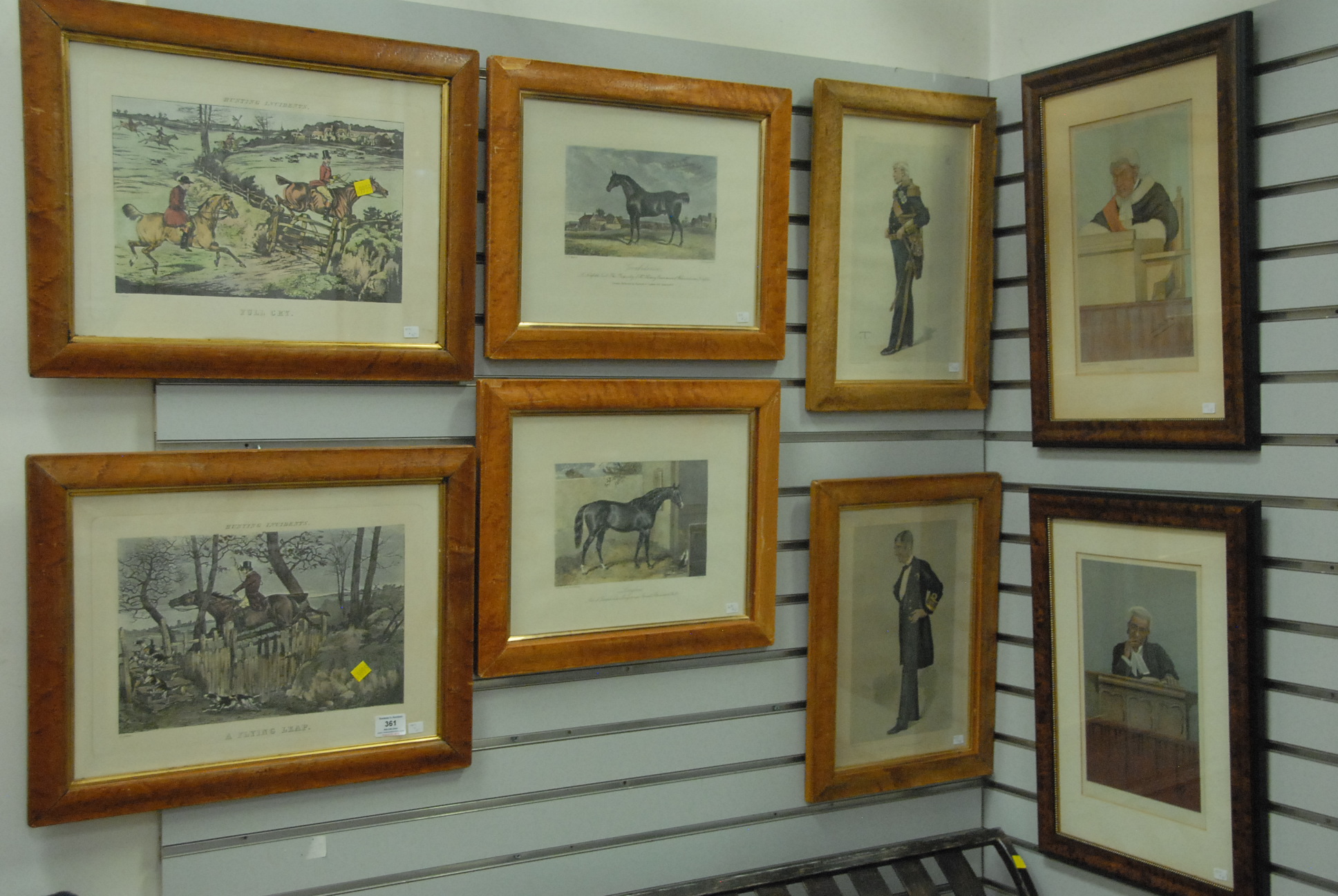 Lot 361: Group of eight framed prints with birdseye maple and burl frames, four are Vanity Fair Spy Prints and four are prints of horses, 5 1…