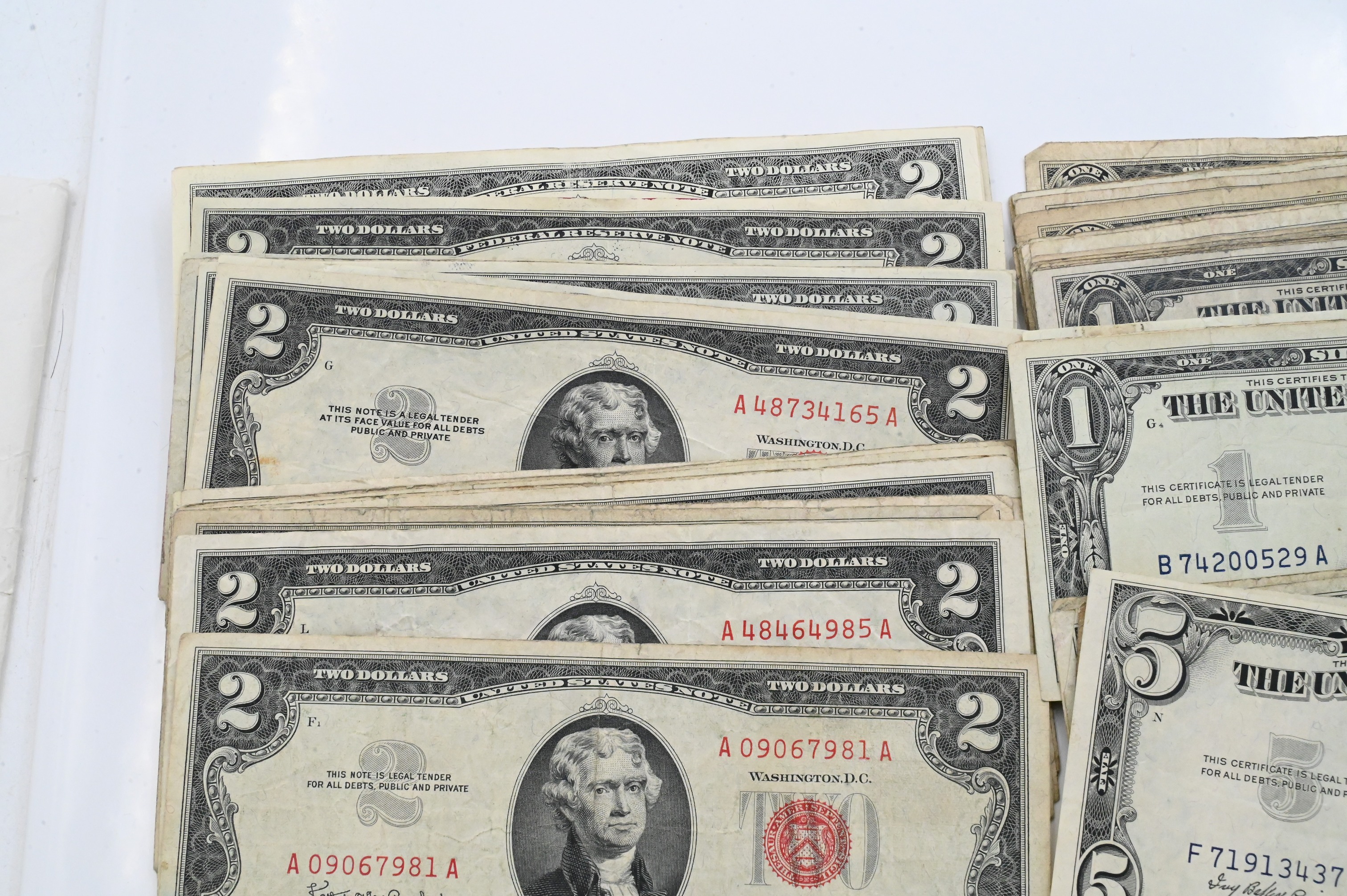 to include 30 $1’s, 7 $5’s, 14 $2 red notes, 16 $2’s (5 with stamps on them), and one $1 gold certificate
