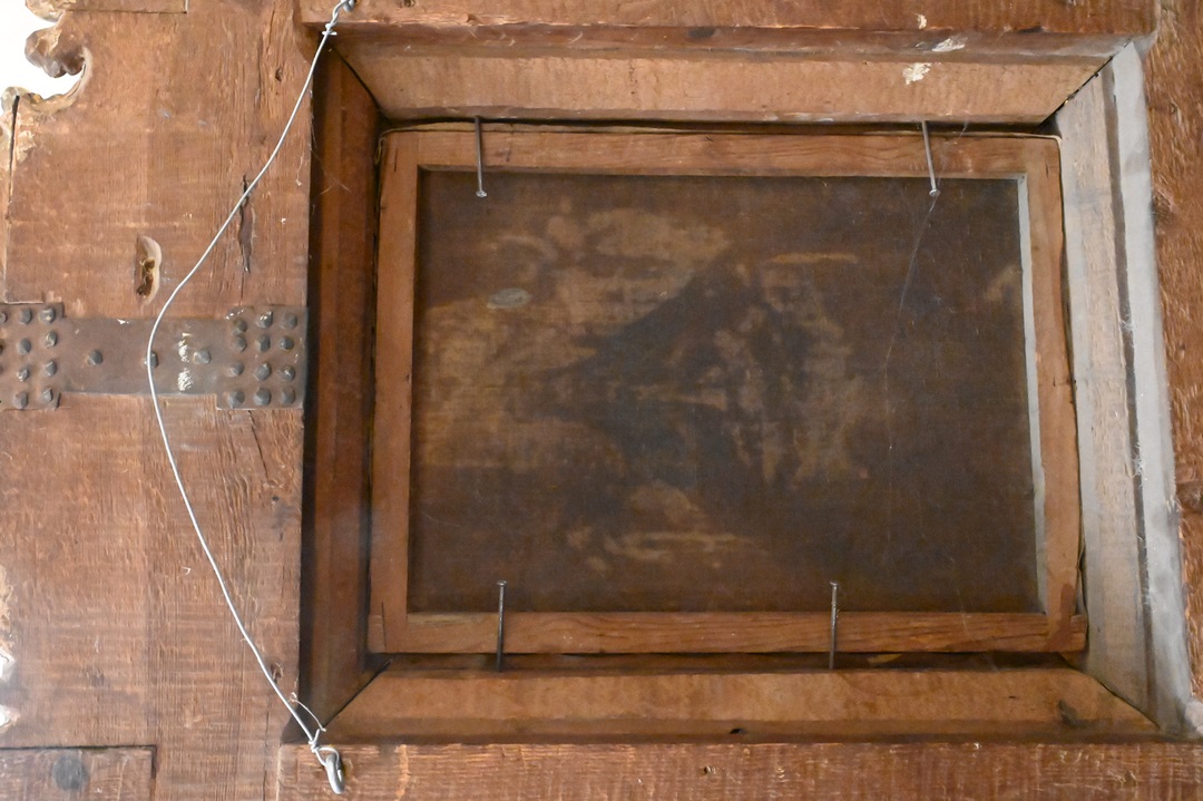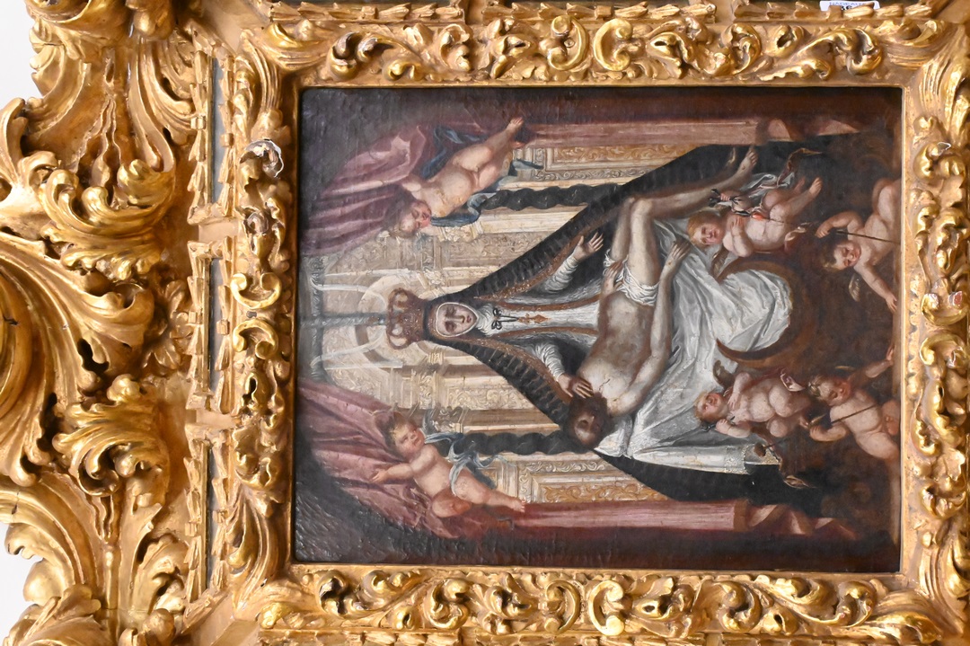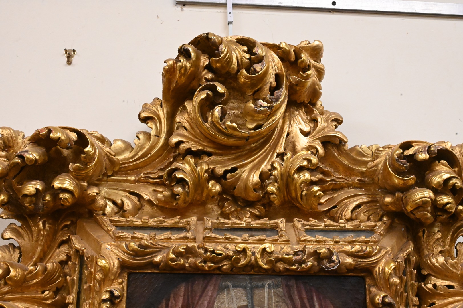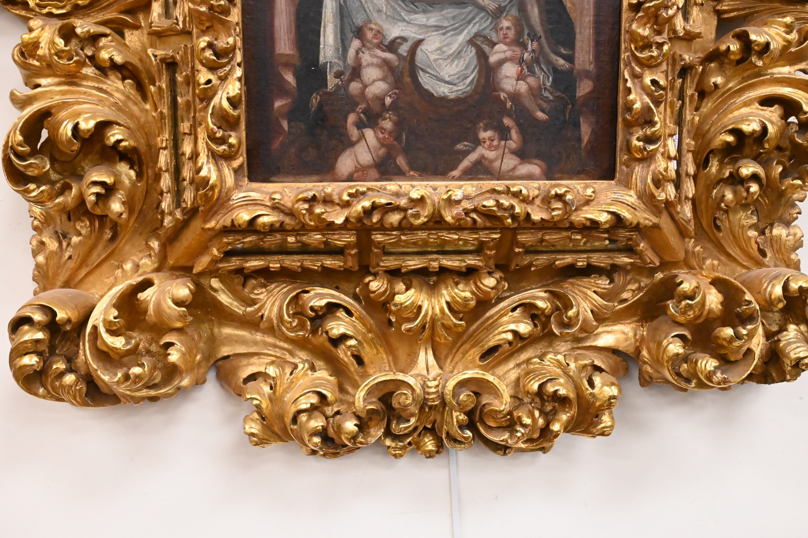 Interior Scene, oil on canvas, depicting Christ with Madonna surrounded by six putti figures, in large FlemisH Rococo carved and gilt gold frame, artist unknown, art 15 1/4 inches x12 inches, frame 40 inches x33 inches 17th/18th century.