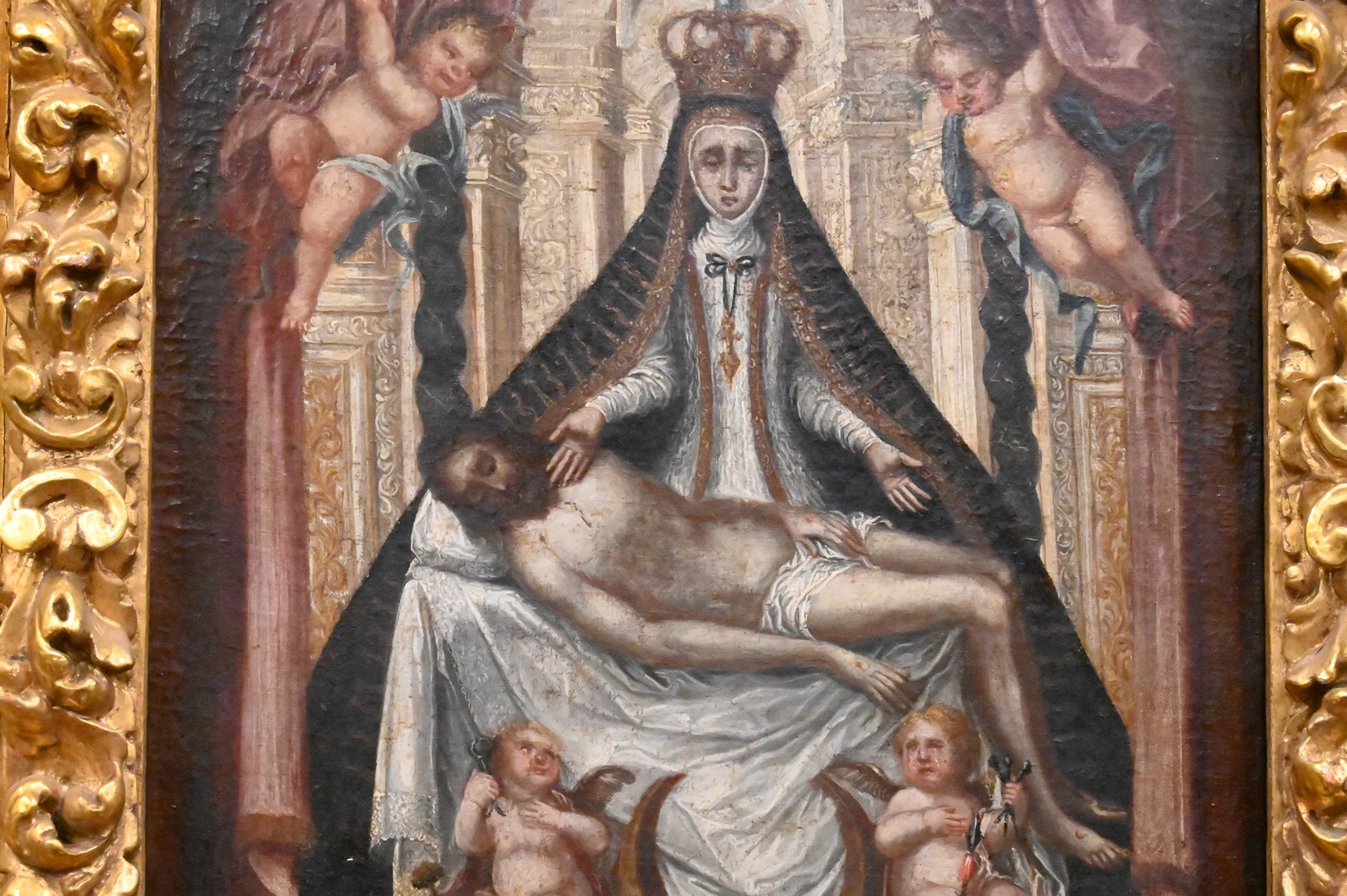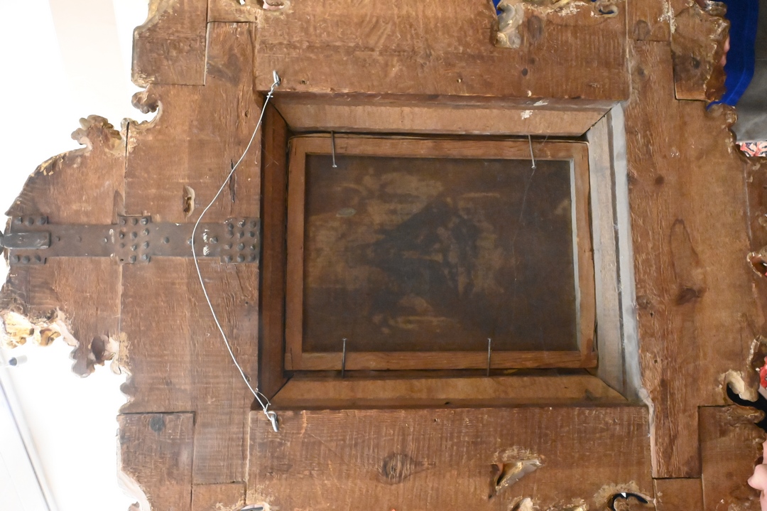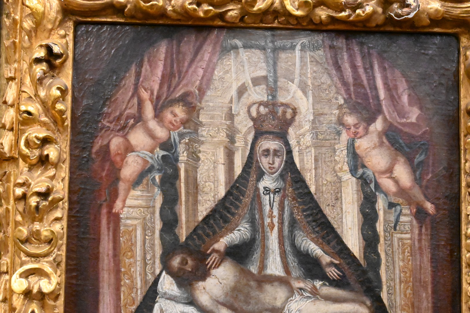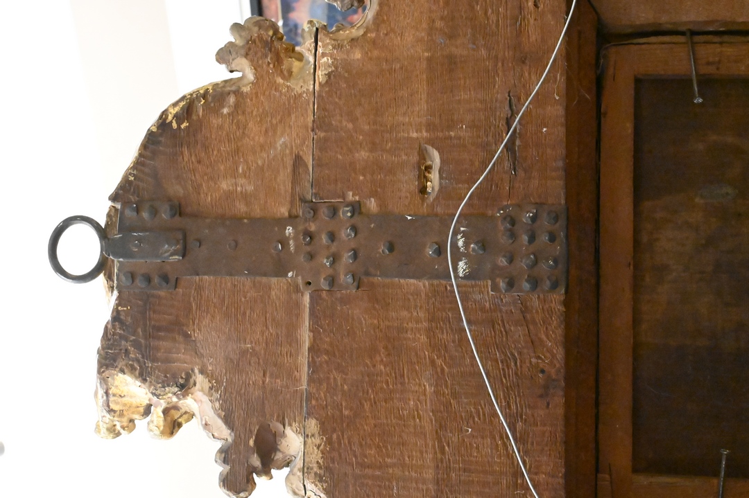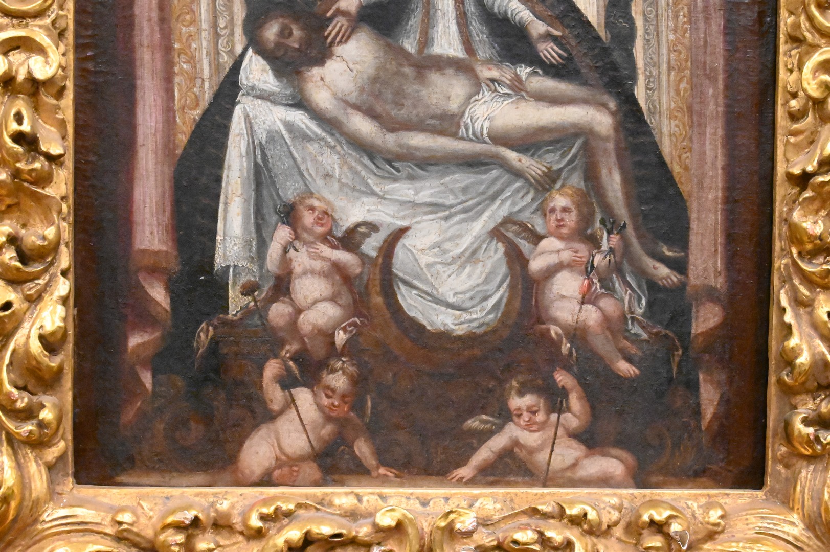 Interior Scene, oil on canvas, depicting Christ with Madonna surrounded by six putti figures, in large FlemisH Rococo carved and gilt gold frame, artist unknown, art 15 1/4 inches x12 inches, frame 40 inches x33 inches 17th/18th century.
