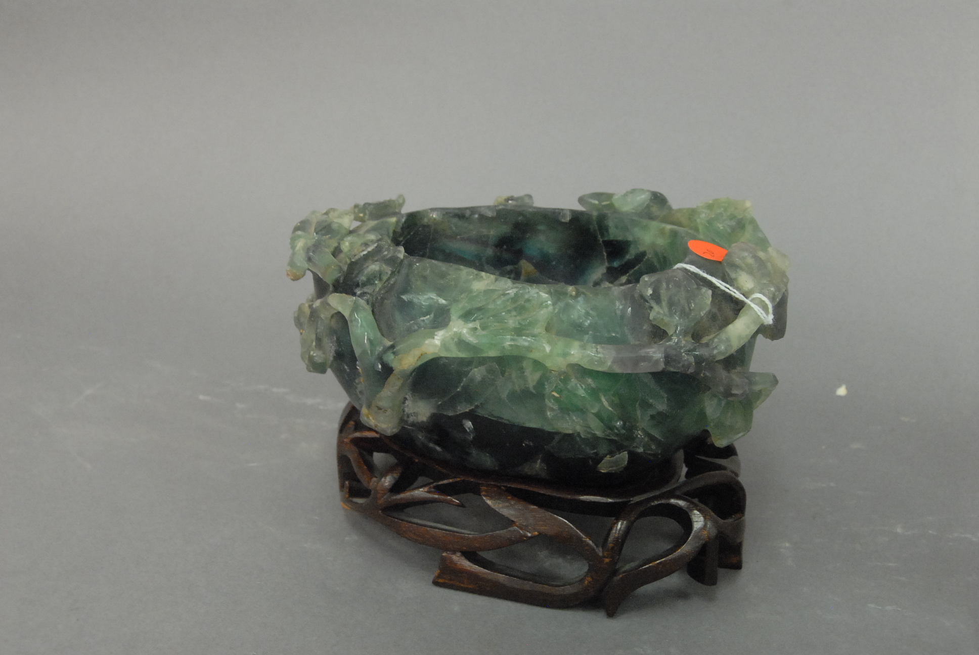 Large green quartz water coupe with high relief carved leaves, ht. 3 3/4.