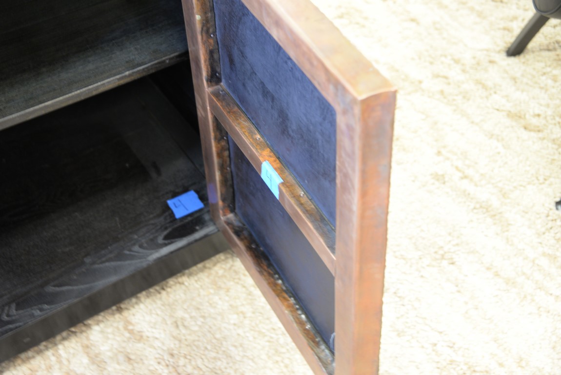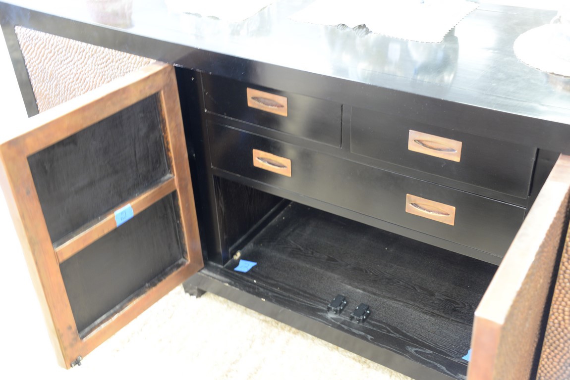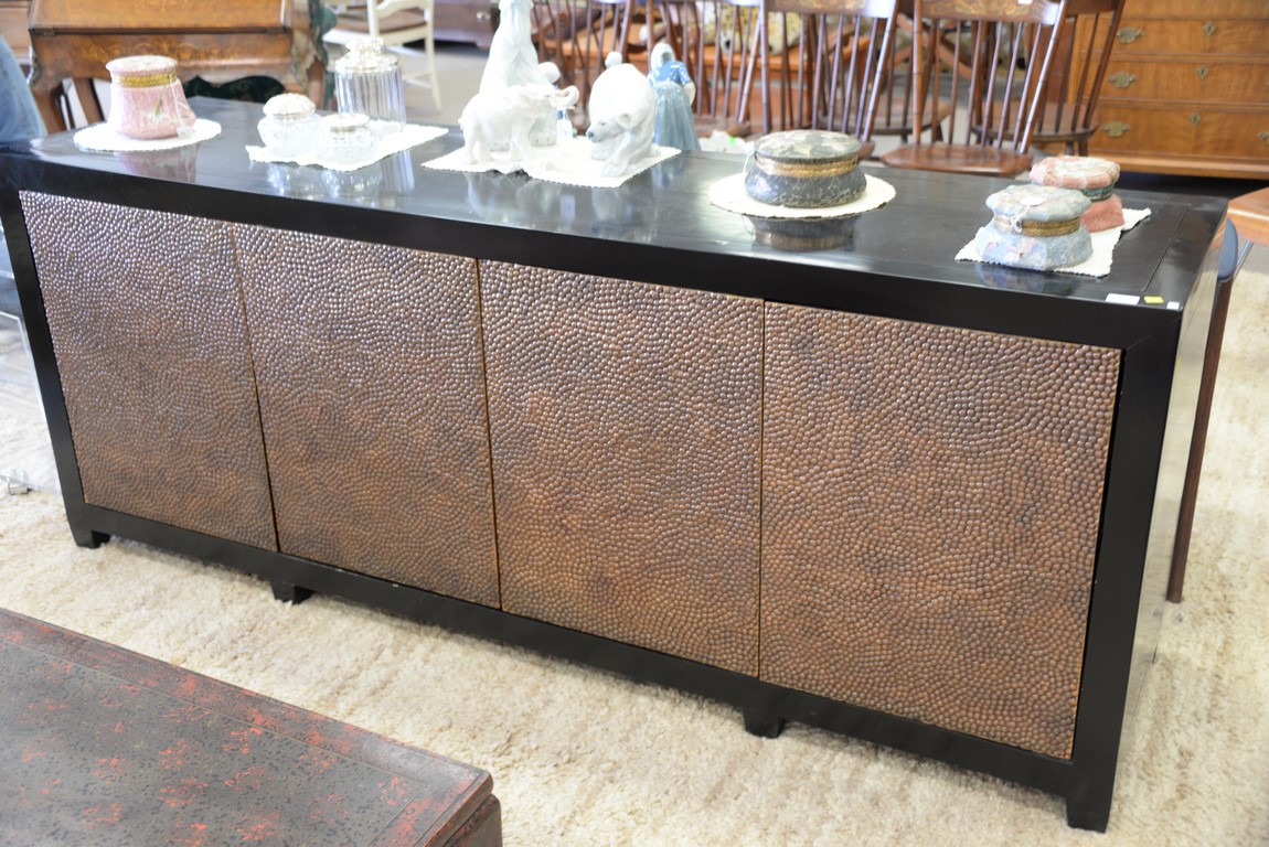 Maguire sideboard attributed to Bill Sofield, copper nail head doors with ebonized finish, four interior drawers in center with shelving on each of side cabinets. ht. 34 in. wd. 84 in. dp. 22 in.