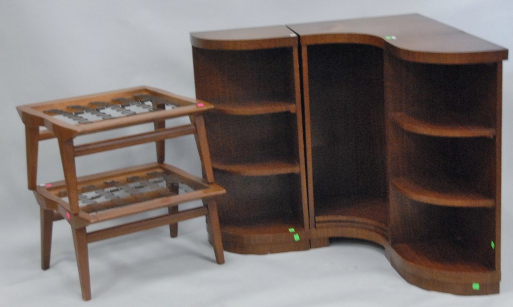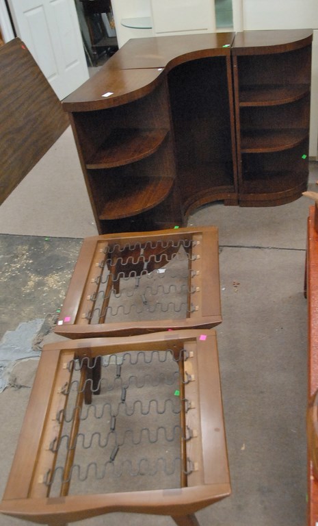 Mid-Century pair of footstools and three part corner bookcase.