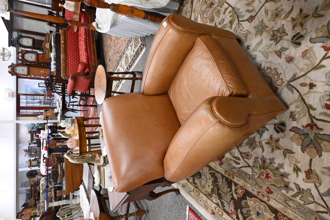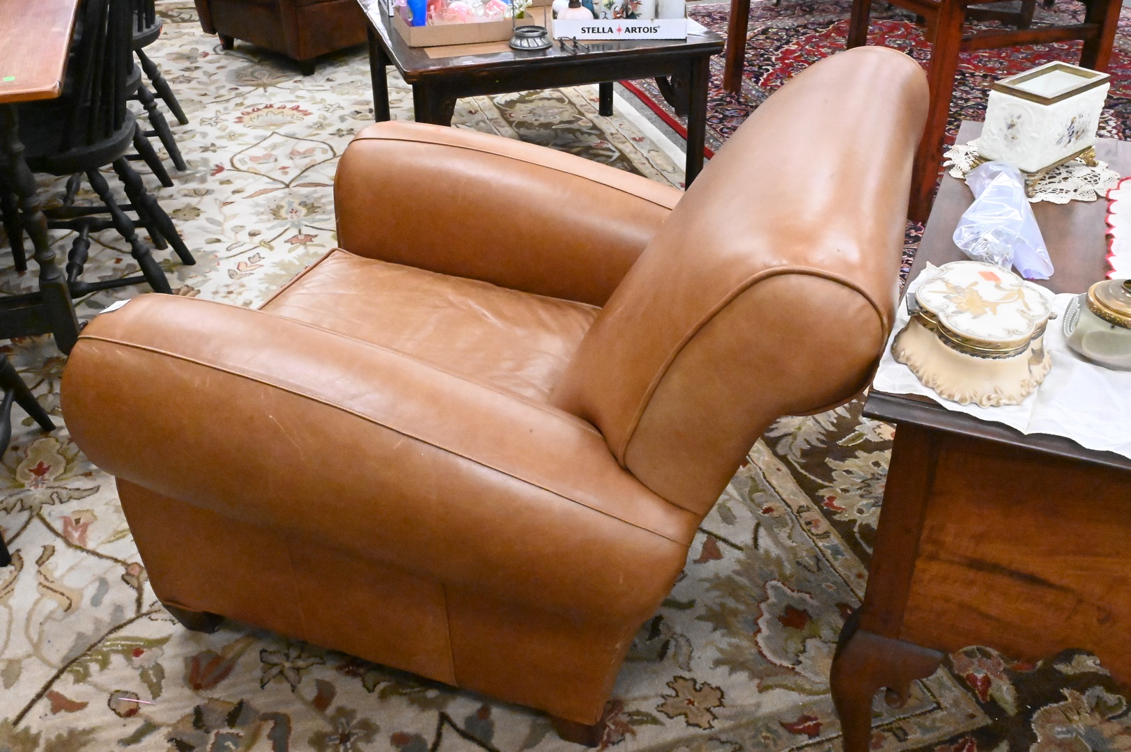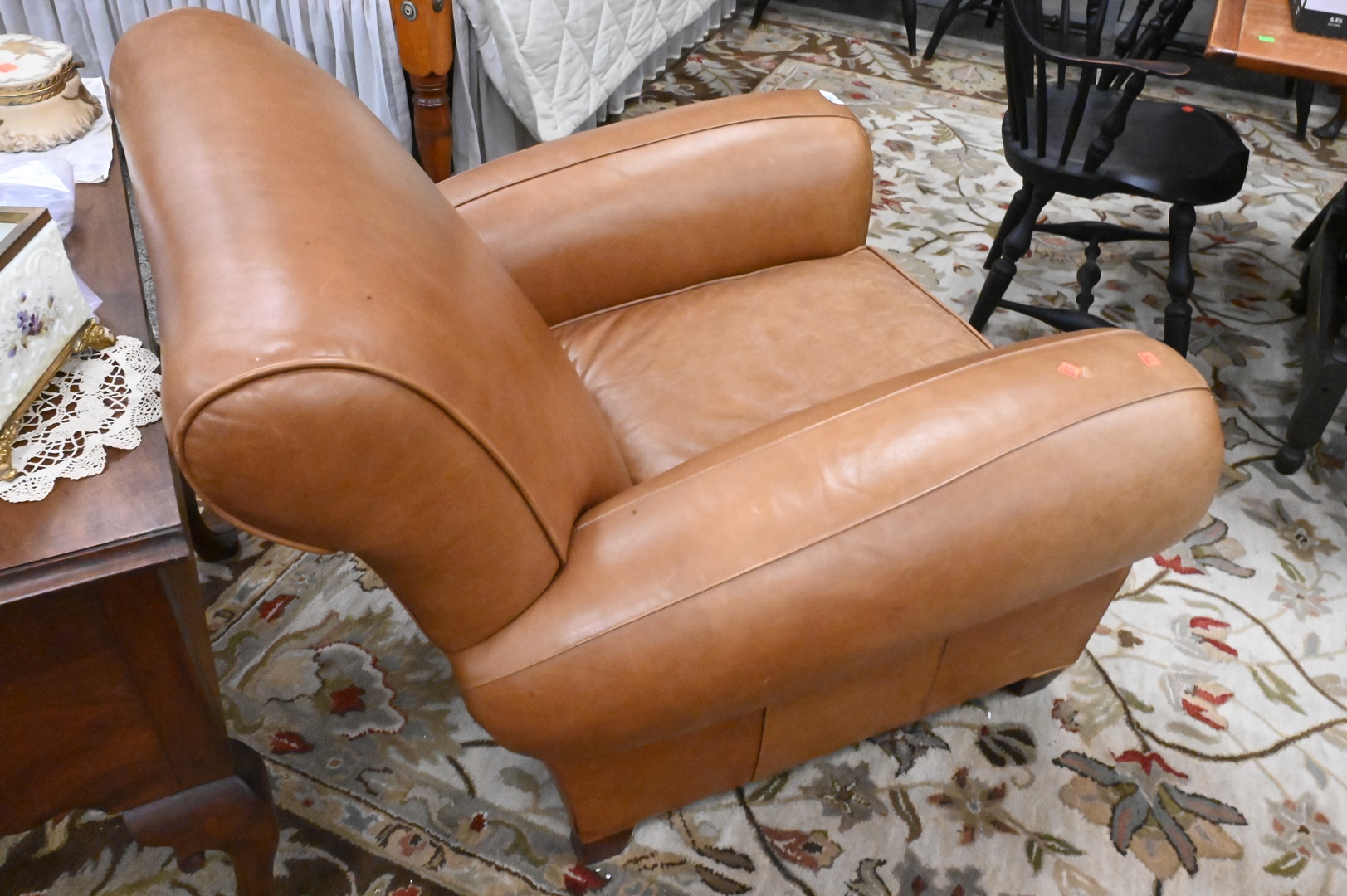 Mitchell Leather Upholstered Early Chair, gold/light brown, height 34 inches, width 36 inches.