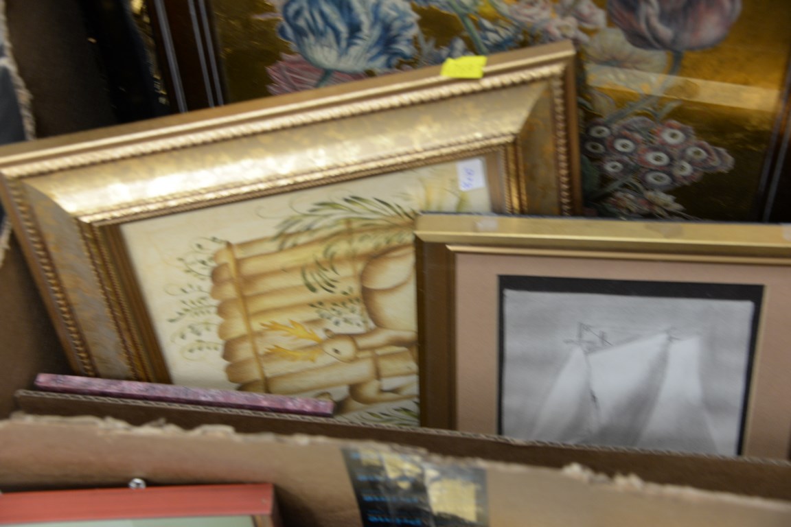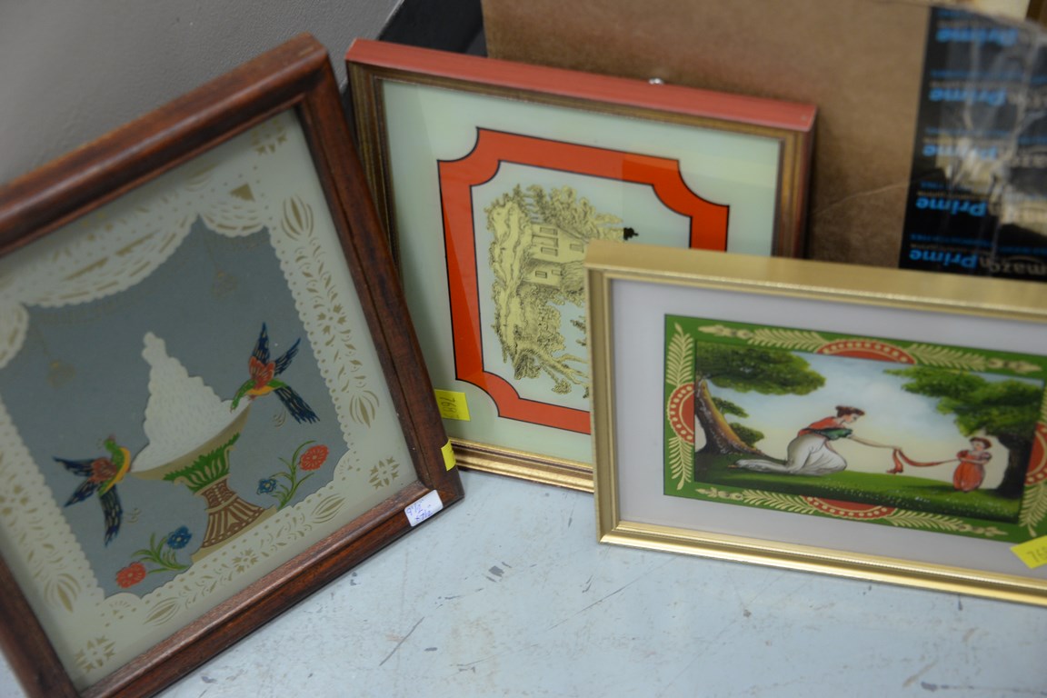 Lot 361: Nine framed pieces including four reverse paintings on glass, one painting on vellum, two drawings, and two prints.
