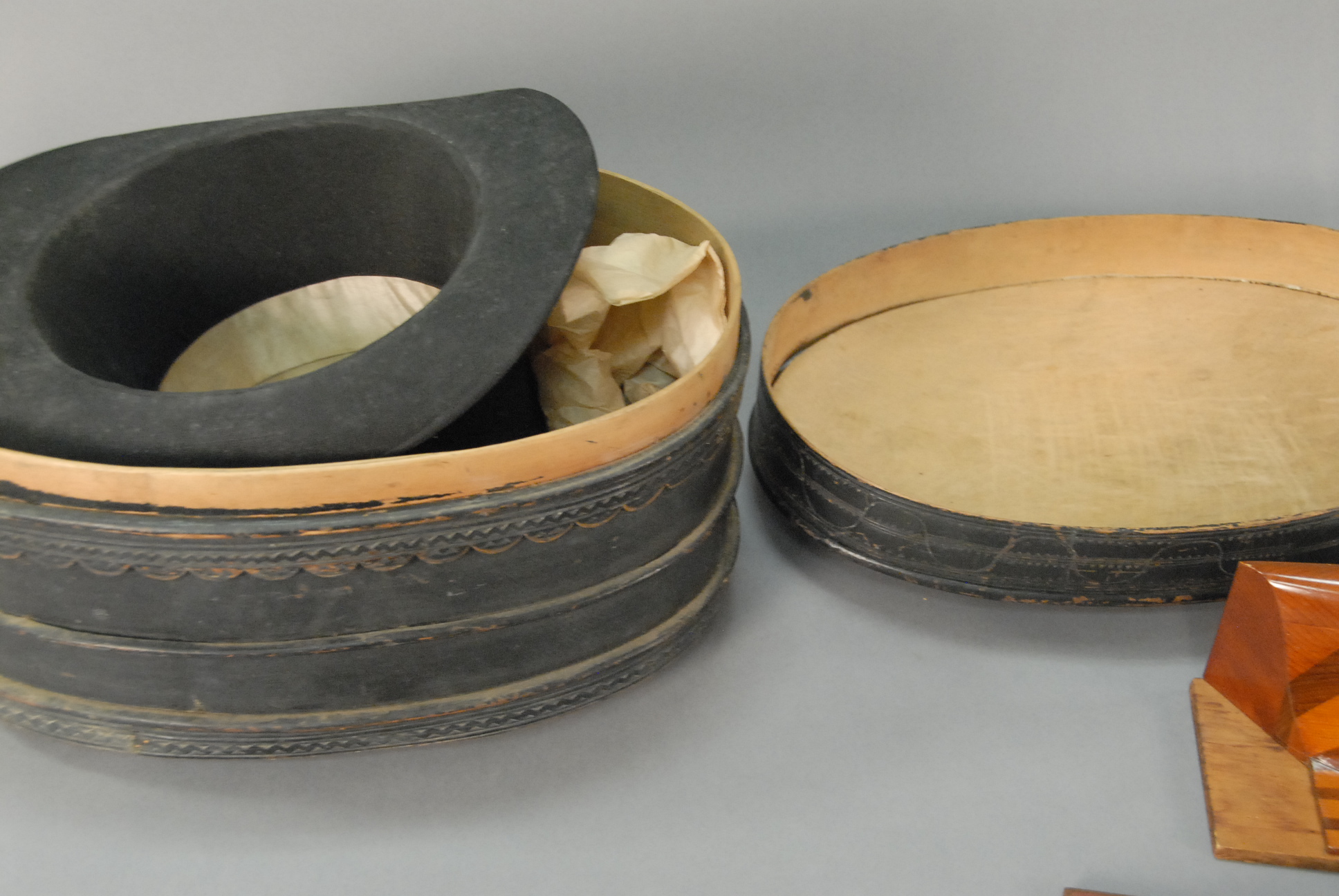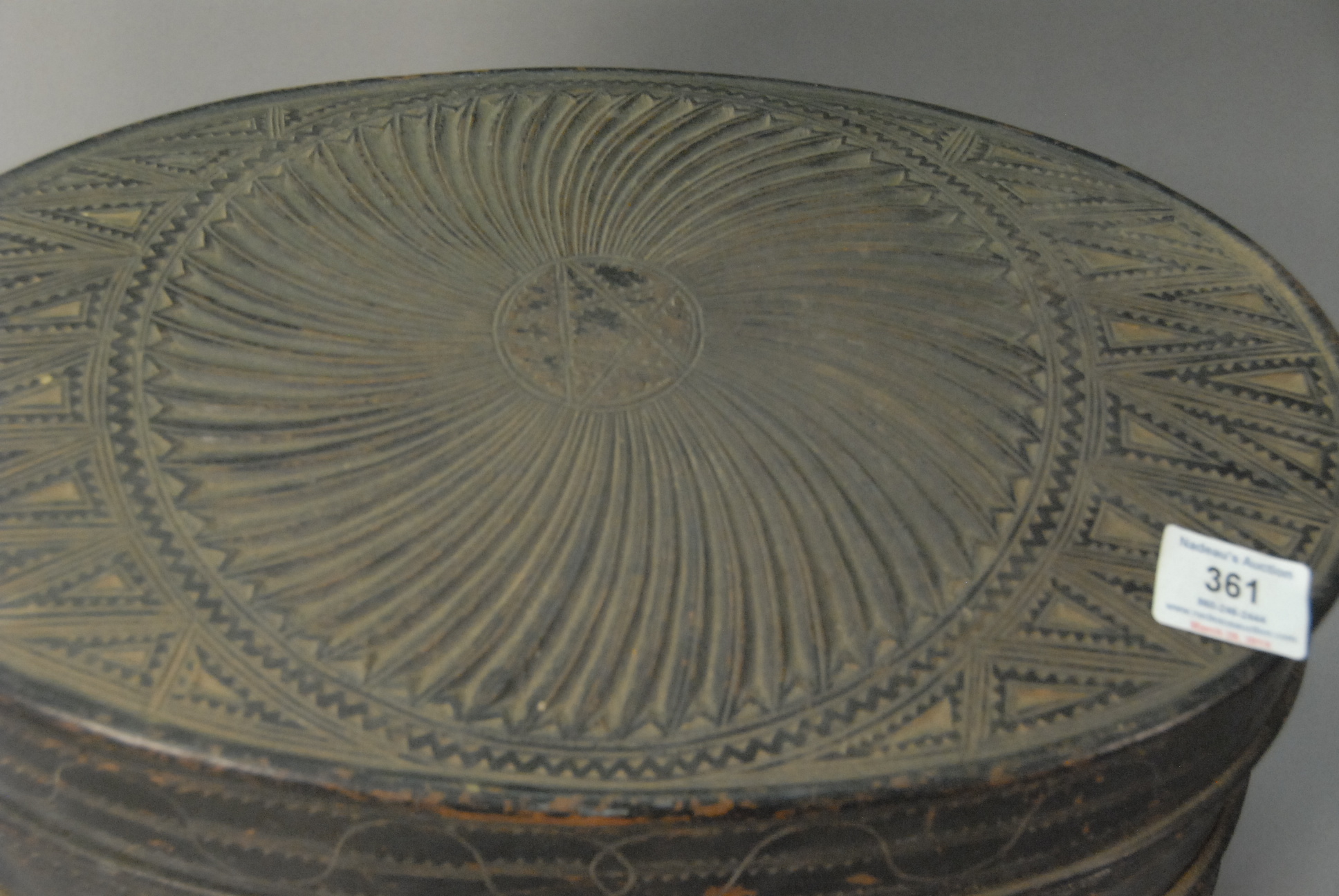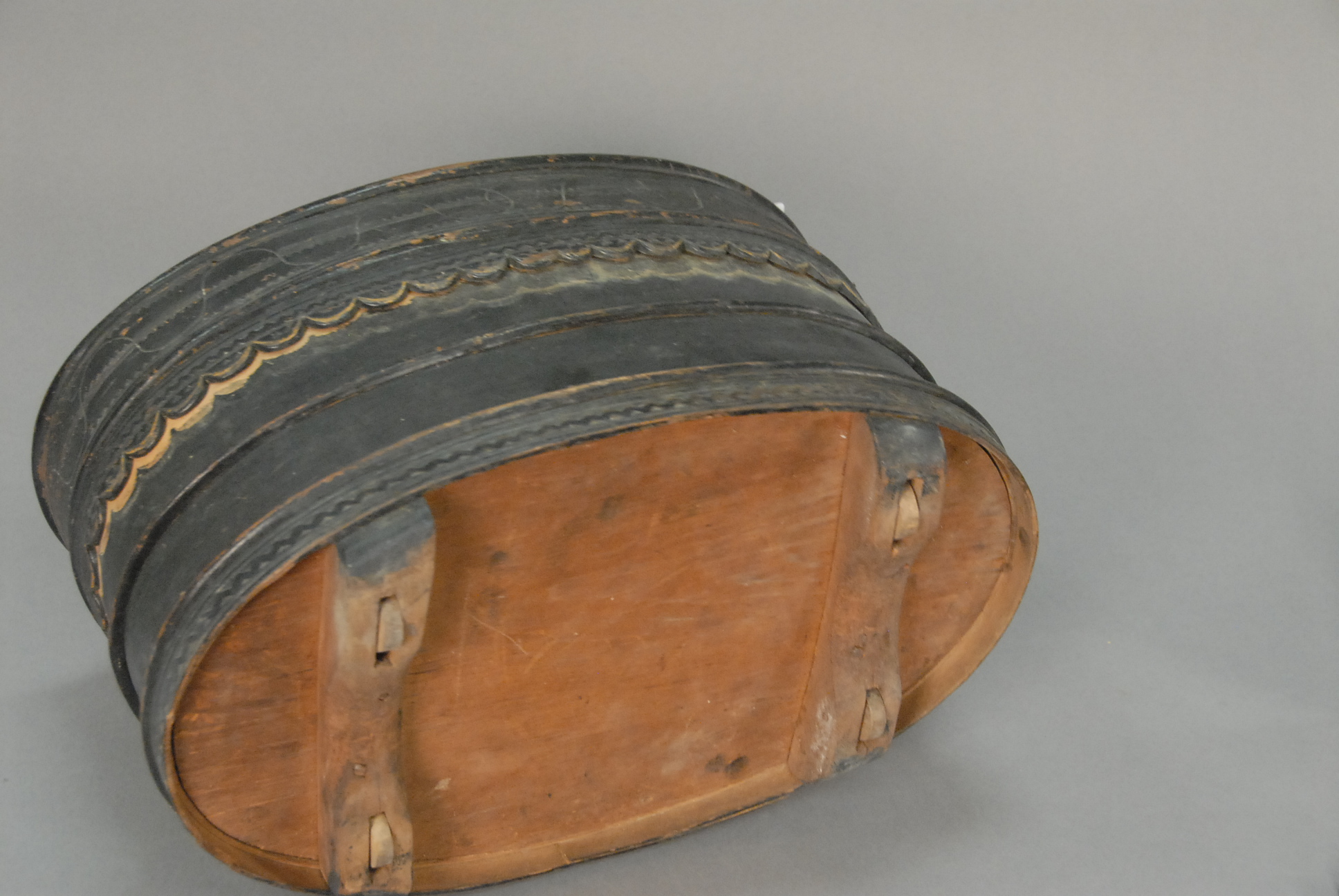 Lot 361: Oval carved wood box with cover and small wood wheels on bottom in old paint. ht. 10in. 9 3/4 x 15 1/2