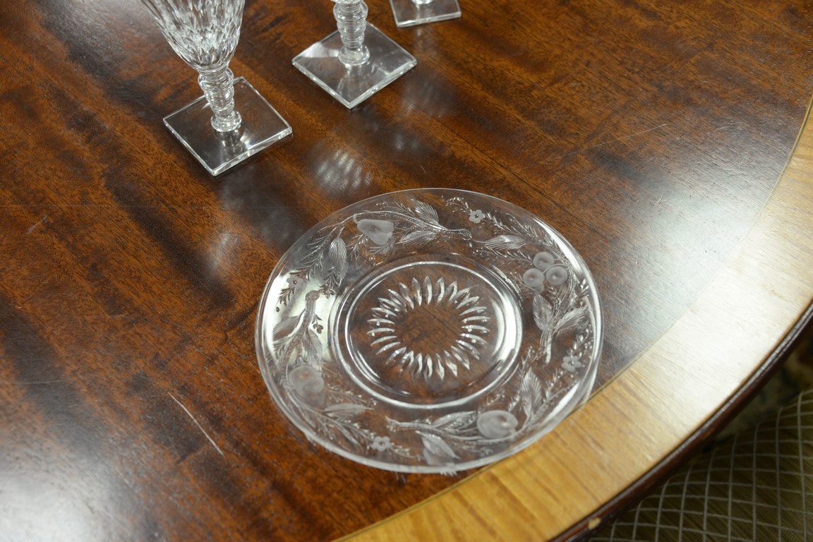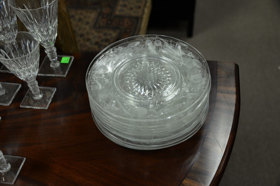 Lot 361: Set of fifteen Hawkes crystal luncheon plates etched with fruit, apple, pear, cherries, and peaches and scrolling flowers and leaves…