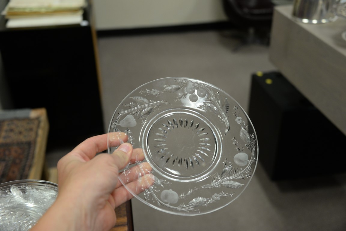 Set of fifteen Hawkes crystal luncheon plates etched with fruit, apple, pear, cherries, and peaches and scrolling flowers and leaves, marked on base: Hawkes. dia. 8 1/4in.