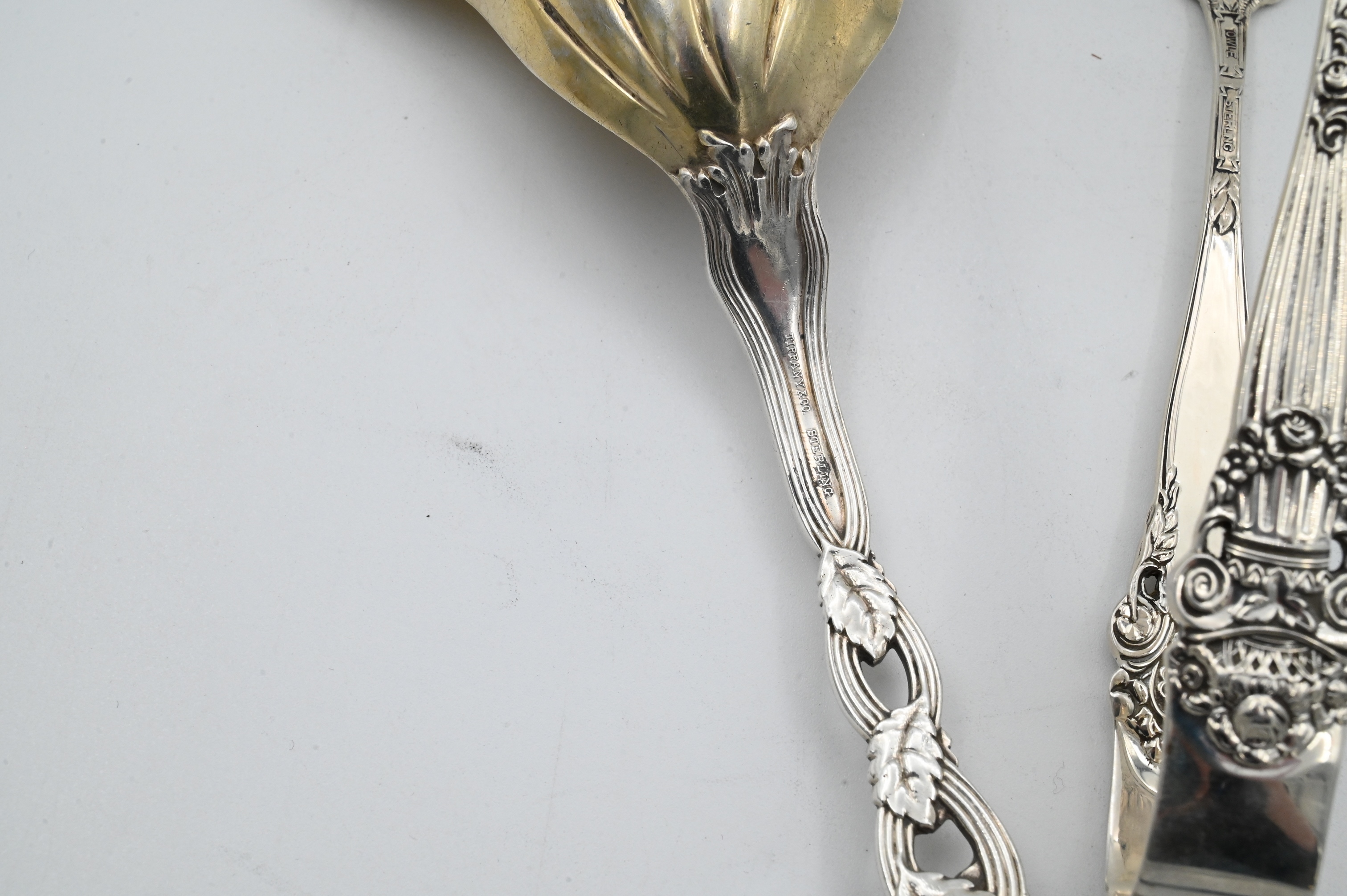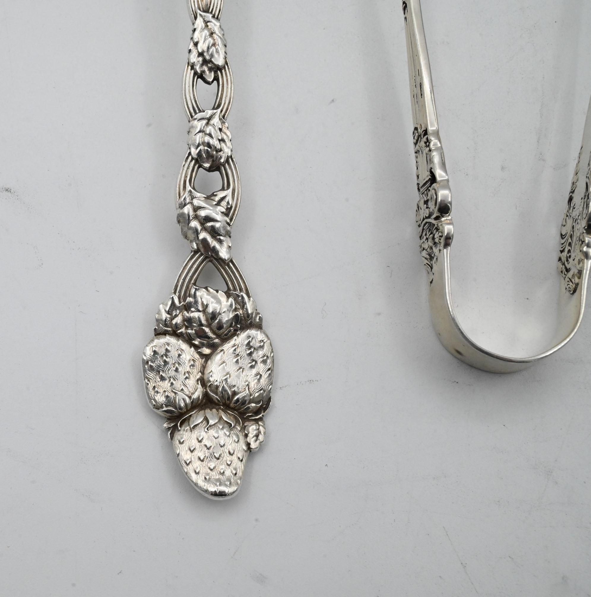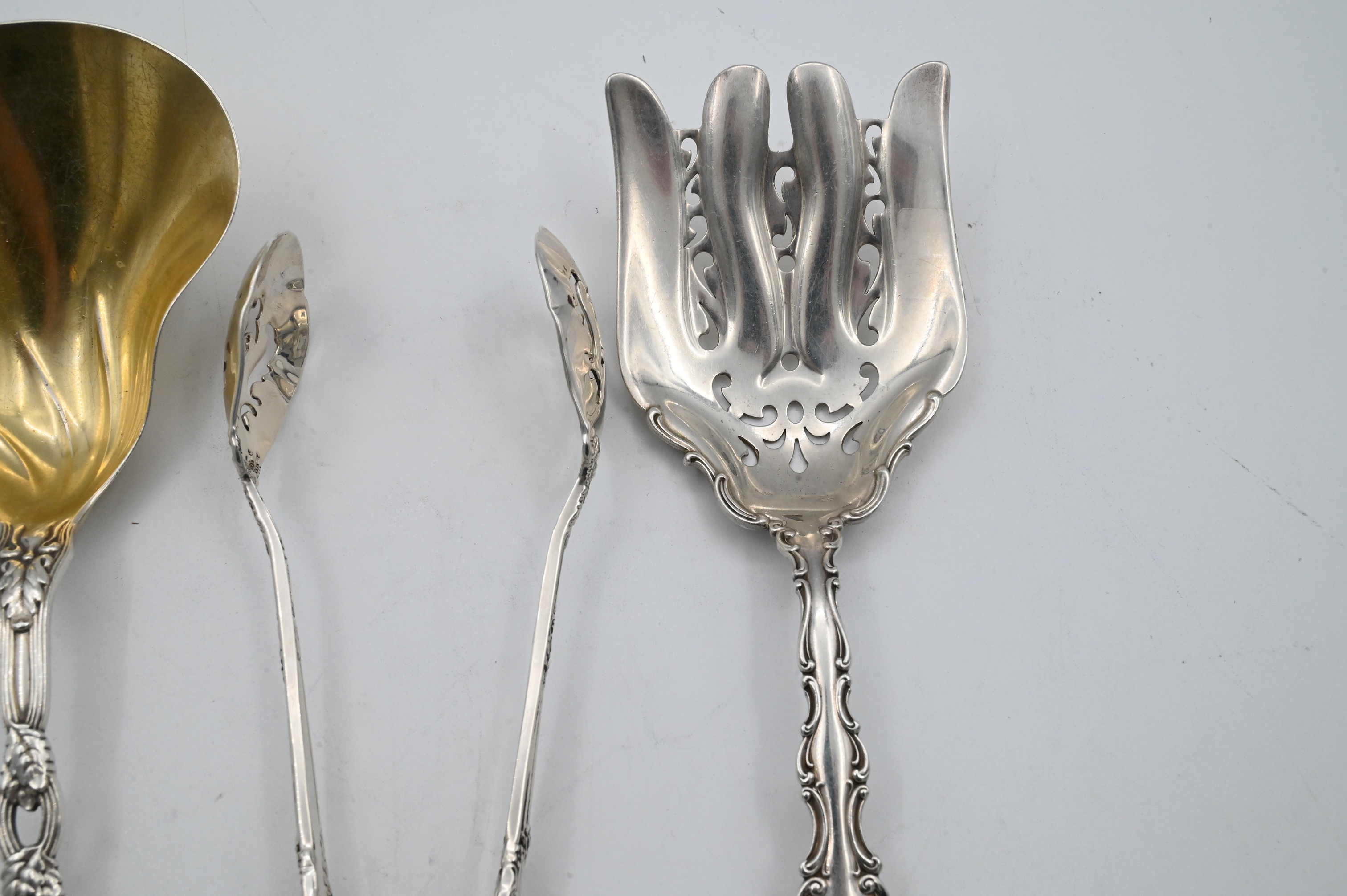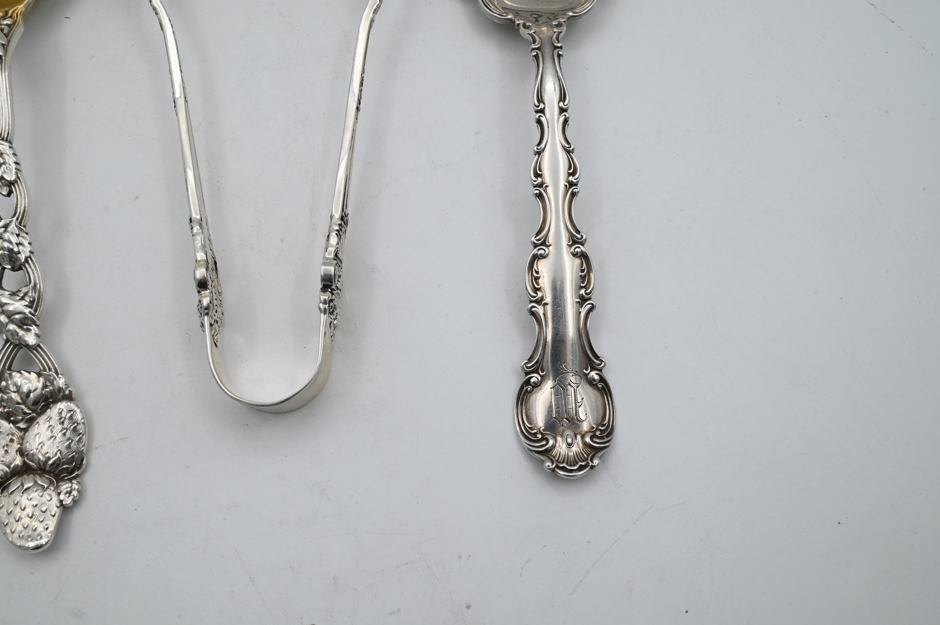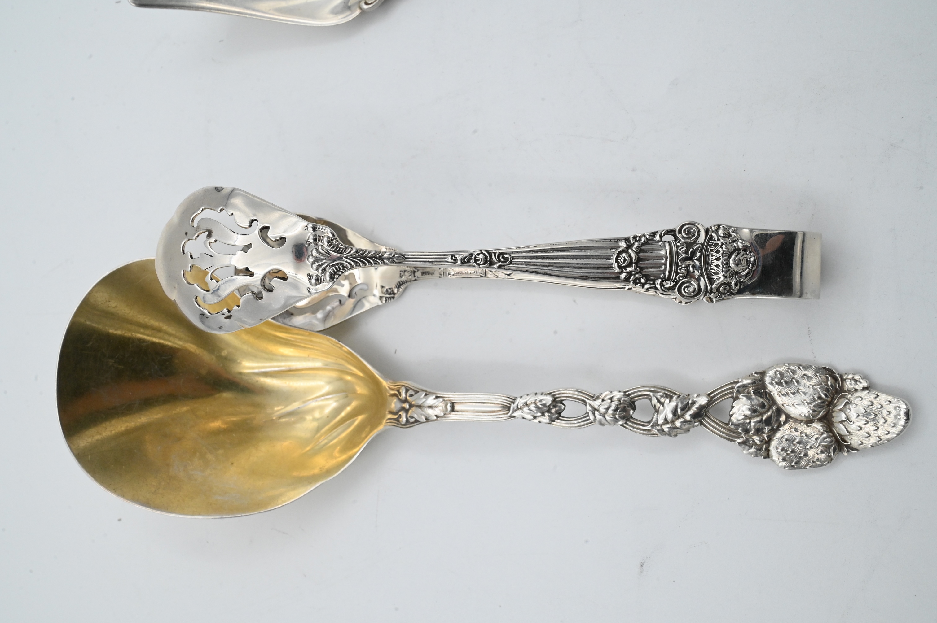 to include one Gorham lox fork in Stratham pattern, towle tongs, along with Tiffany and Company Strawberry pattern casserole spoon