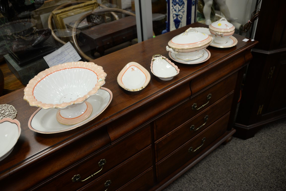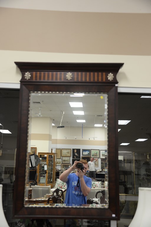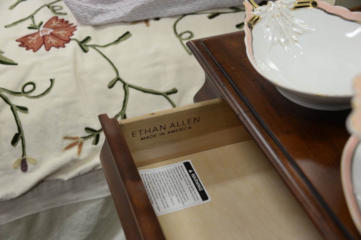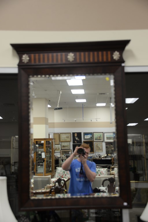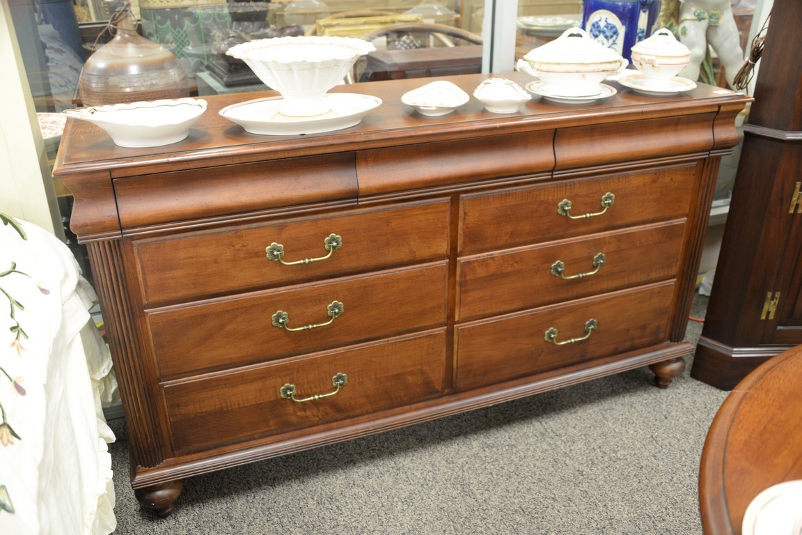 Lot 361: Two piece lot including an Ethan Allen triple chest and a mirror. chest: ht. 36in., top: 19 x 63, mirror: 51 x 37