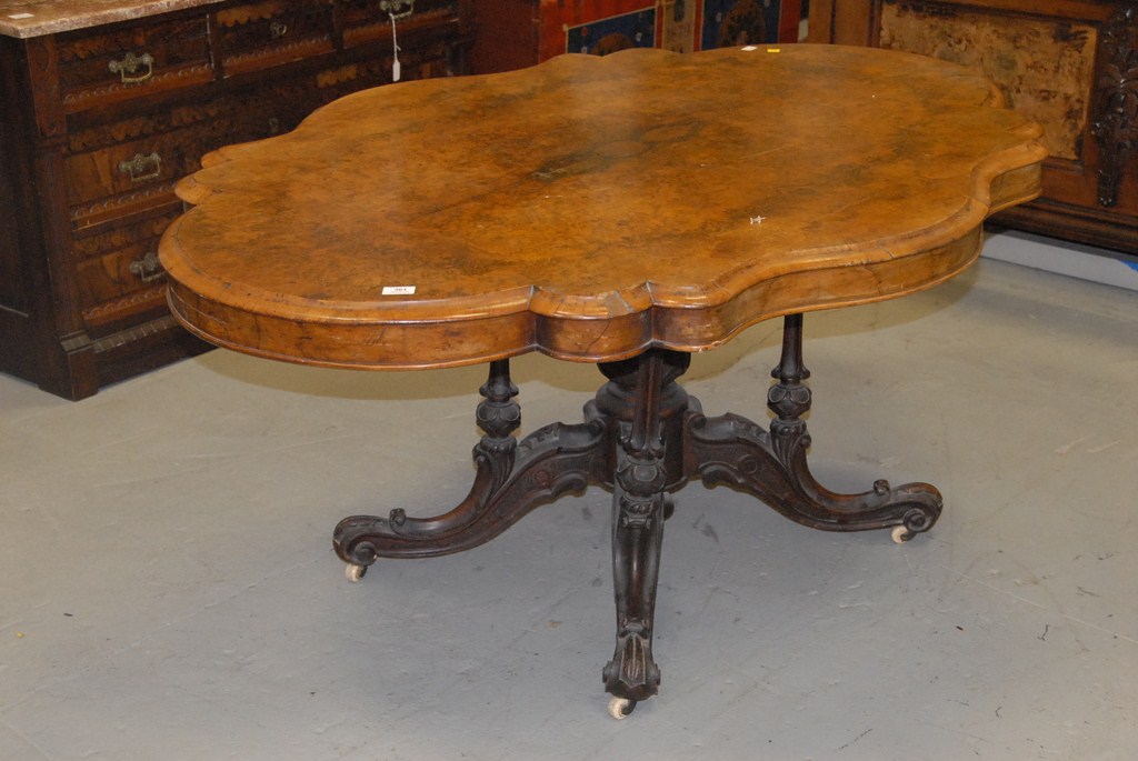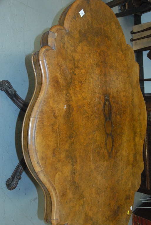 Lot 361: Victorian walnut tip breakfast table, shaped top with burlwood veneer on supported base on four carved downswept legs. top: 60 x 45…