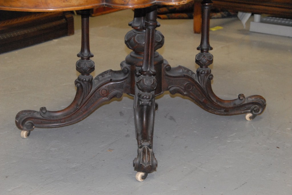 Victorian walnut tip breakfast table, shaped top with burlwood veneer on supported base on four carved downswept legs. top: 60 x 45 1/2