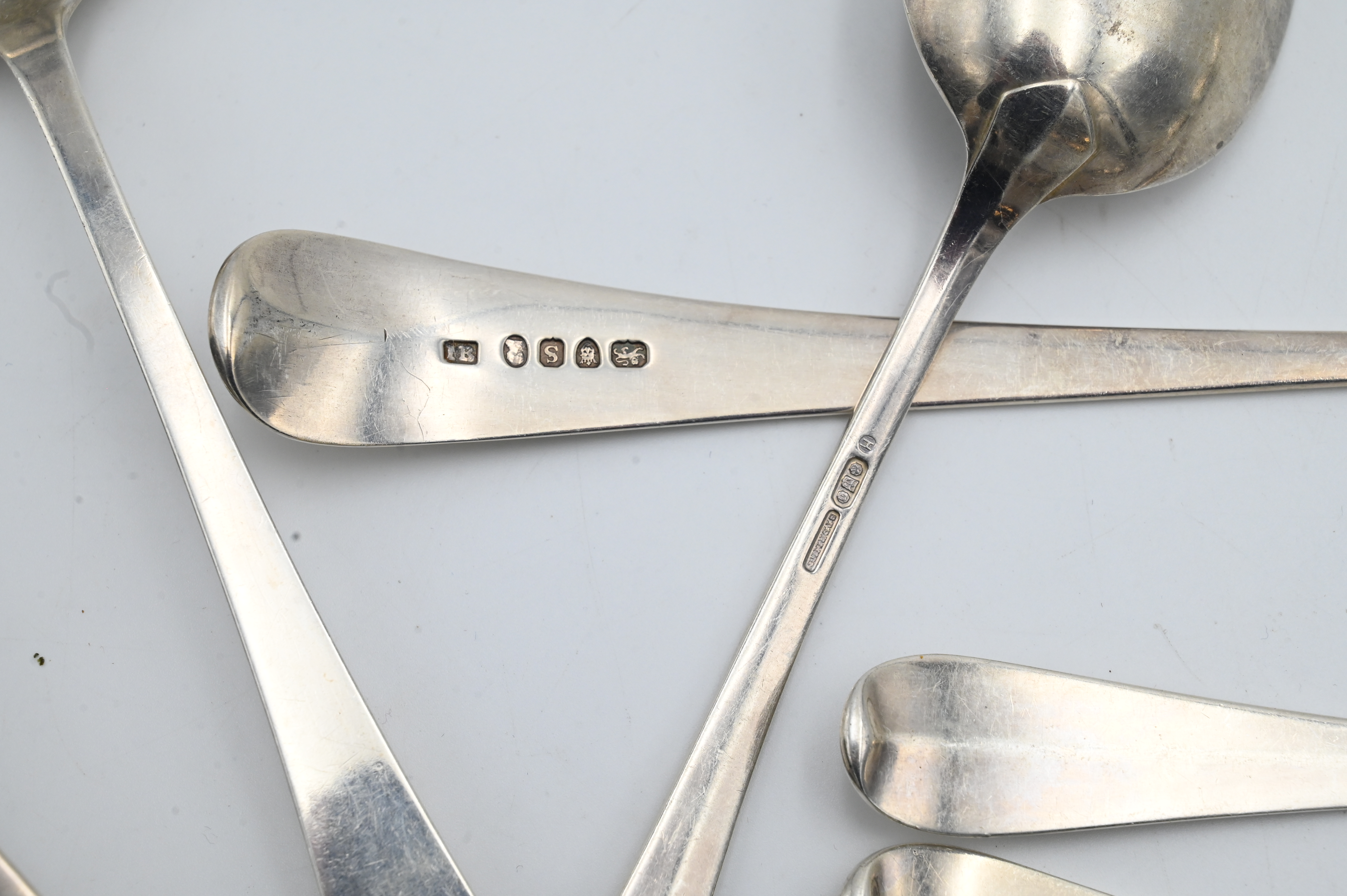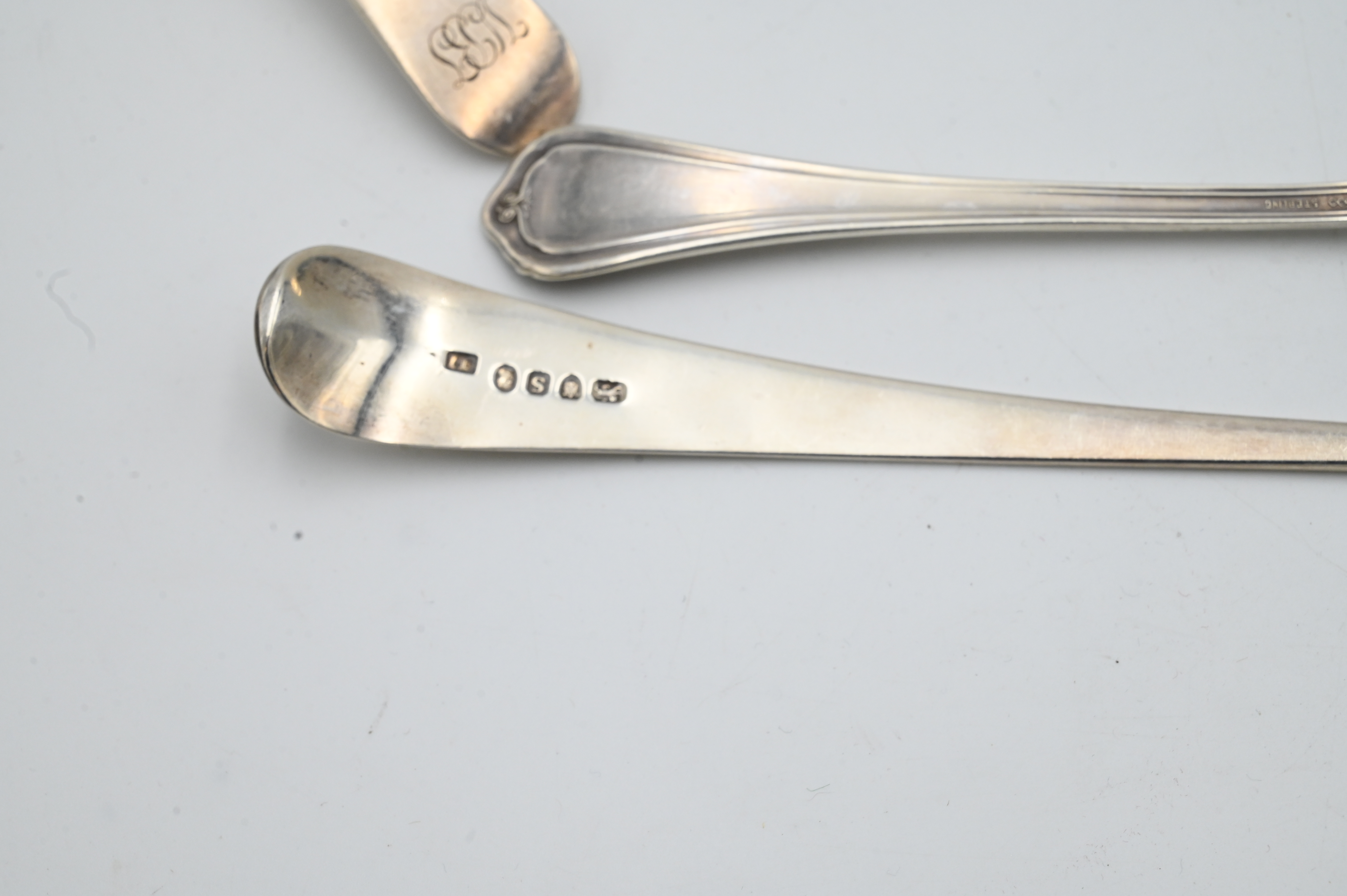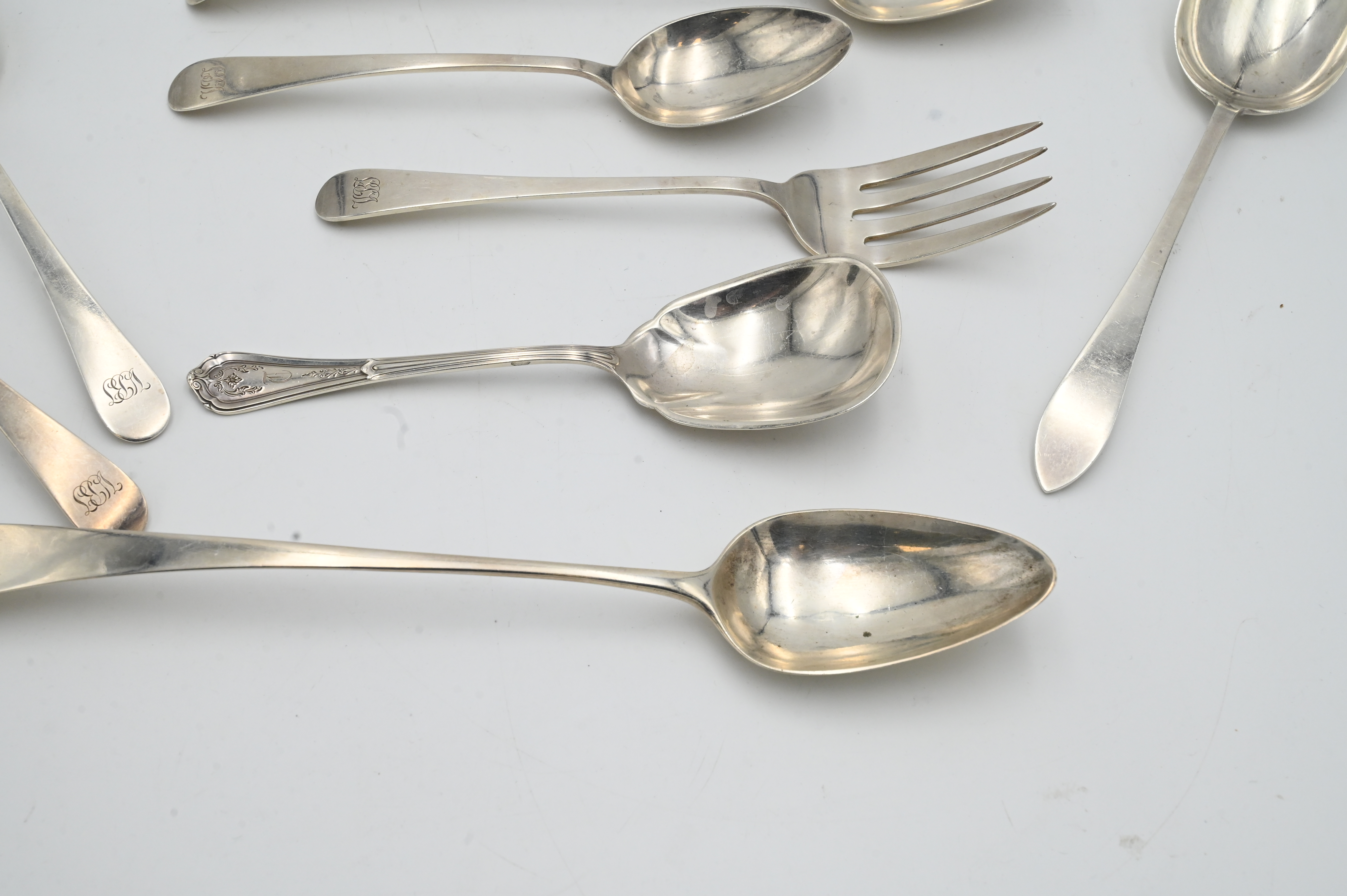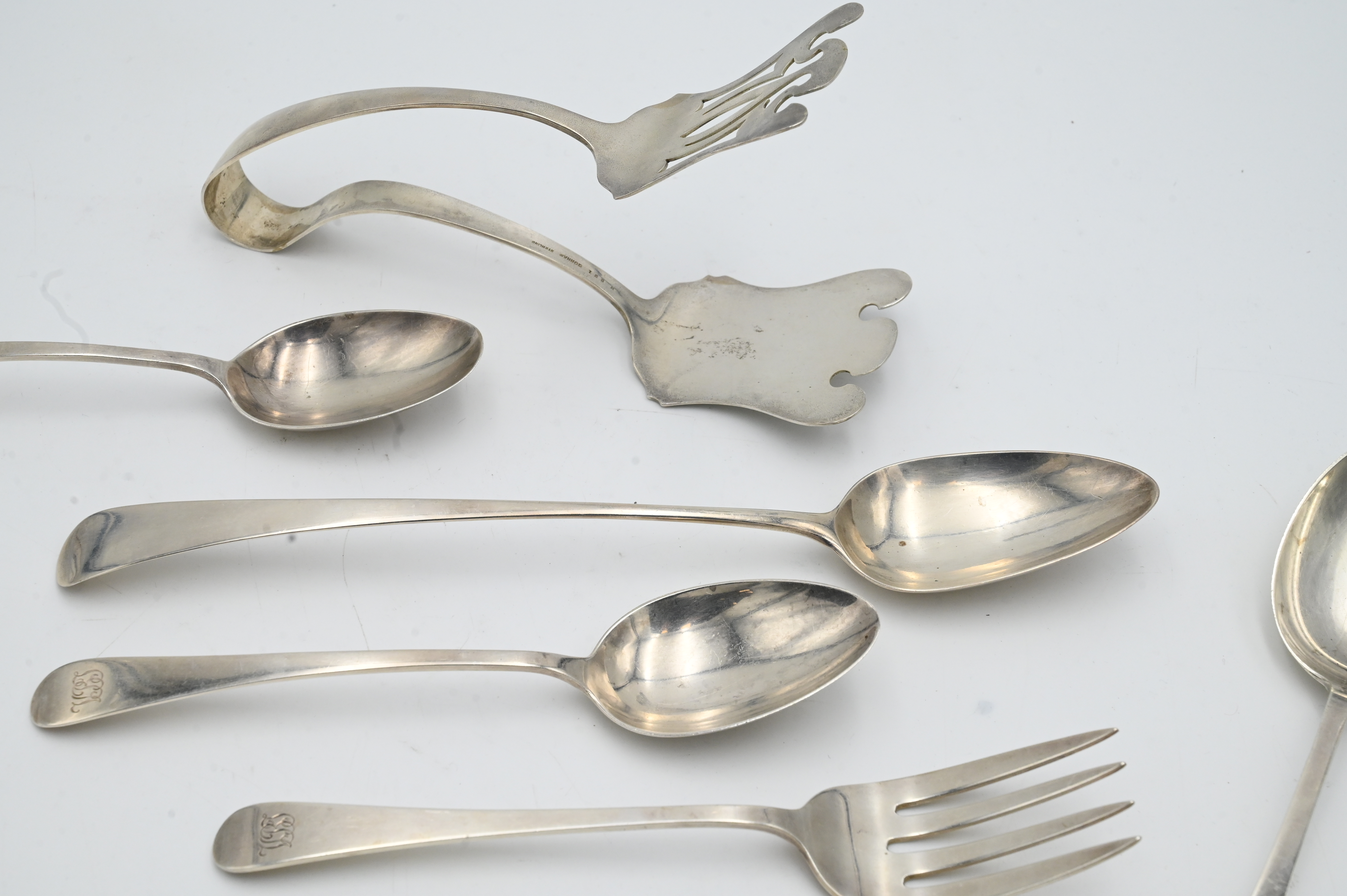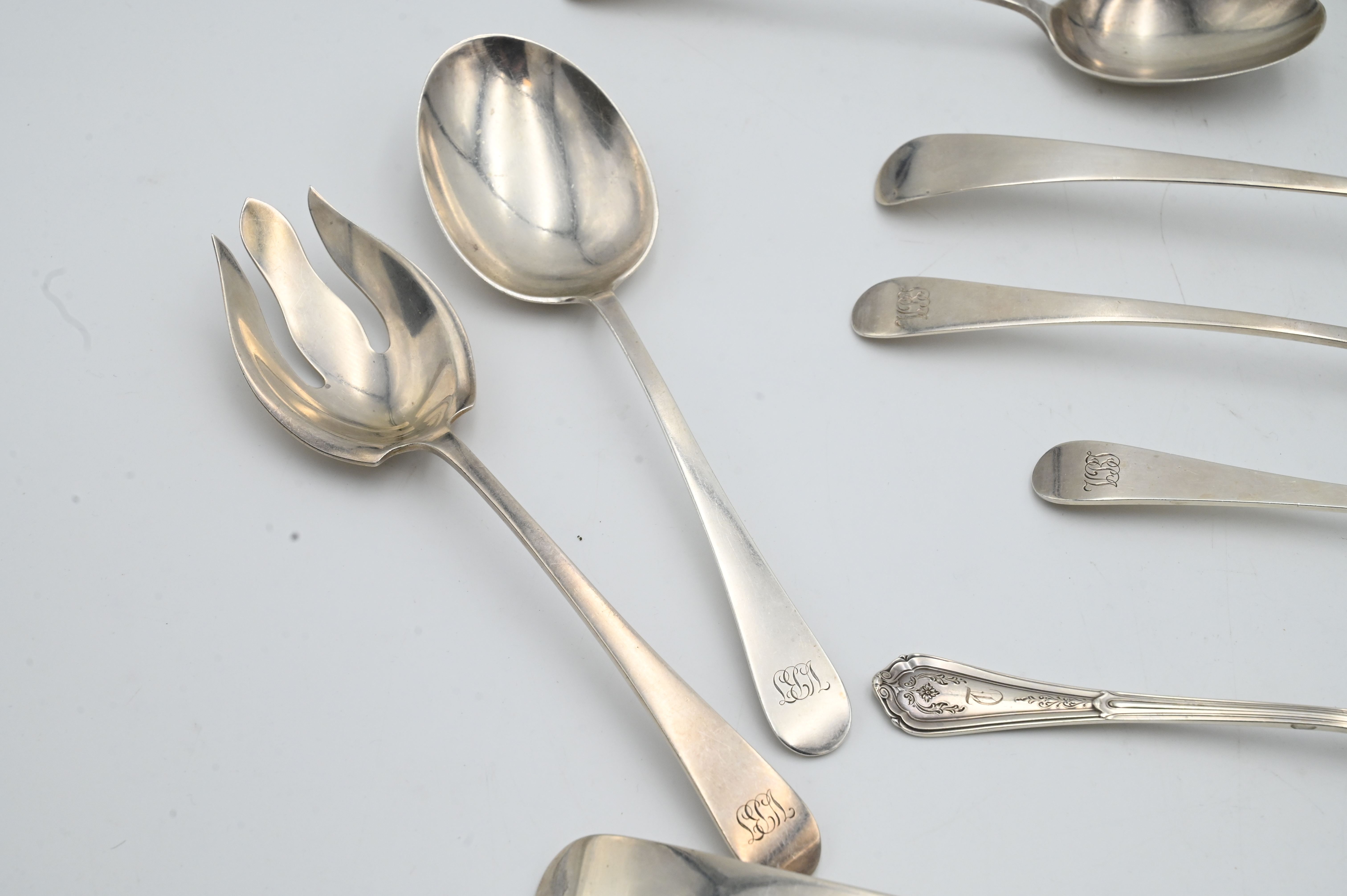 10 Piece Sterling Silver Lot of Serving Utensils, to include 7 spoons, one marked Tiffany; a pair of Gorham tongs; along with 2 forks; tallest 11 1/2 inches, 29.8 t.oz.