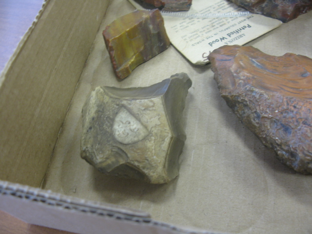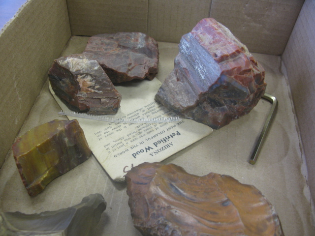 Box lot of petrified wood, 6 pieces including 2 stone carved Primitive tools