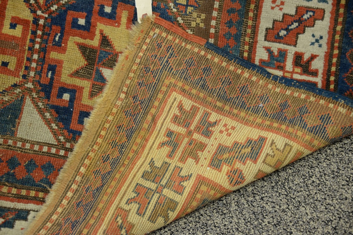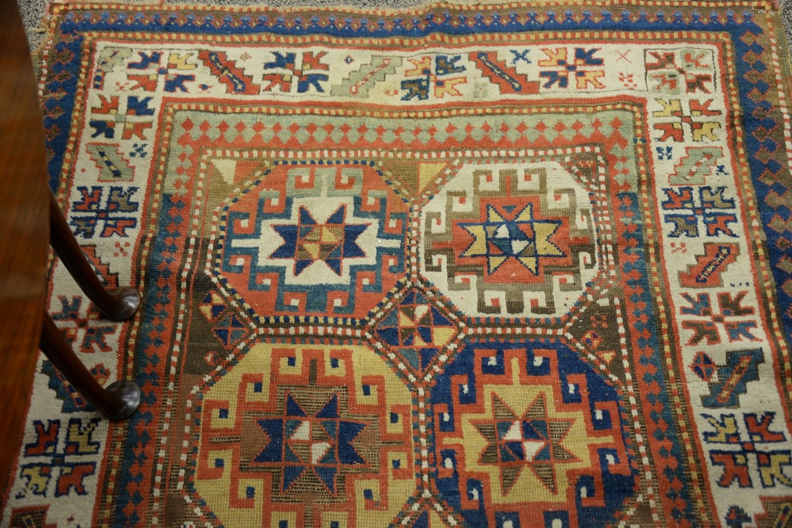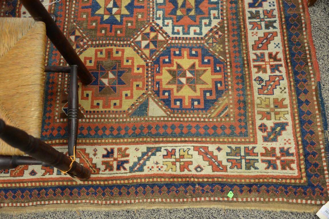 Caucasian Oriental throw rug, late 19th century some wear. 4’3 x 6’7