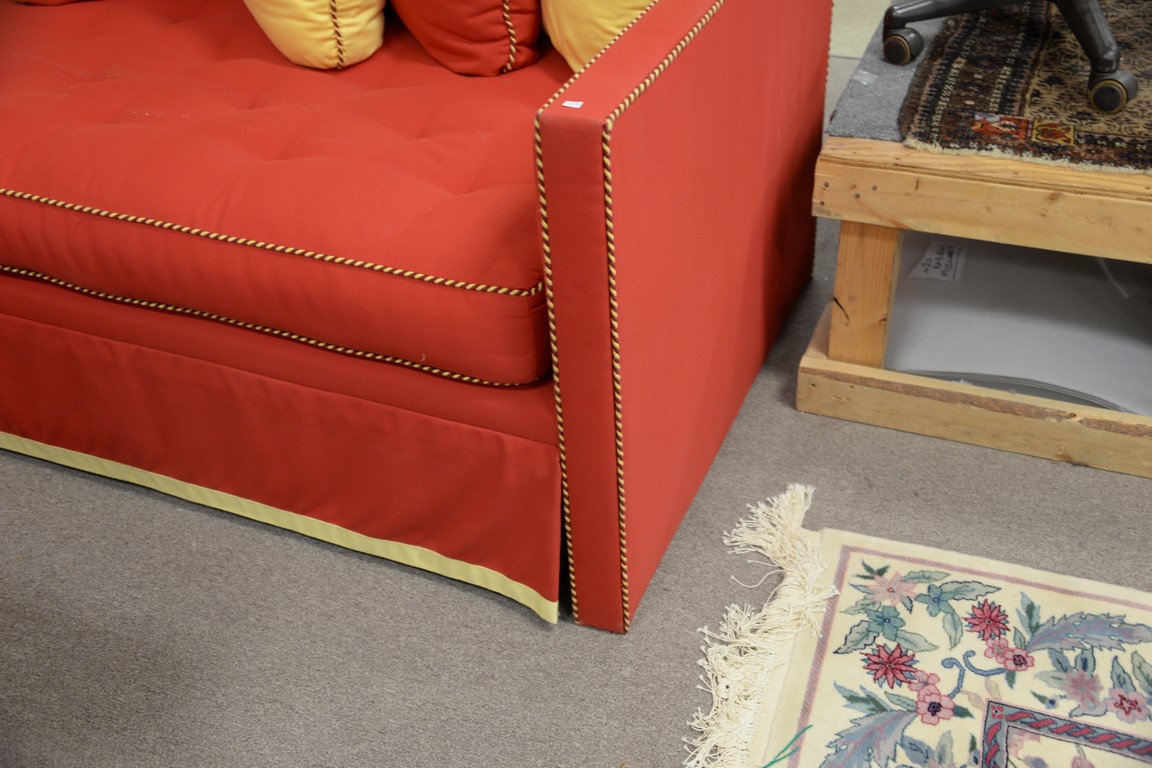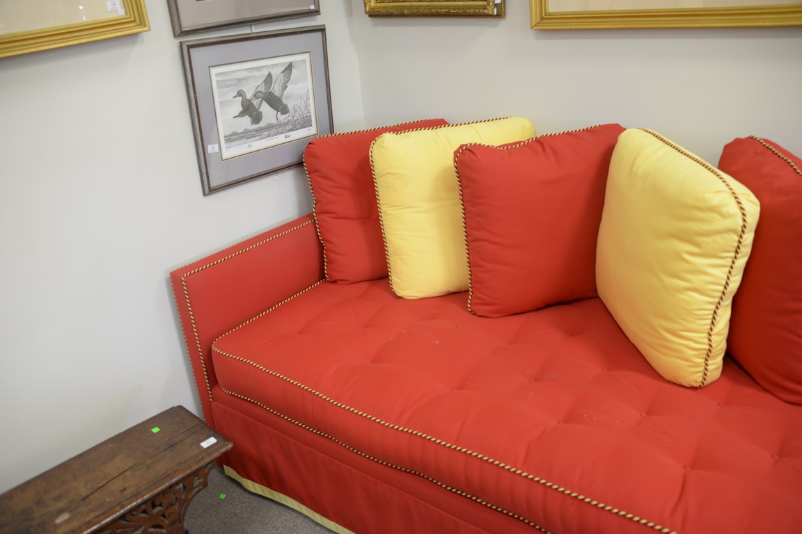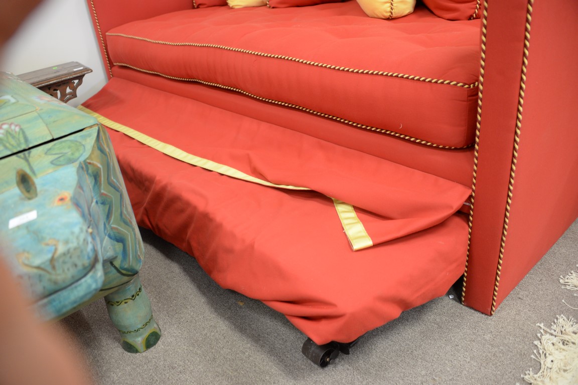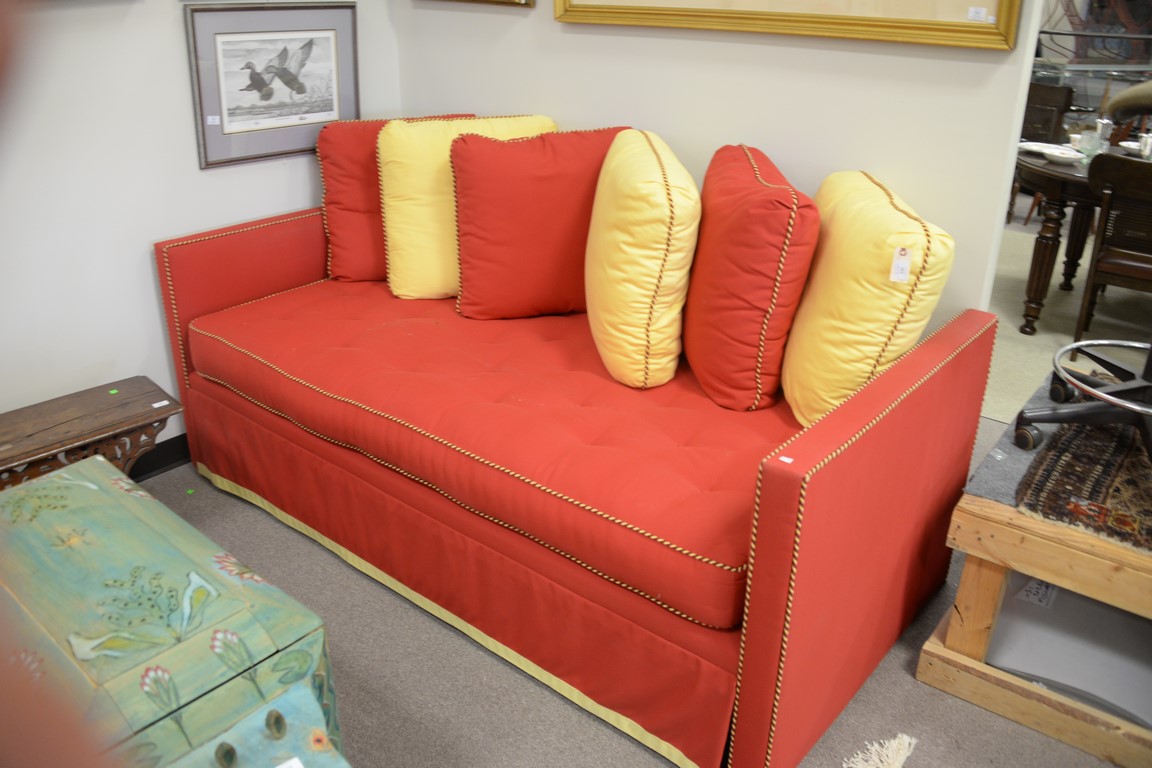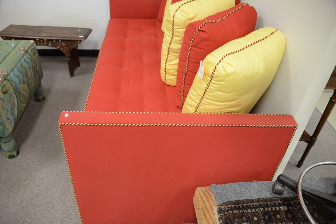 Lot 362: Charles Beckley custom upholstered day or trundle bed with red and yellow blended cotton felt upholstery and throw pillows. lg. 83in.