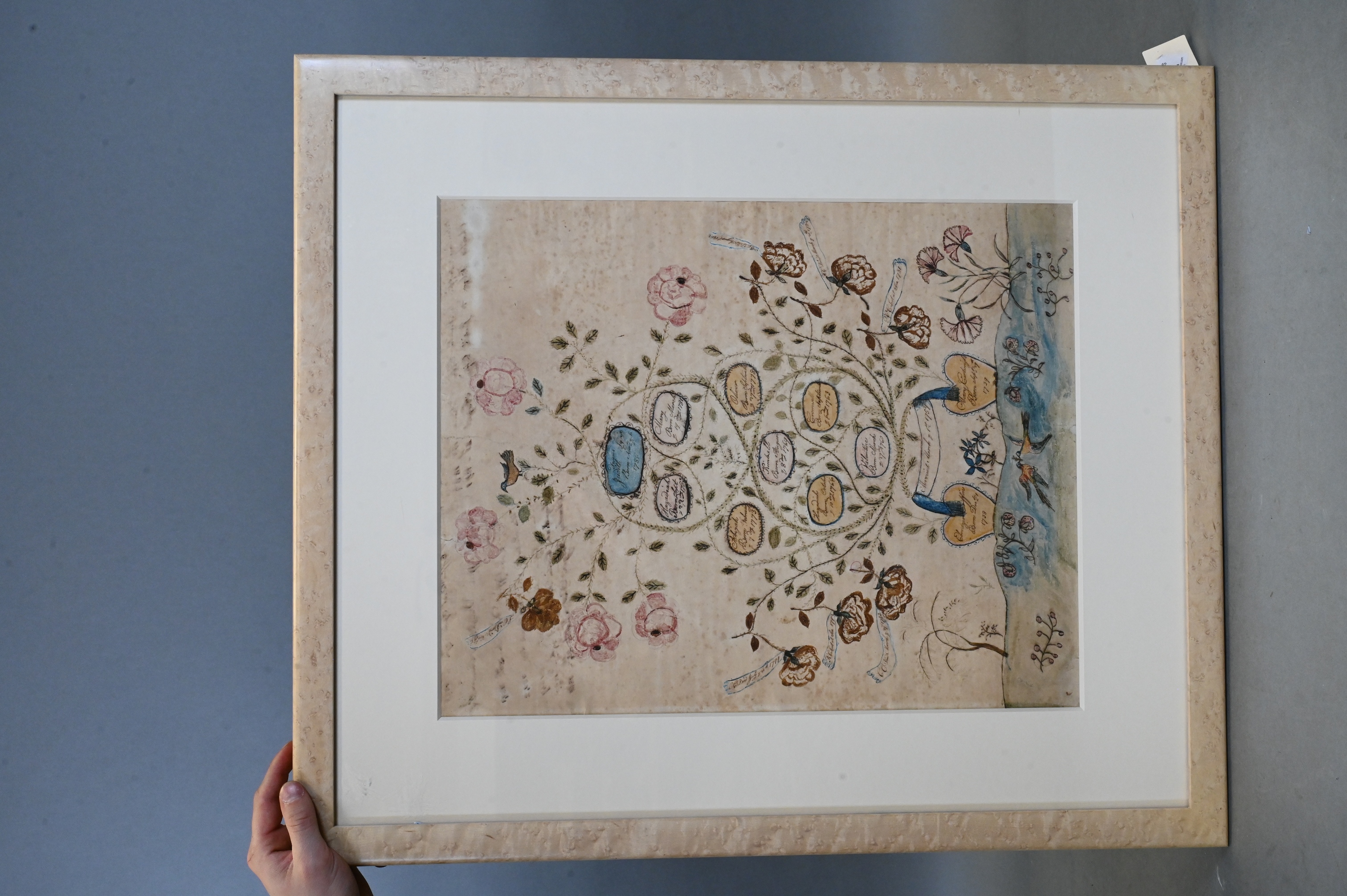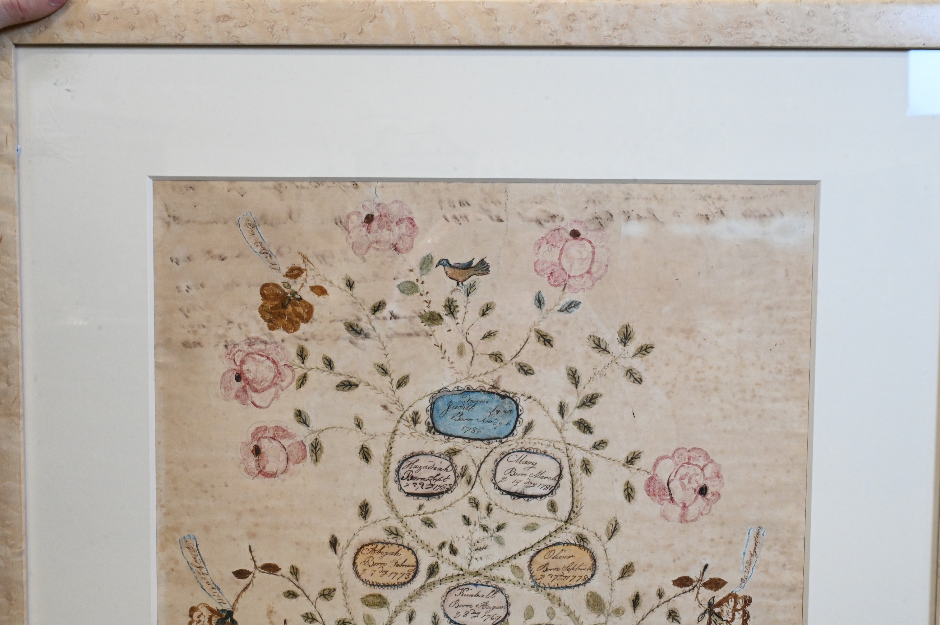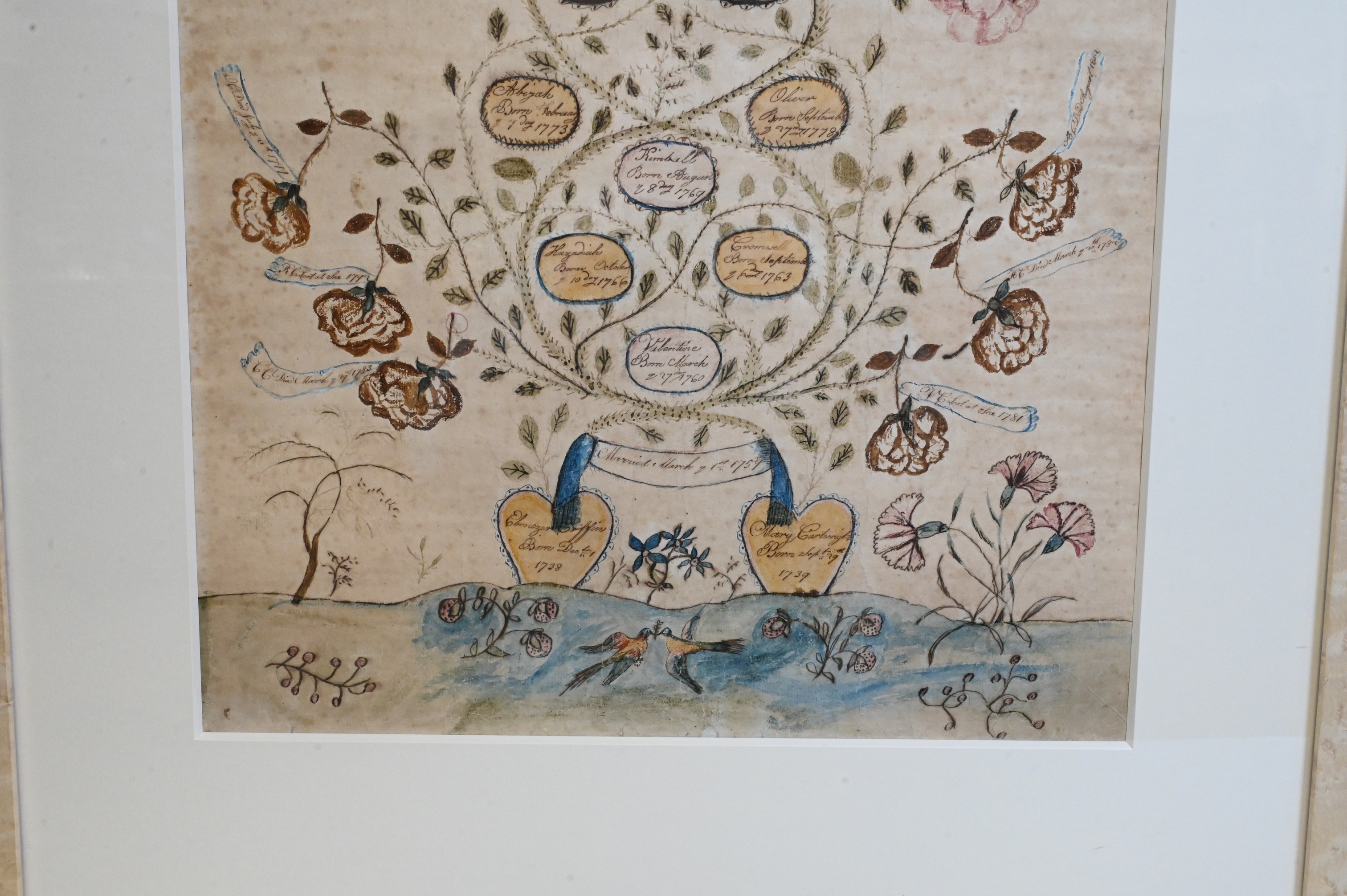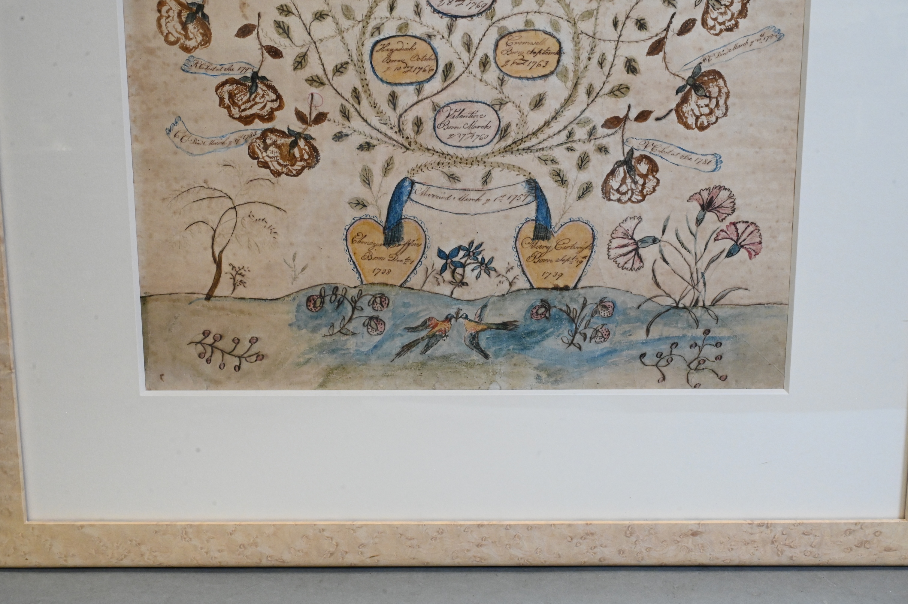 Watercolor and ink on paper depicting a flowering tree emerging from two hearts representing Ebenezer Coffin (1738-1819) and wife Mary Cartwright (1739-1819) with the names and birth dates of their children amongst the vines (possibly painted as a sampler by their youngest daughter Judith) along with original frame