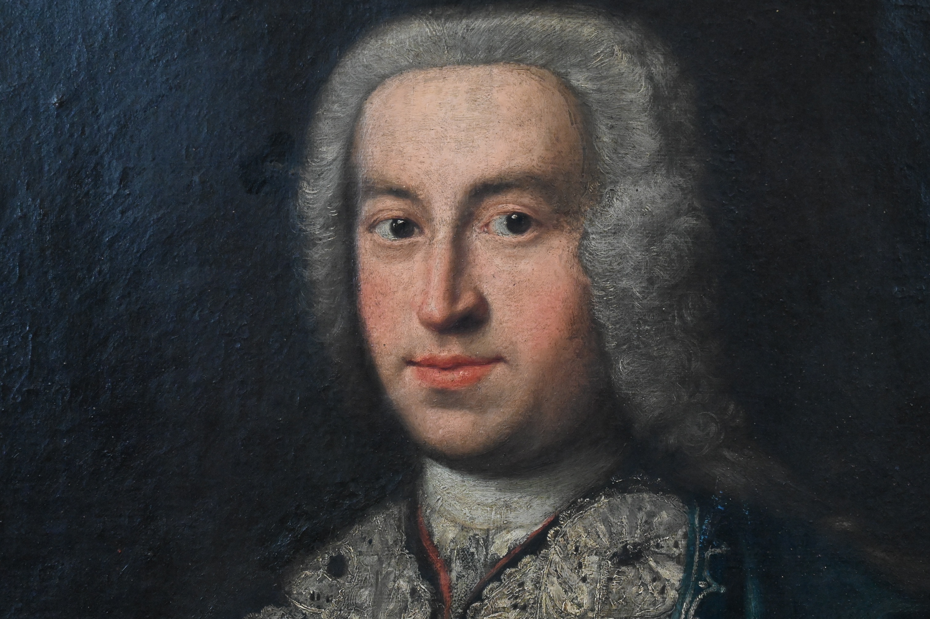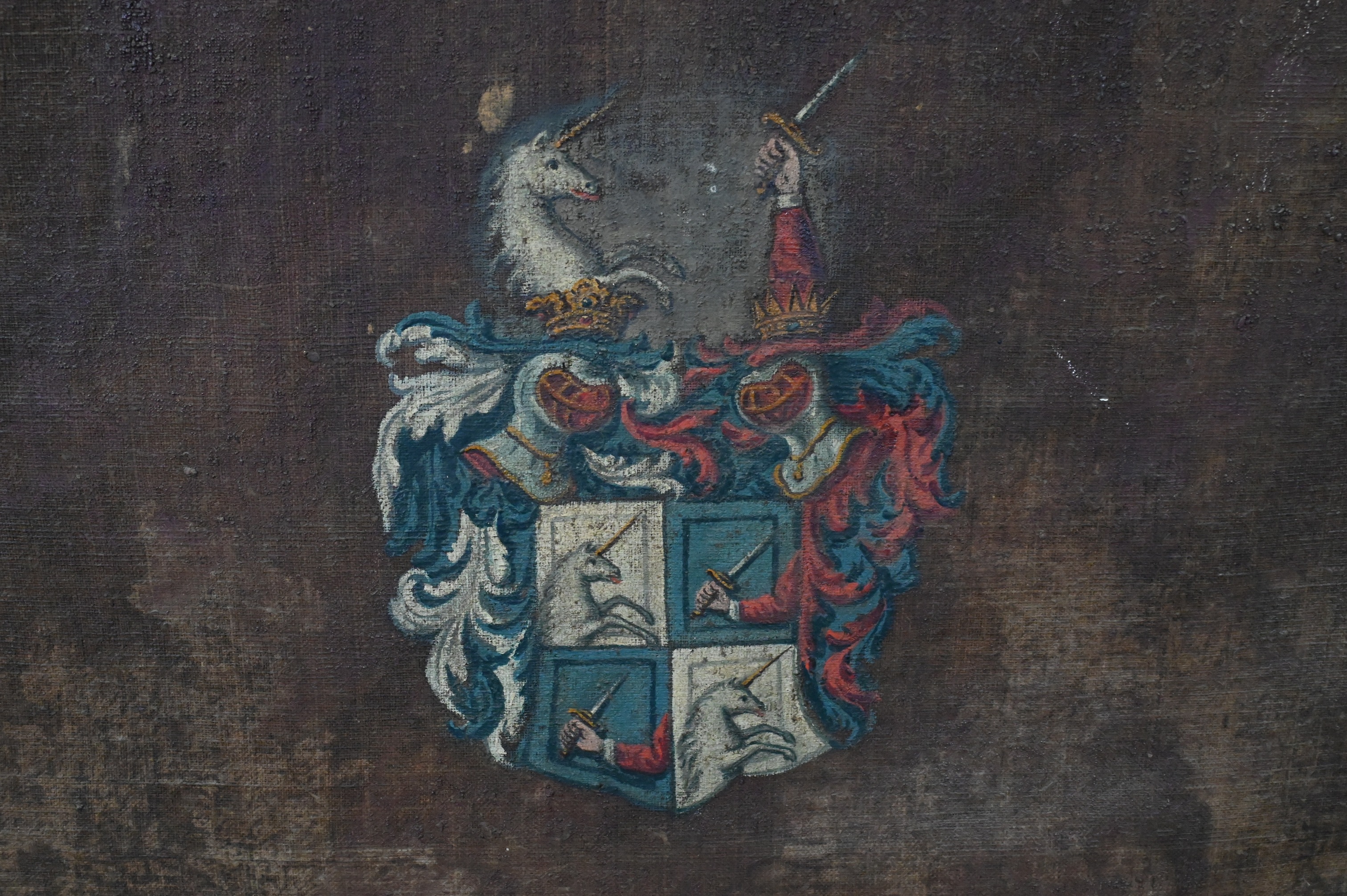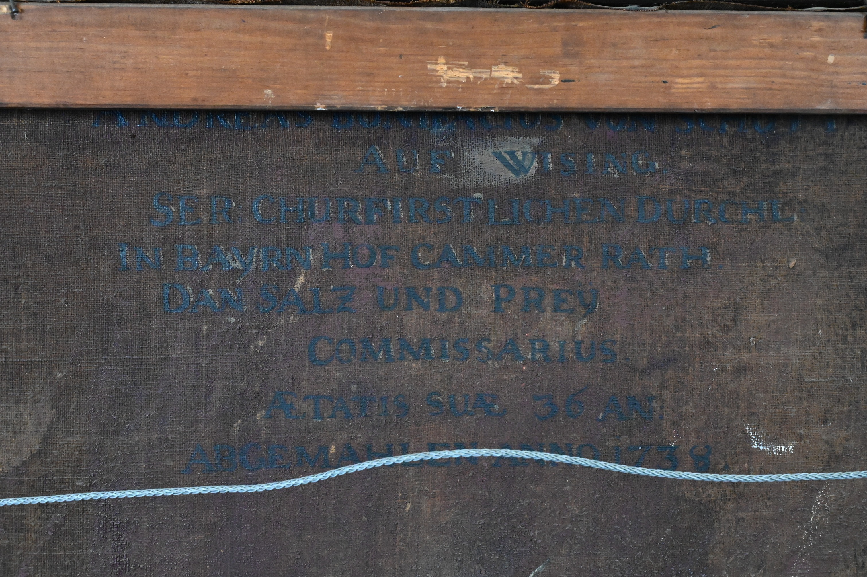 bust-length portrait of a gentleman wearing a powdered wig and richly embroidered velvet coat, shown with one hand tucked at his waist, the sitter identified on verso with an inscription as a Hofkammer Rat (Court Chamber Councilor) and Commissarius for salt and provisions under the Elector of Bavaria, portrayed at the age of 36 and painted in the year 1738, verso also bears a painted family coat of arms with unicorn crest