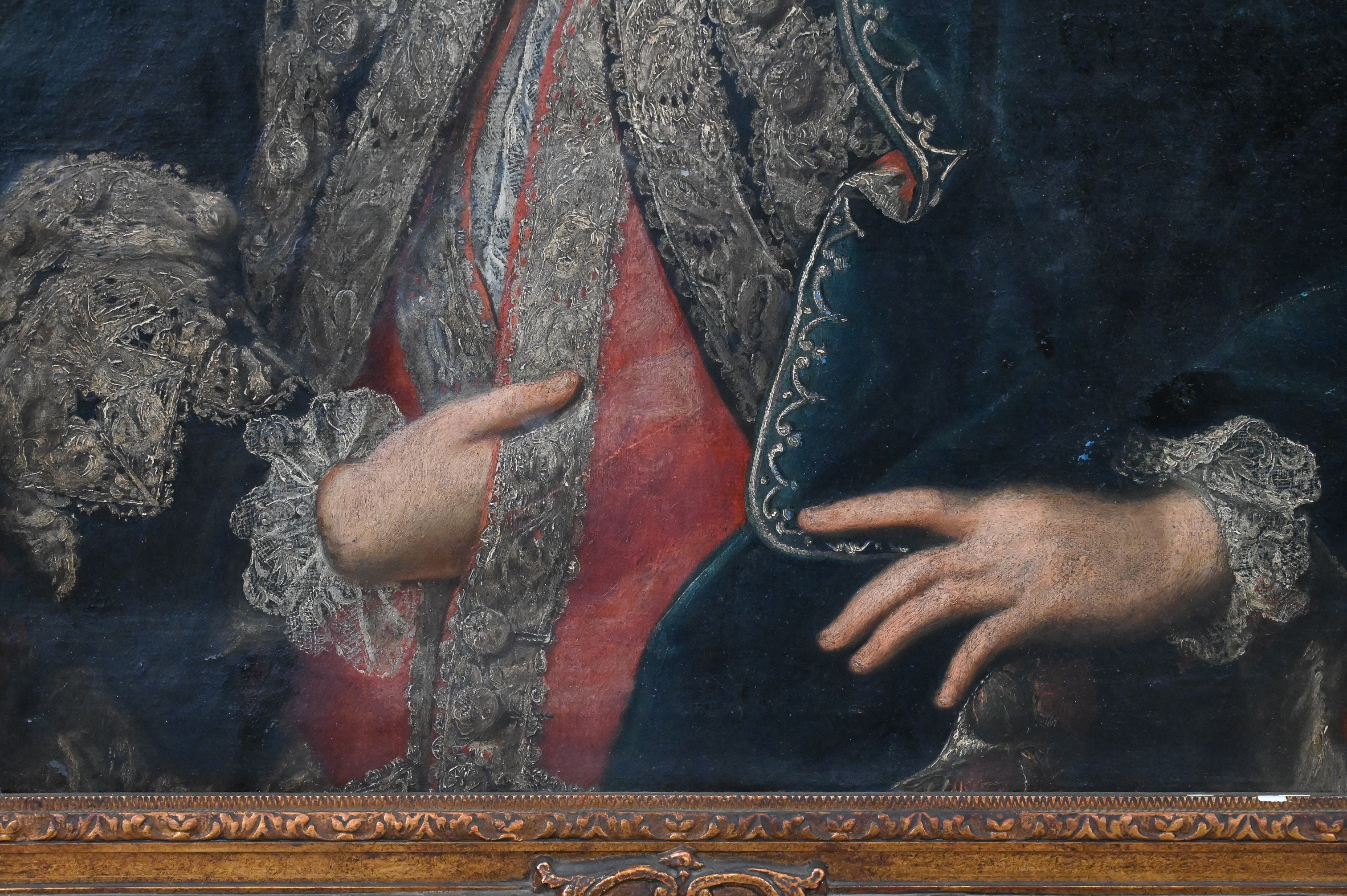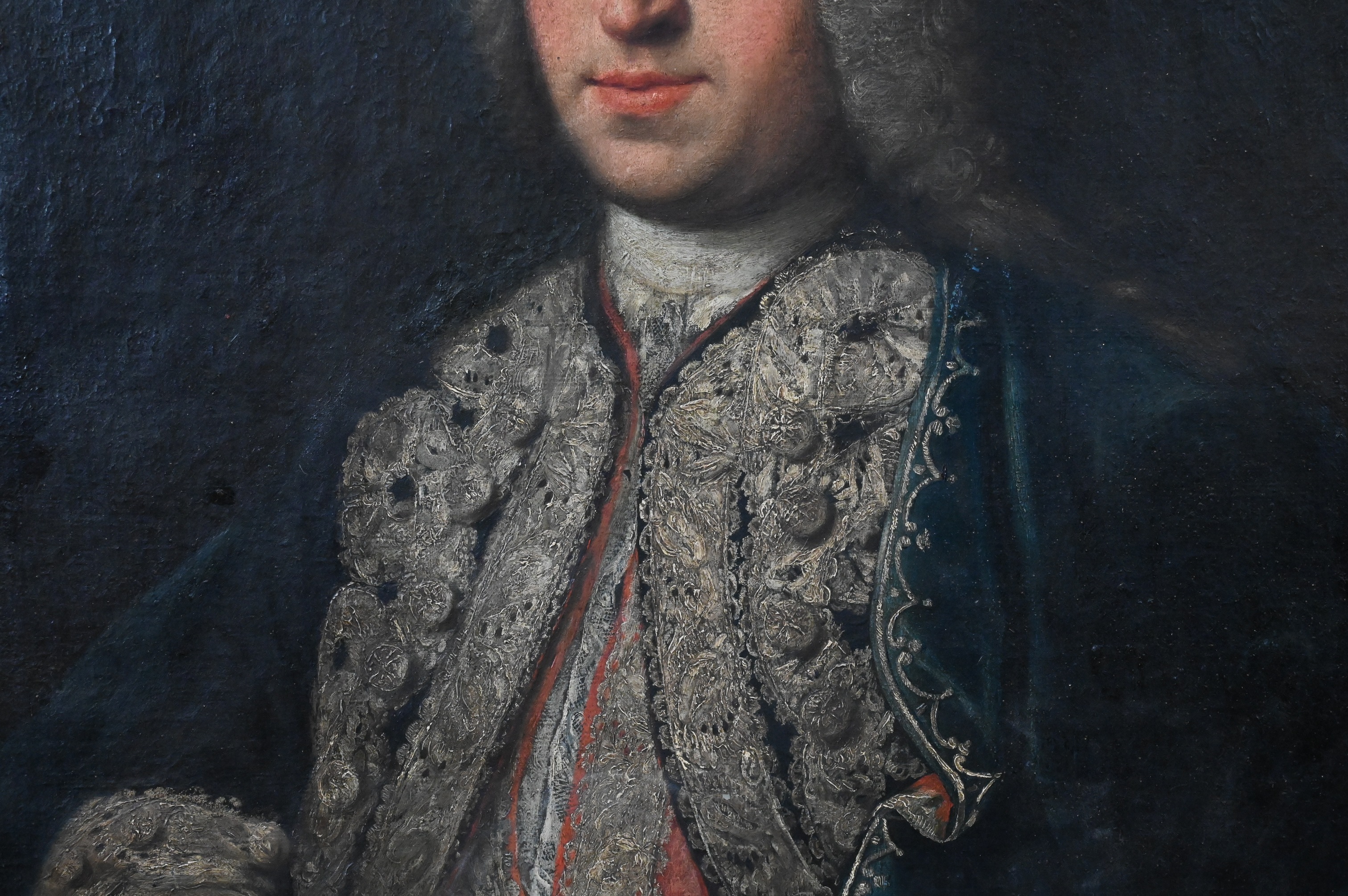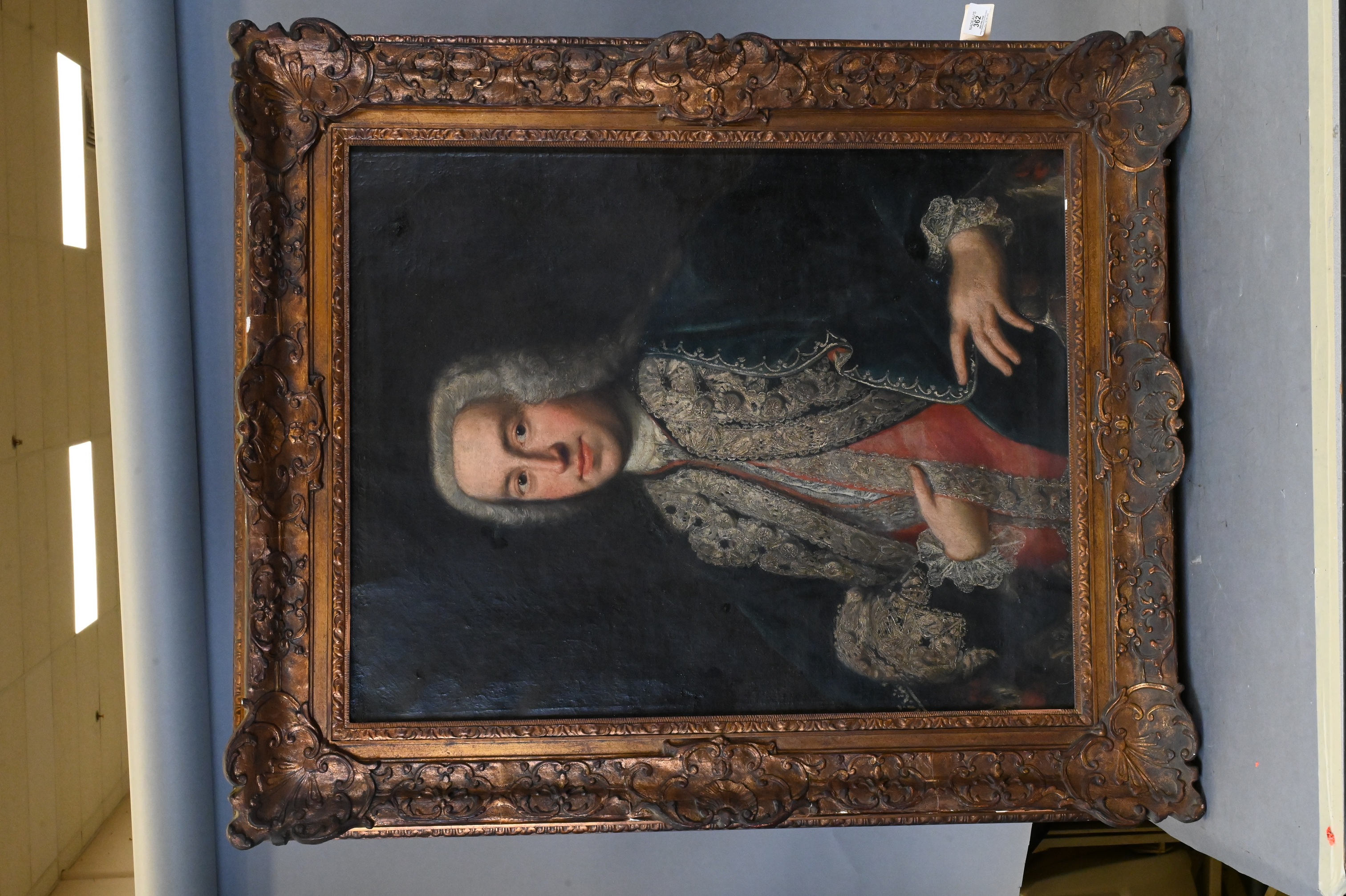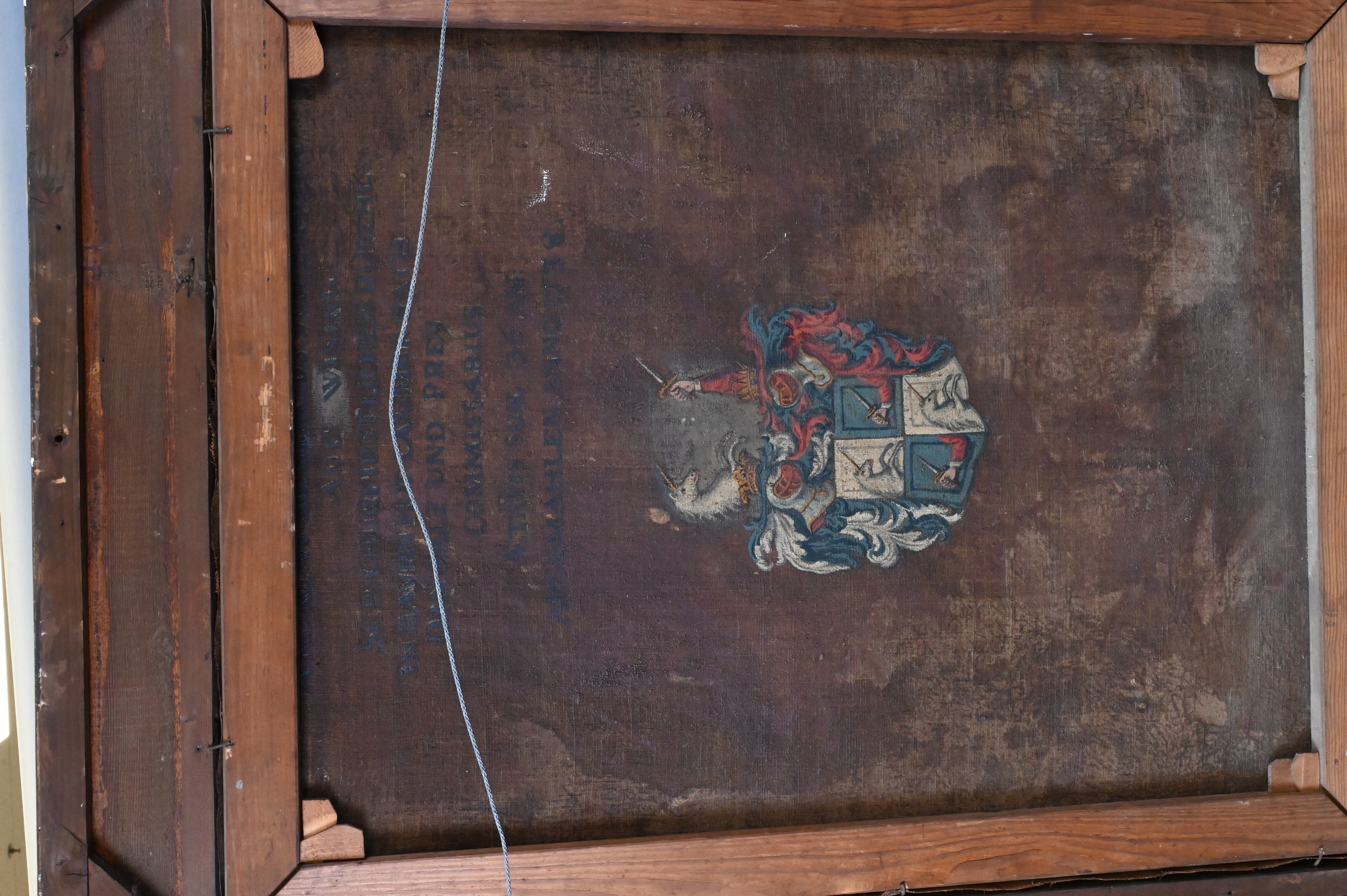 bust-length portrait of a gentleman wearing a powdered wig and richly embroidered velvet coat, shown with one hand tucked at his waist, the sitter identified on verso with an inscription as a Hofkammer Rat (Court Chamber Councilor) and Commissarius for salt and provisions under the Elector of Bavaria, portrayed at the age of 36 and painted in the year 1738, verso also bears a painted family coat of arms with unicorn crest