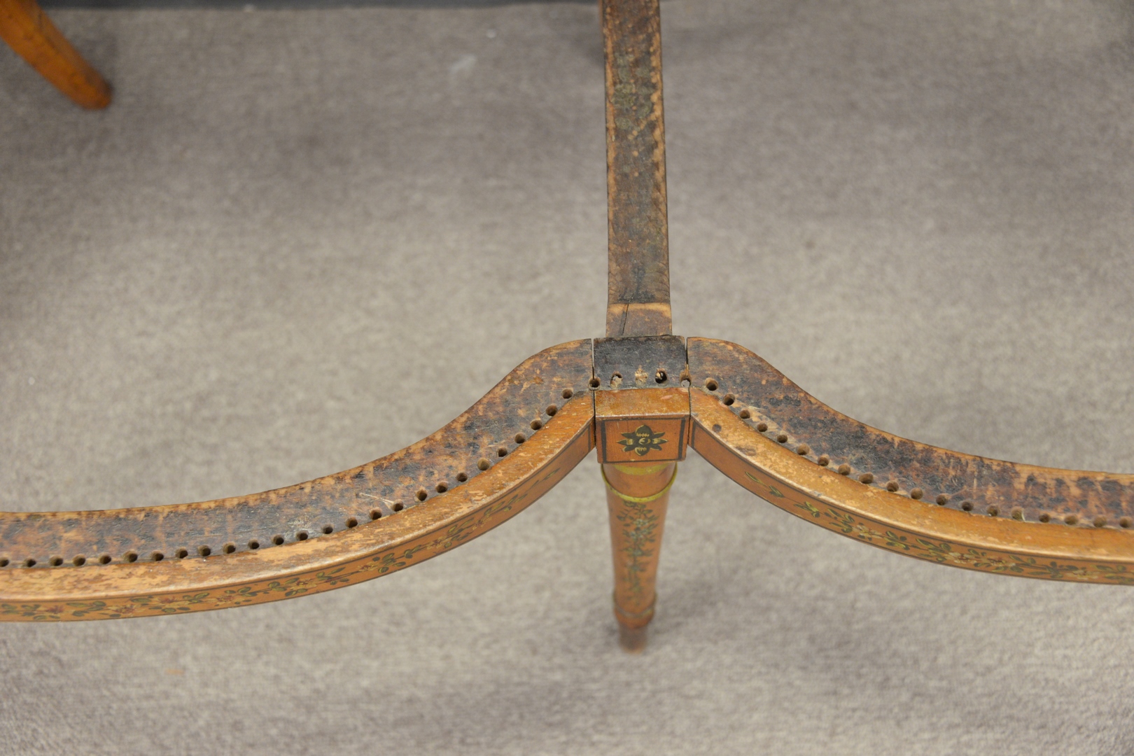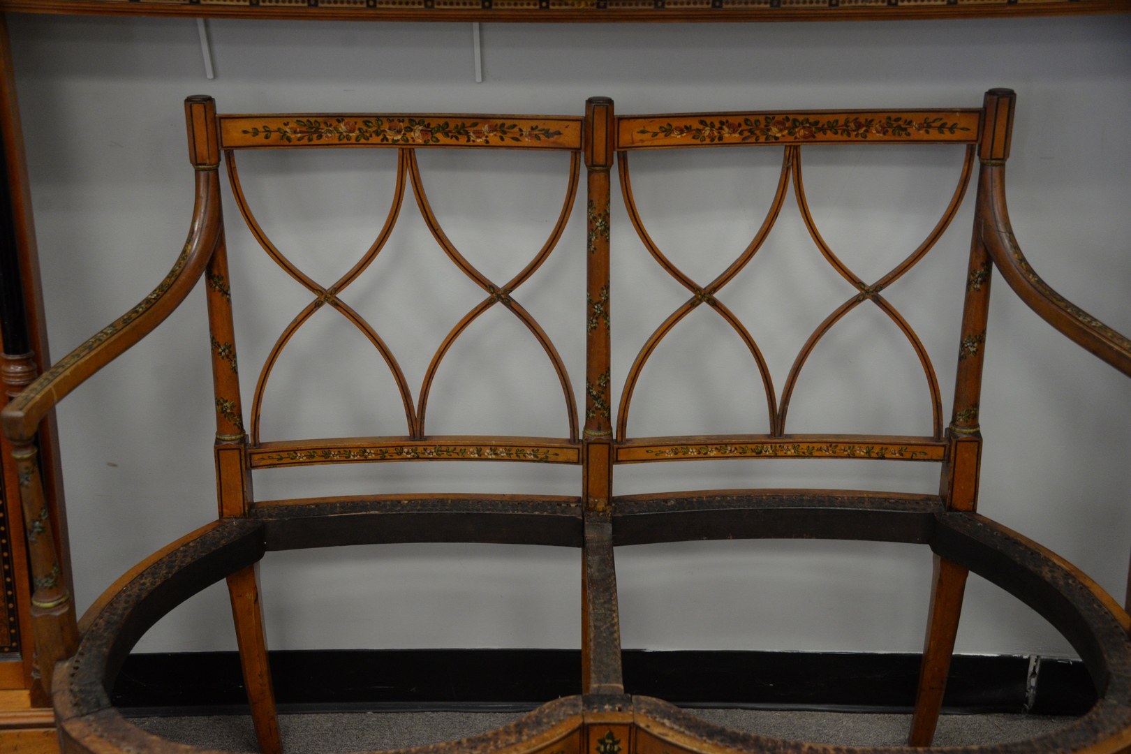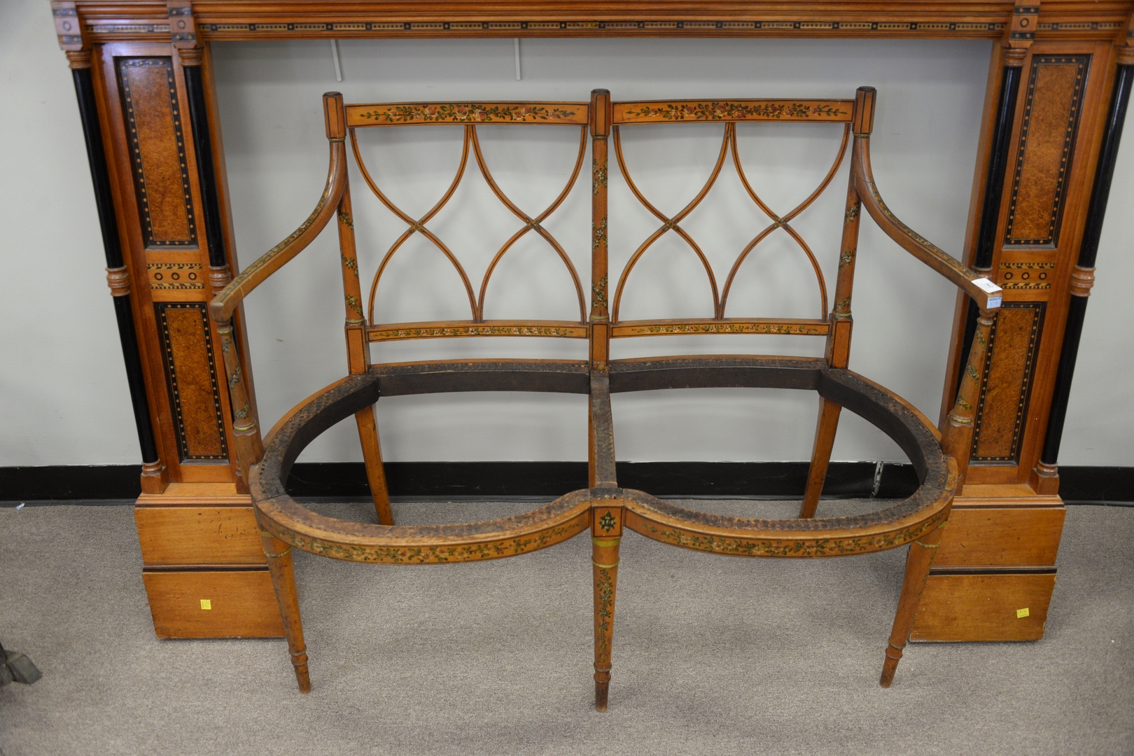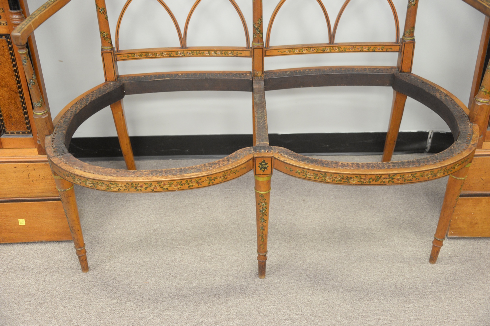 Lot 362: Edwardian Double Chair Back Settee, with paint decoration, 19th Century, no seat, height 36 inches, width 44 inches.