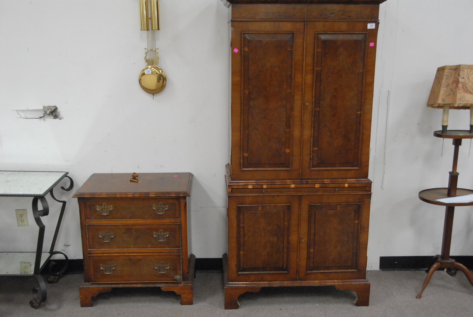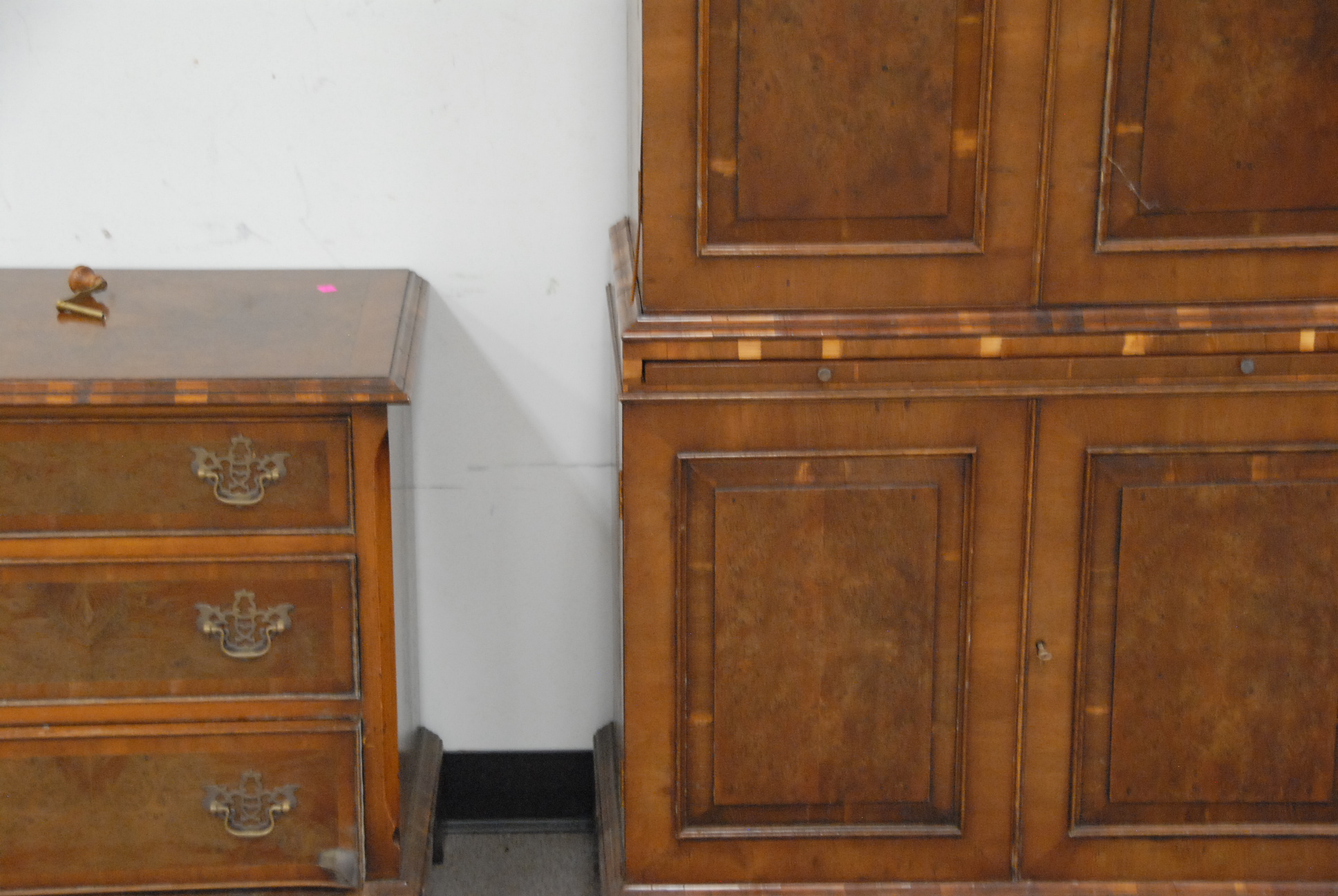 Elm armoire in two parts veneer lifting and a stand, ht. 69in. wd. 35in.