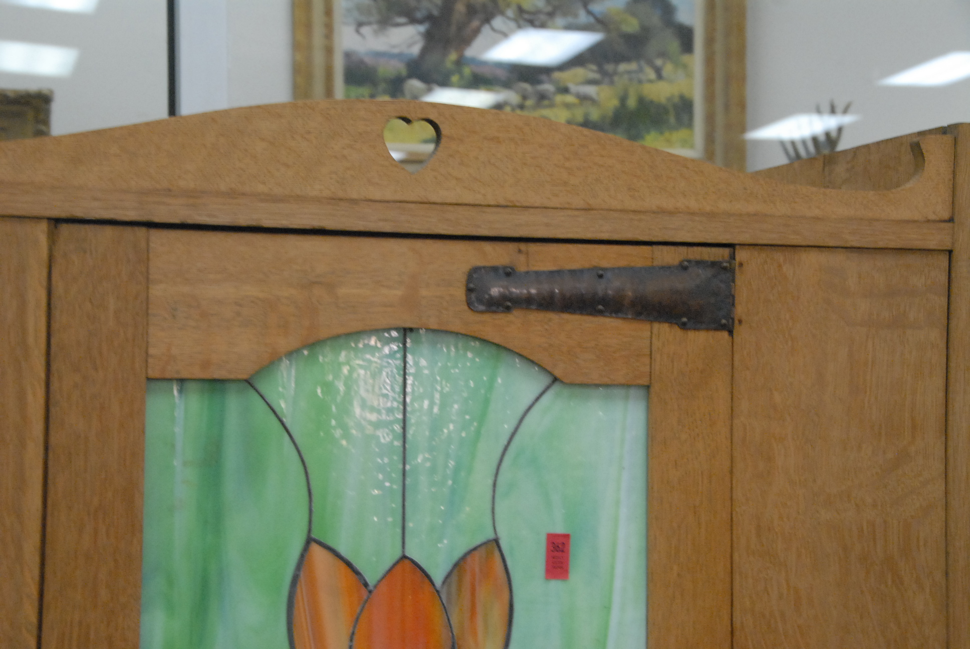 Lot 362: English Arts & Crafts oak armoire in the style of C.A. Voysey having a heart shaped cutout above a colored leaded glass door with co…