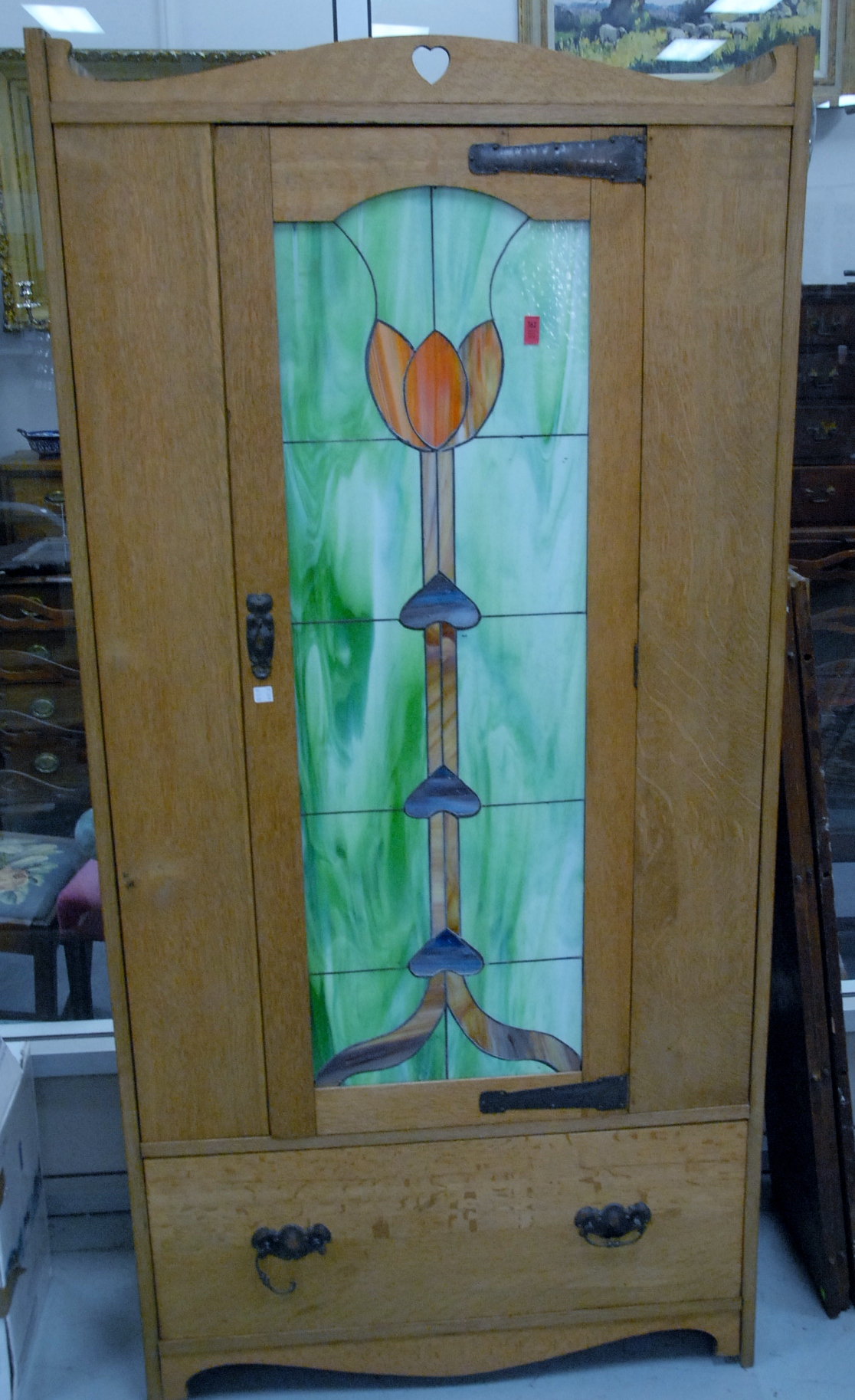 English Arts & Crafts oak armoire in the style of C.A. Voysey having a heart shaped cutout above a colored leaded glass door with copper strap hinges above a large single drawer, circa 1910, ht. 74 wd. 36.
