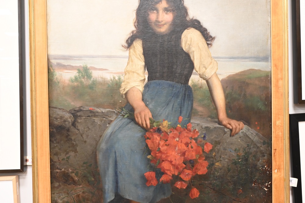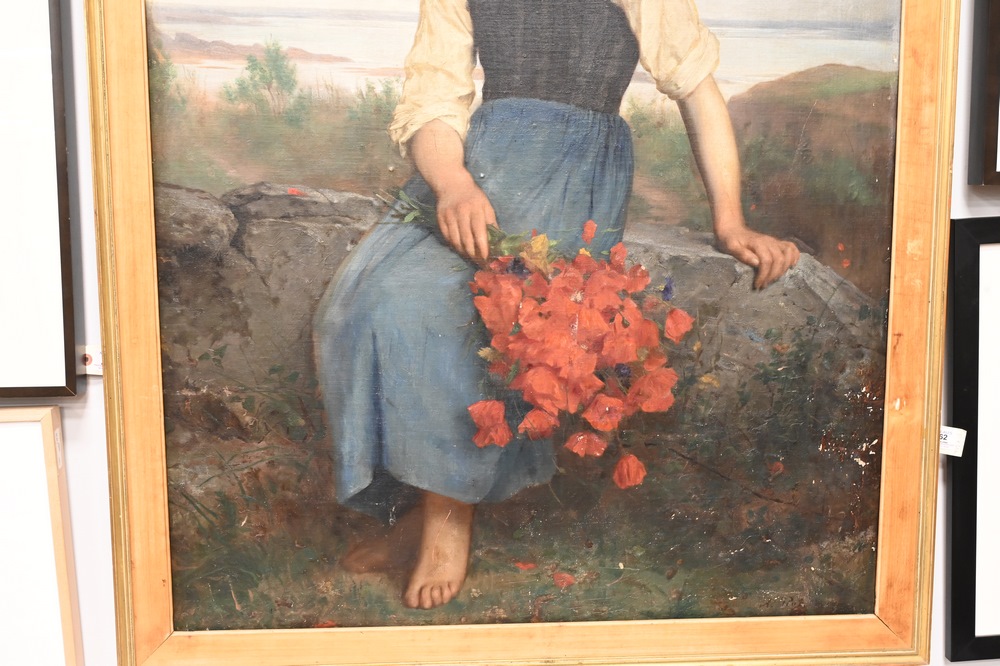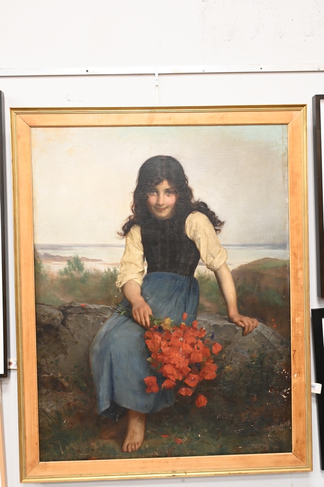 Lot 362: Etienne Adolphe Piot (1850 – 1910), young girl holding poppies, oil on canvas laid on panel, signed A. Piot lower right, 45 1/2″ x 3…