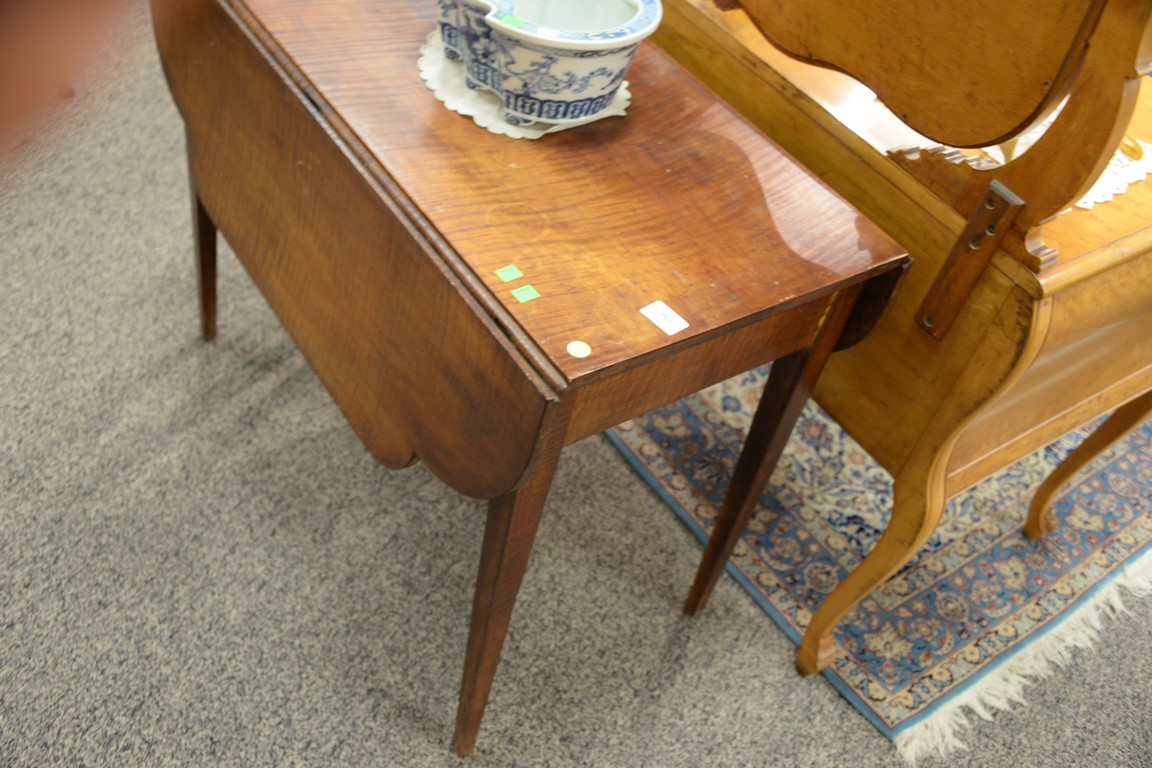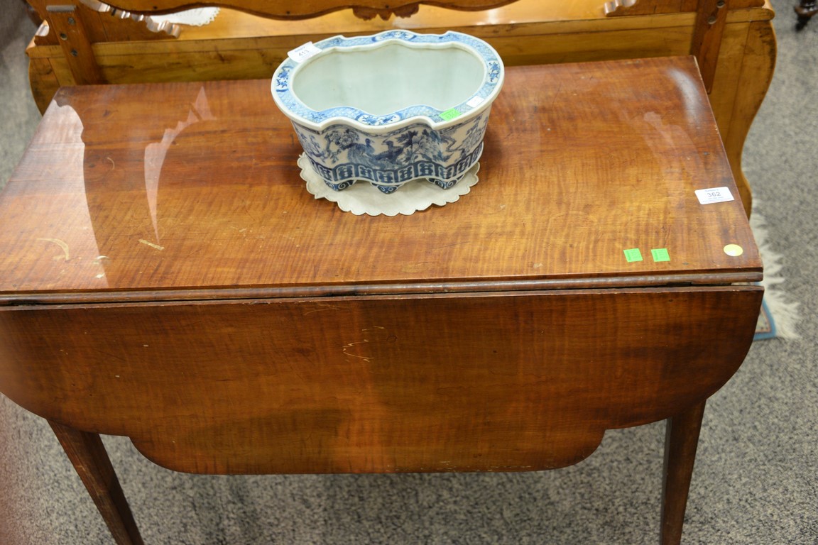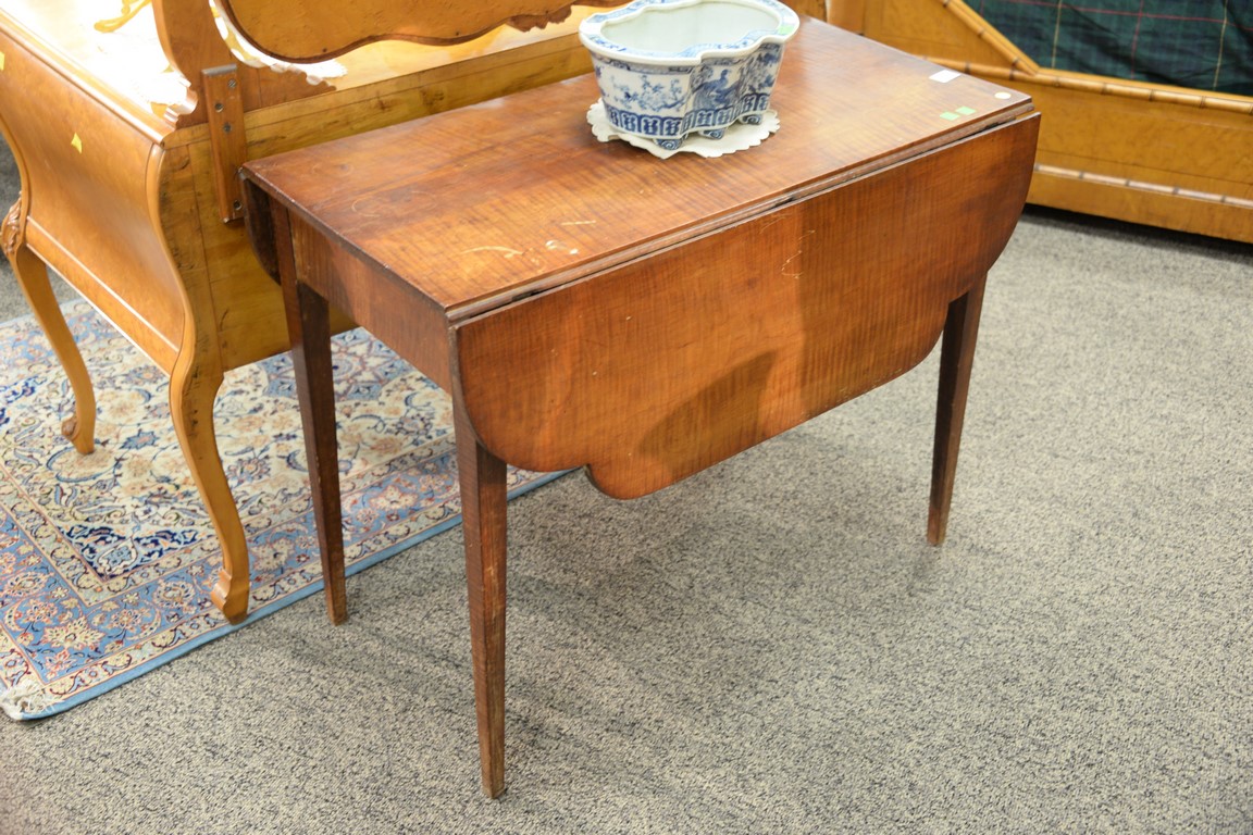 Lot 362: Federal tiger maple table with shaped drop leaves and old paper label underneath stating it belonged to R.D. M. Smith, circa 1790-1810.