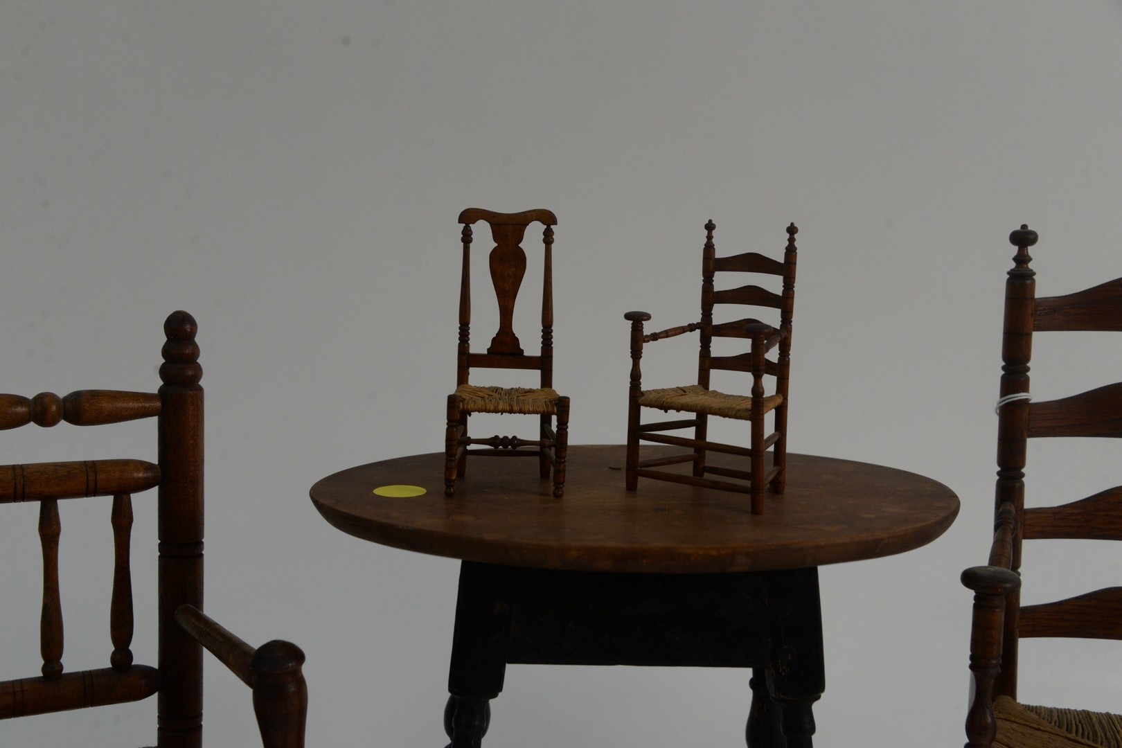 Lot 362: Five Piece Group of Miniature Furniture Group to include, ladder back great chair, height 12 inches arm chair one small ladder back arm chair one small side chair along with a dining table. Provenance: The Estate of Diana Atwood Johnson.