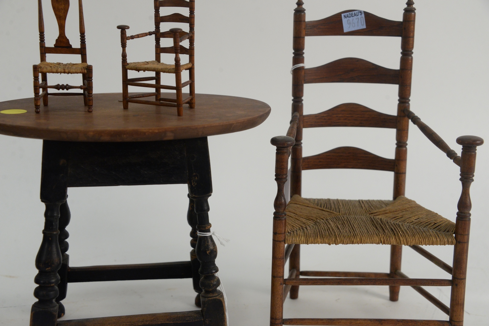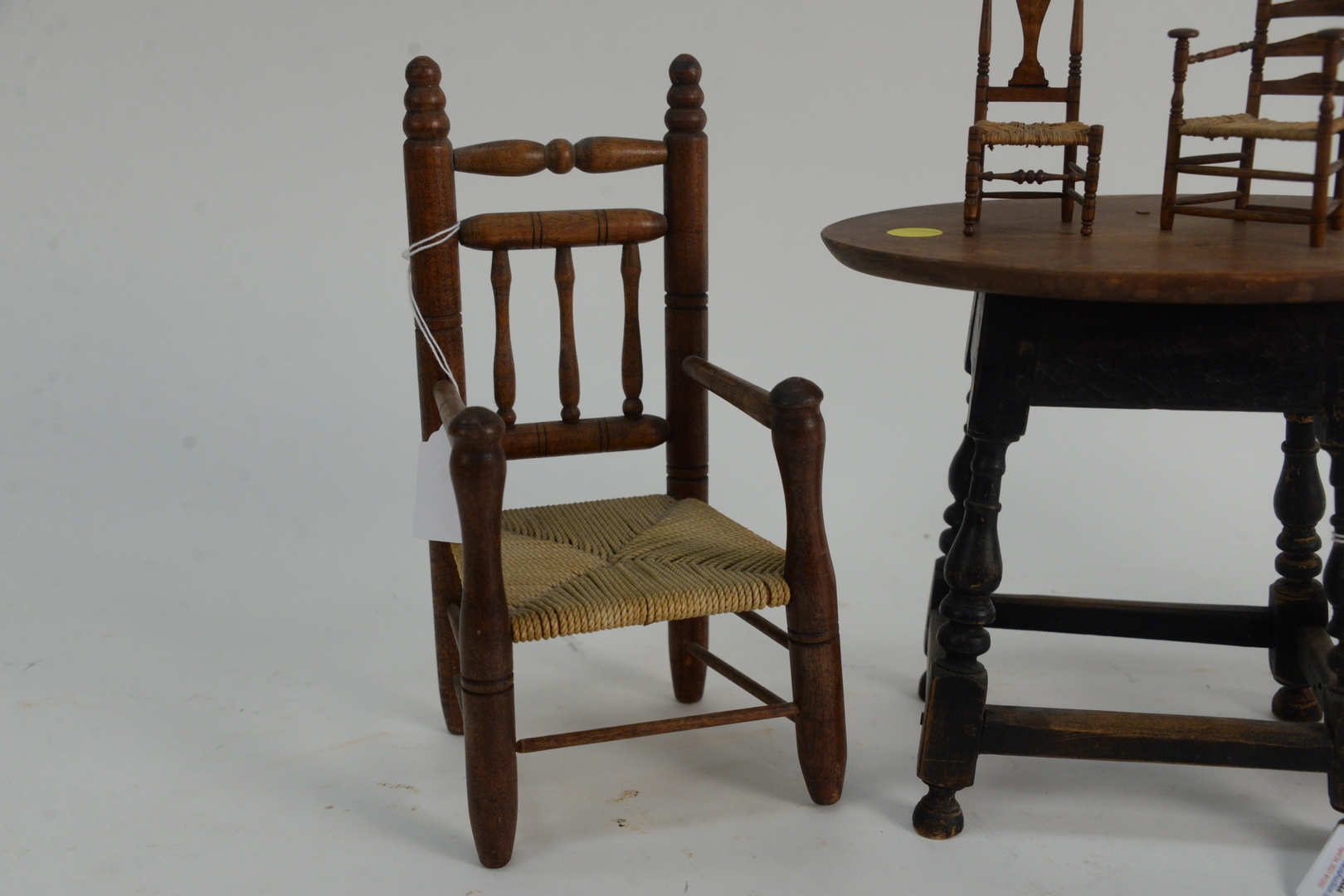 Five Piece Group of Miniature Furniture Group to include, ladder back great chair, height 12 inches arm chair one small ladder back arm chair one small side chair along with a dining table. Provenance: The Estate of Diana Atwood Johnson.