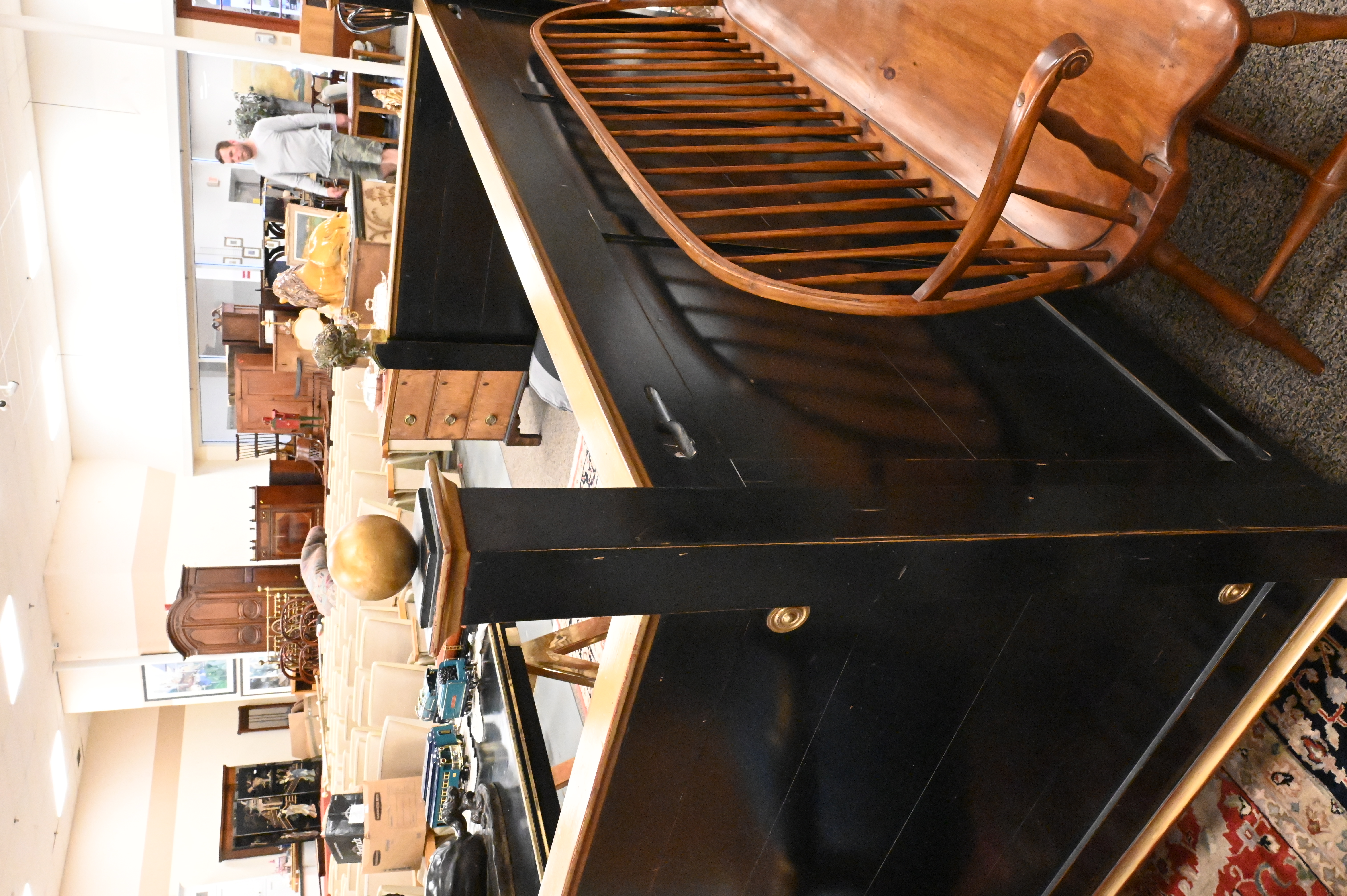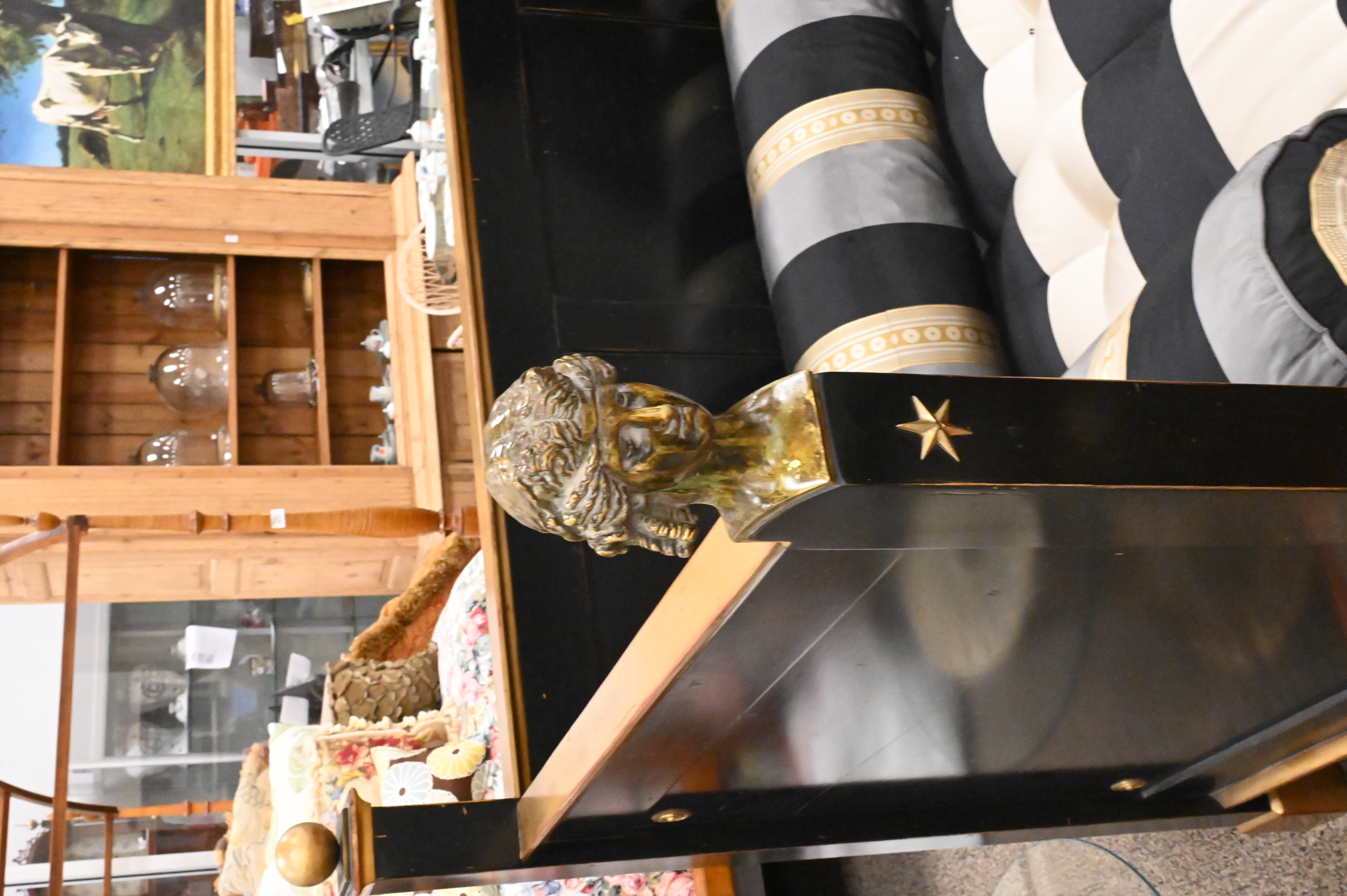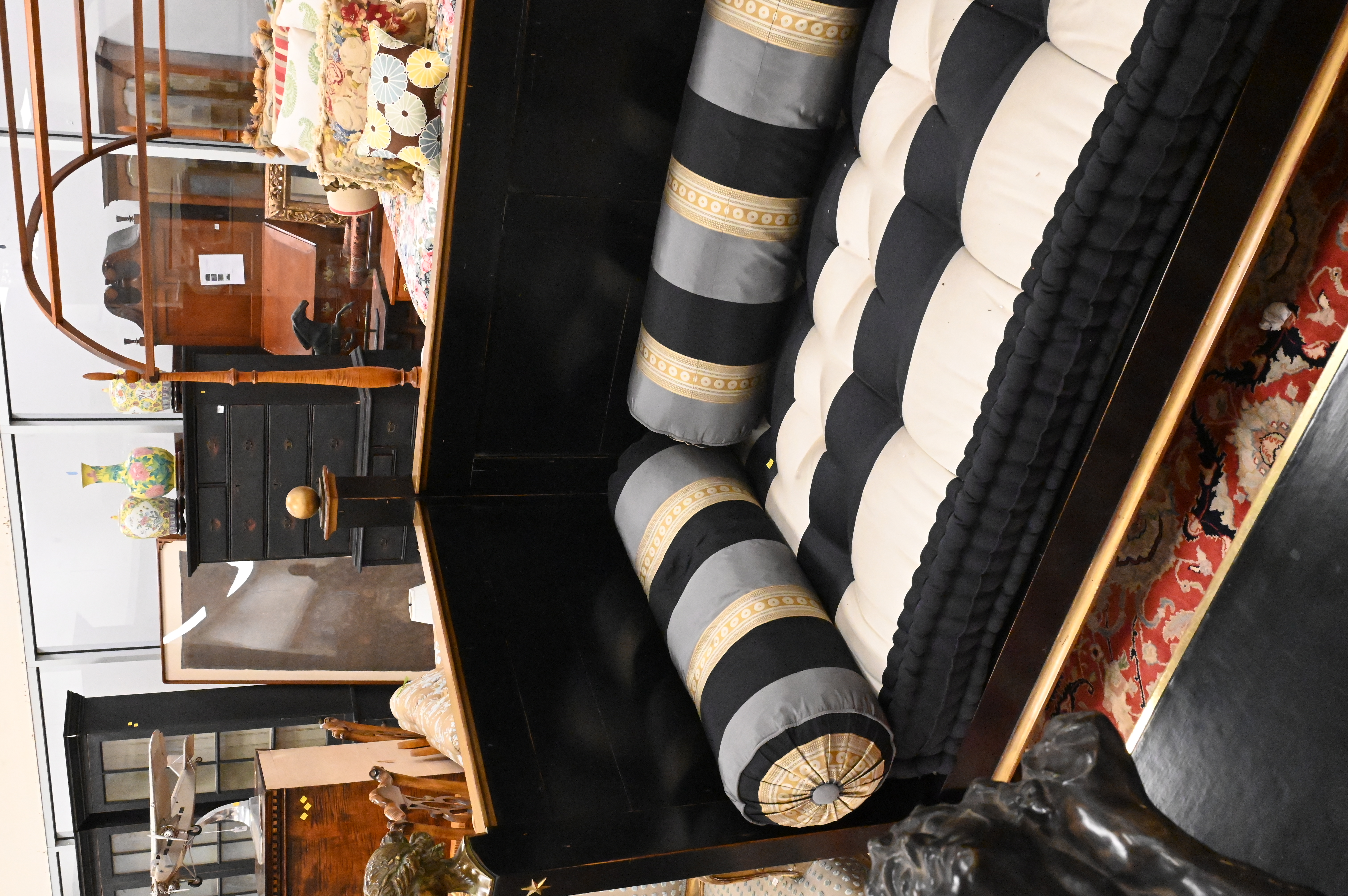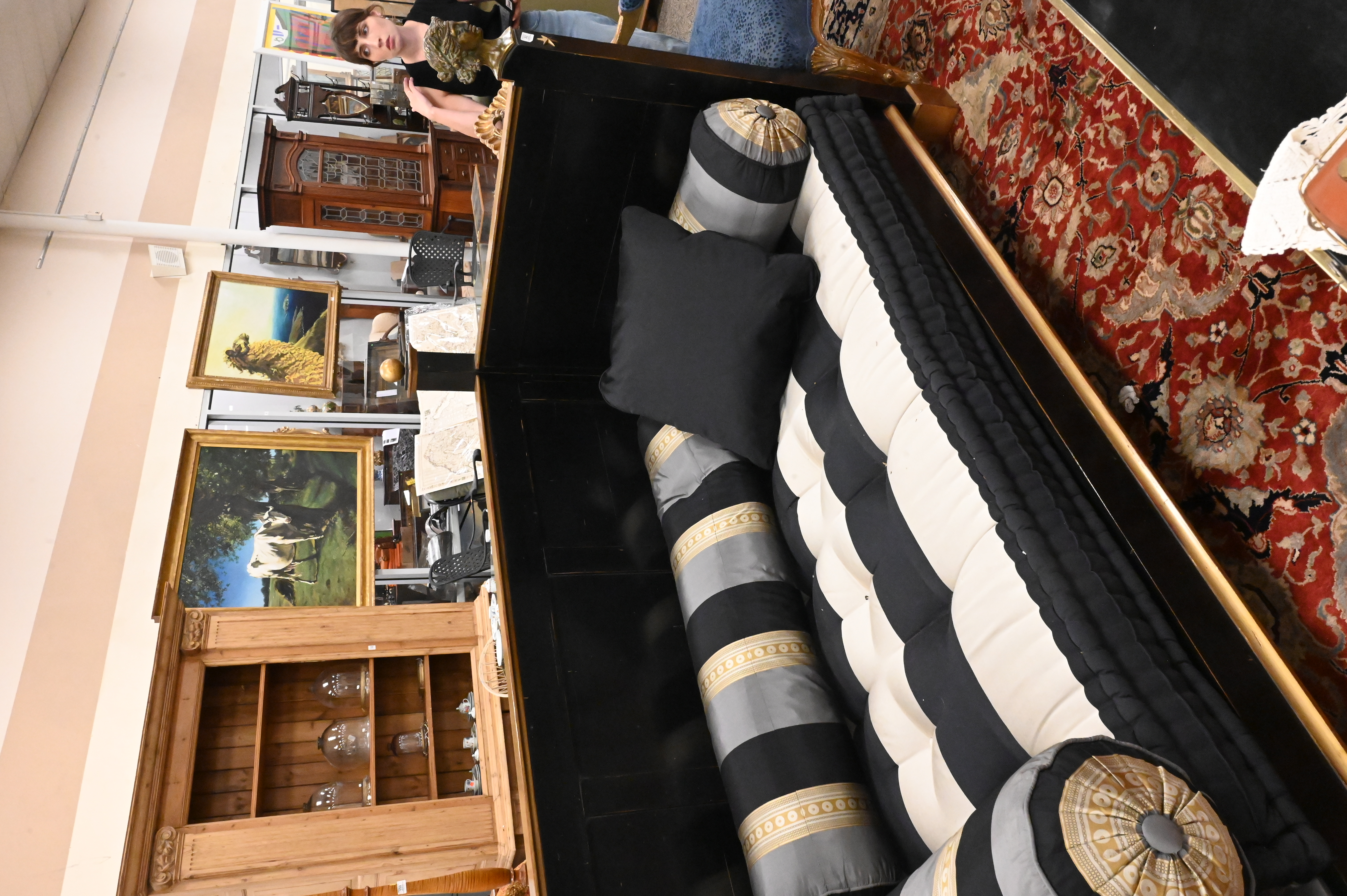 painted black and adored with bronze female bust finials, having custom upholstered mattress, pillows, and balusters