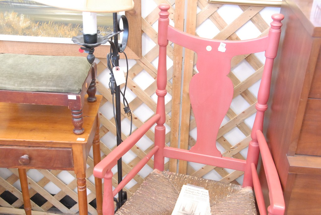 Lot 362: Group lot of five pieces Queen Anne style armchair, metal floor lamp, one drawer stand, foot stool, yellow upholstered chair.
