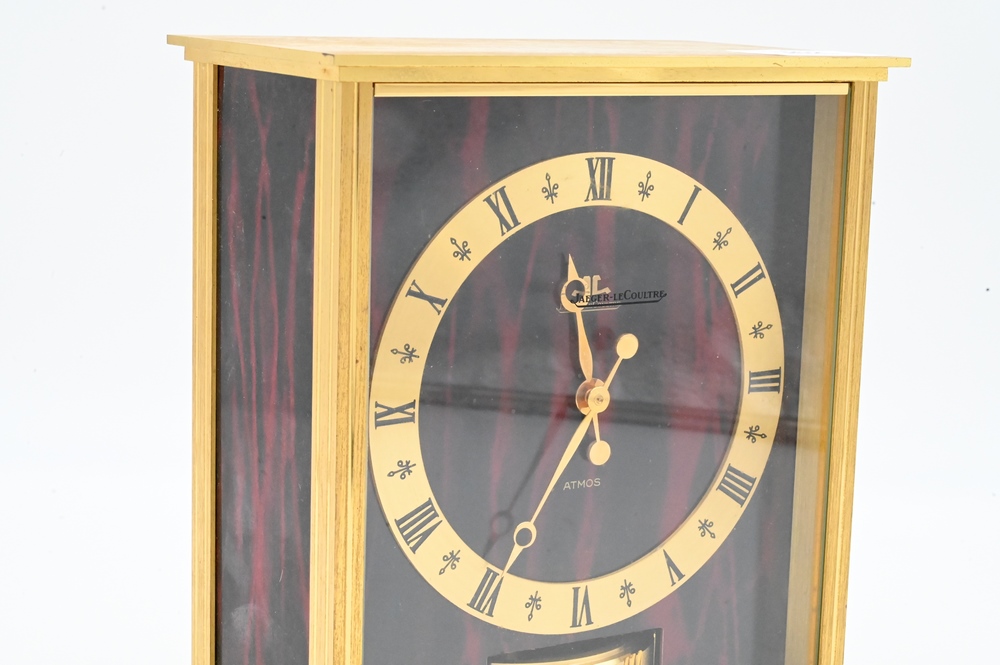 Jaeger LeCoultre Atmos Clock, embassy red, having faux marble panels, height 8 1/2 inches. Provenance: Collections of Norma Reilly, New Jersey.