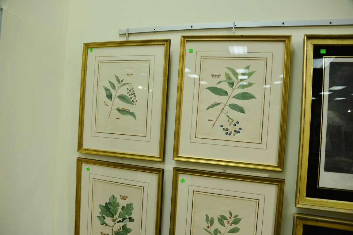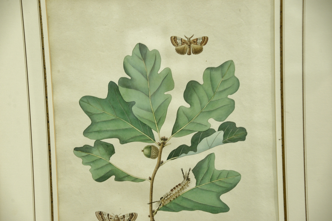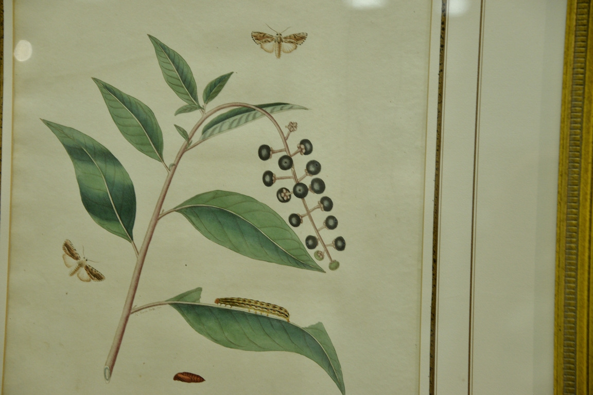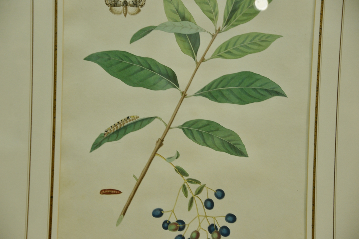 John Abbot 1751-1839 four hand colored aquatint engravings including Green-Variegrated Prominent Moth Phalaena Unicornis plate #86, Grey O Moth Phalaena Chionanthi plate #98, Dark-Clouded Tussock Moth Phalaena Achatina plate #77, and Poke-Weed Moth Phalaena Phytolaccae plate #97, published by James Edward Smith, sight size each: 14 1/4 x 11 Provenance: Property from Credit Suisse’s Americana Collection