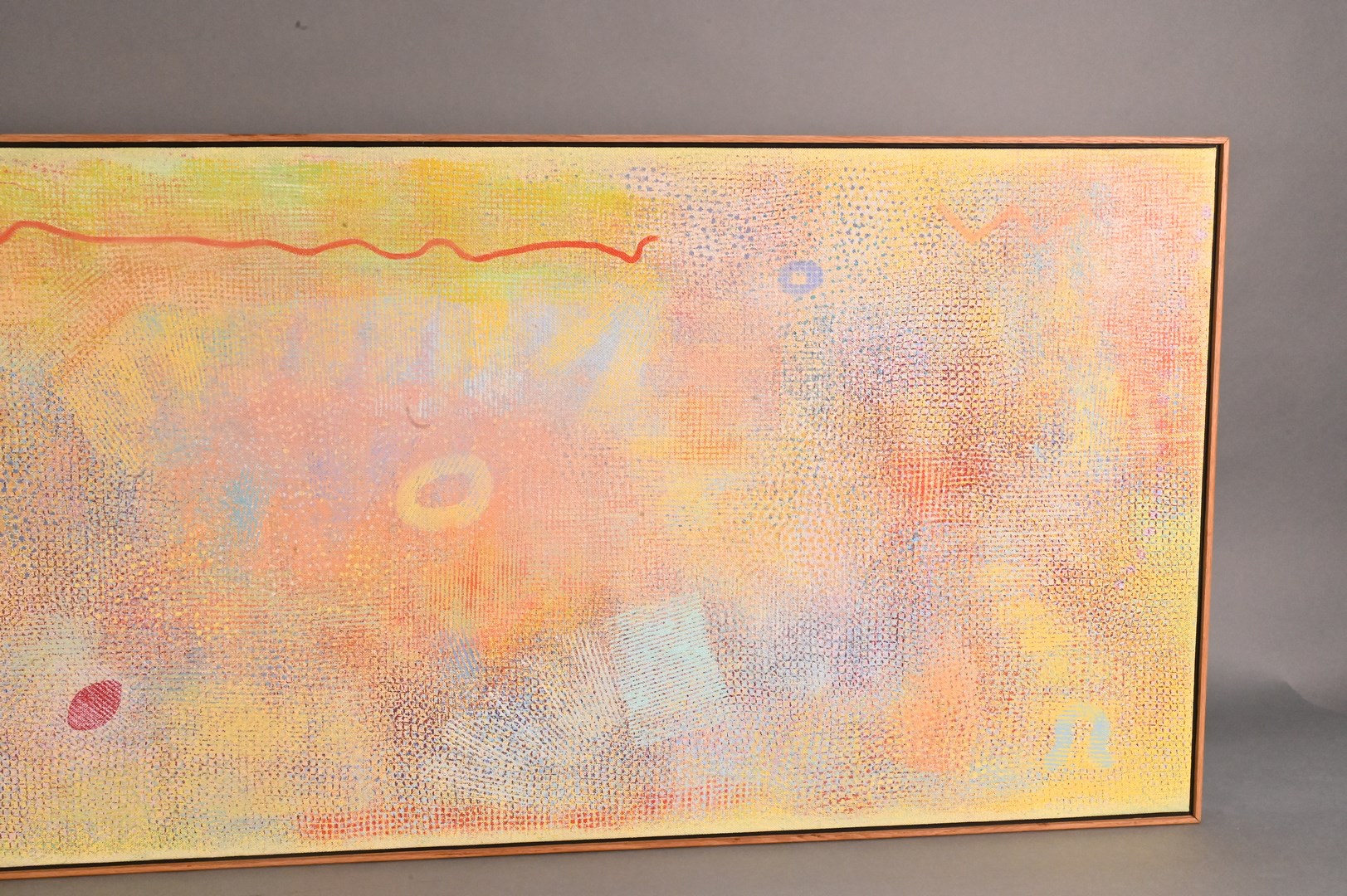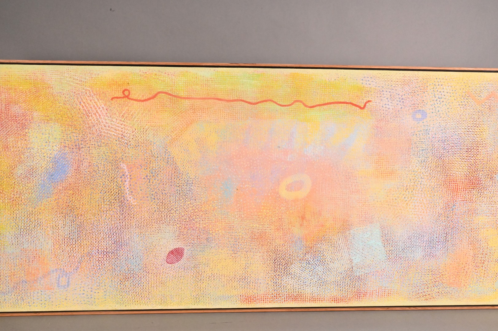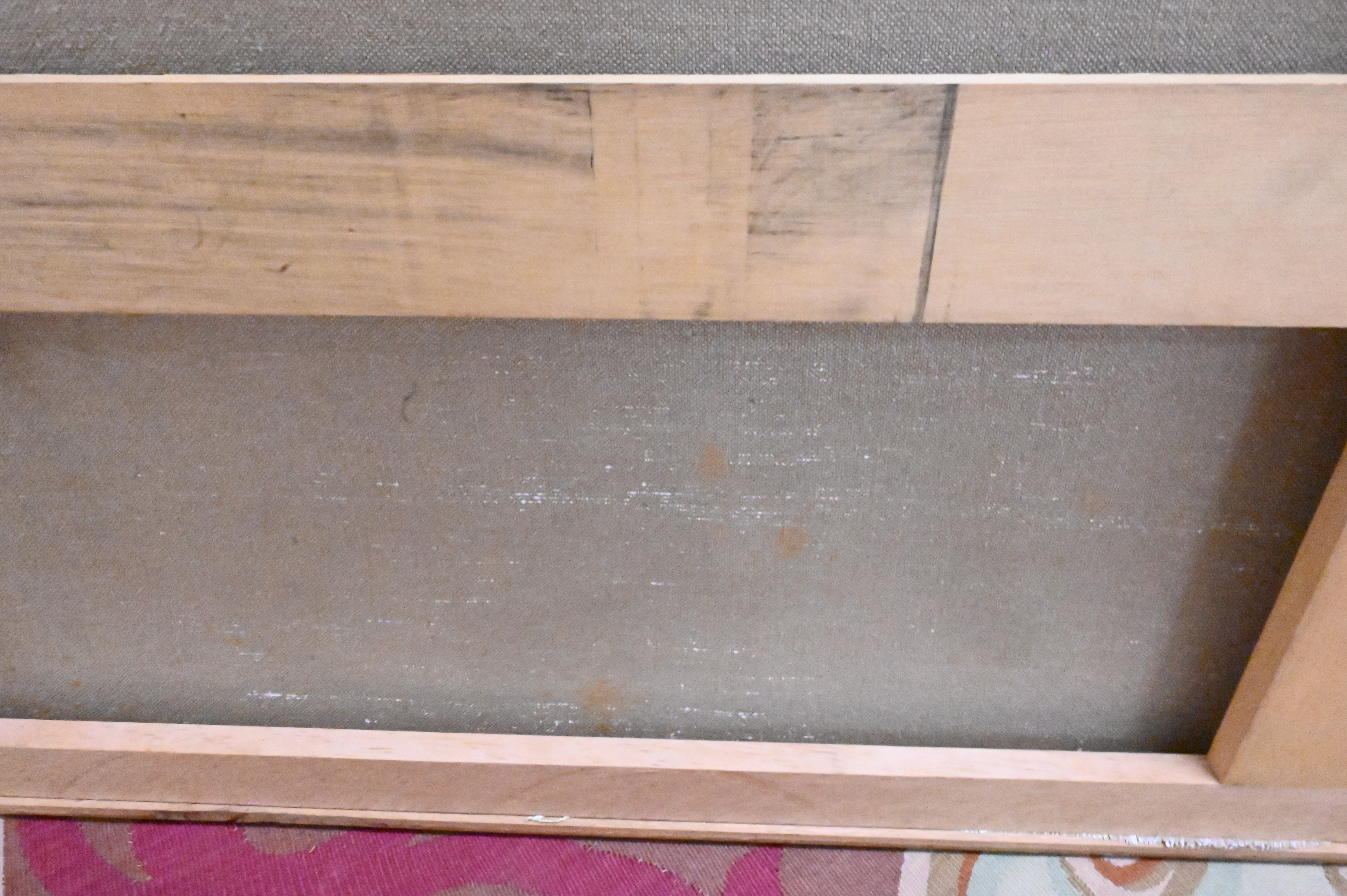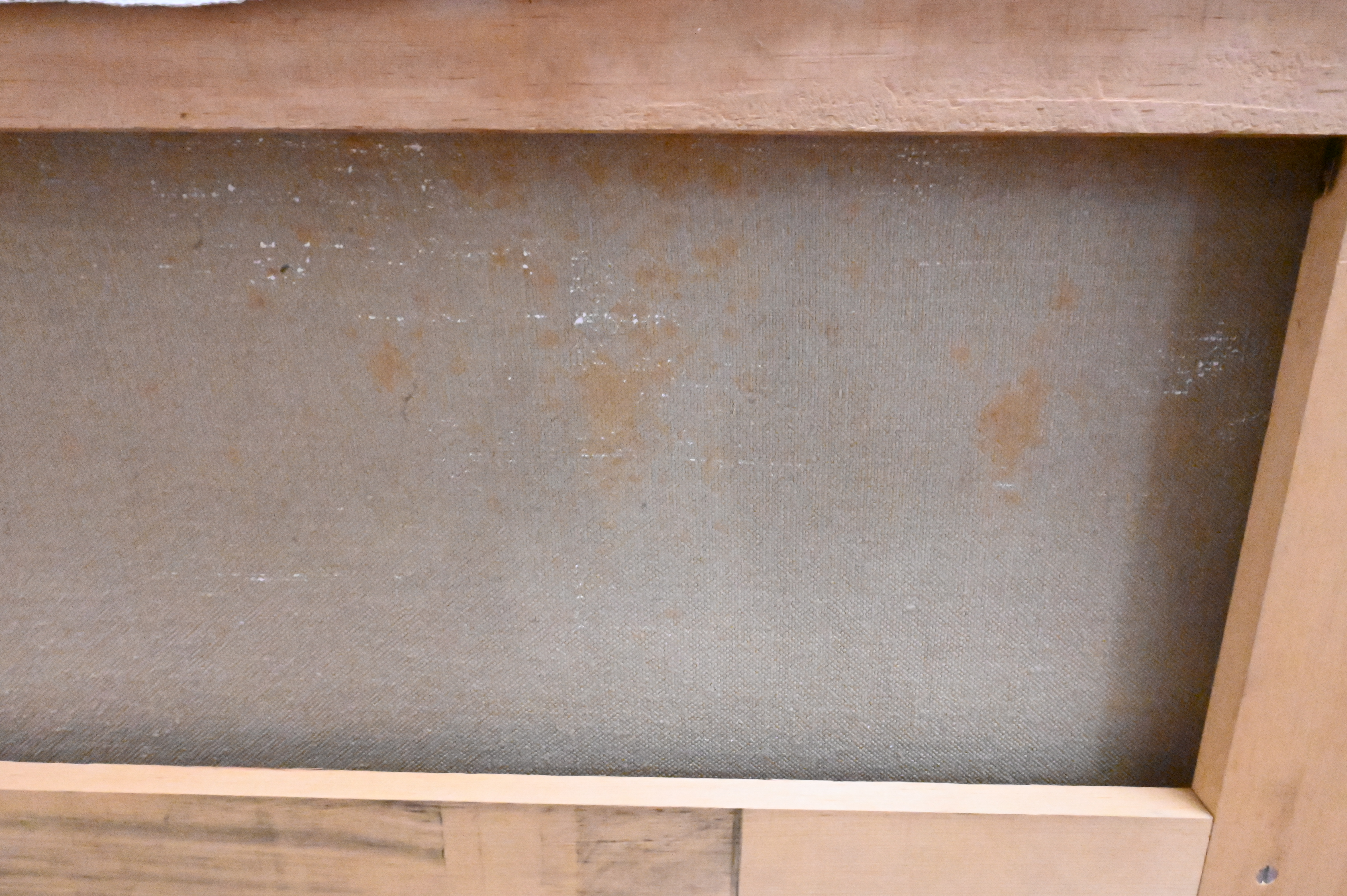 Condition: Overall very good condition, slight staining to border, sight size: 28″ h x 72″ w; frame: 29″ h x 73″ w. Good under black light