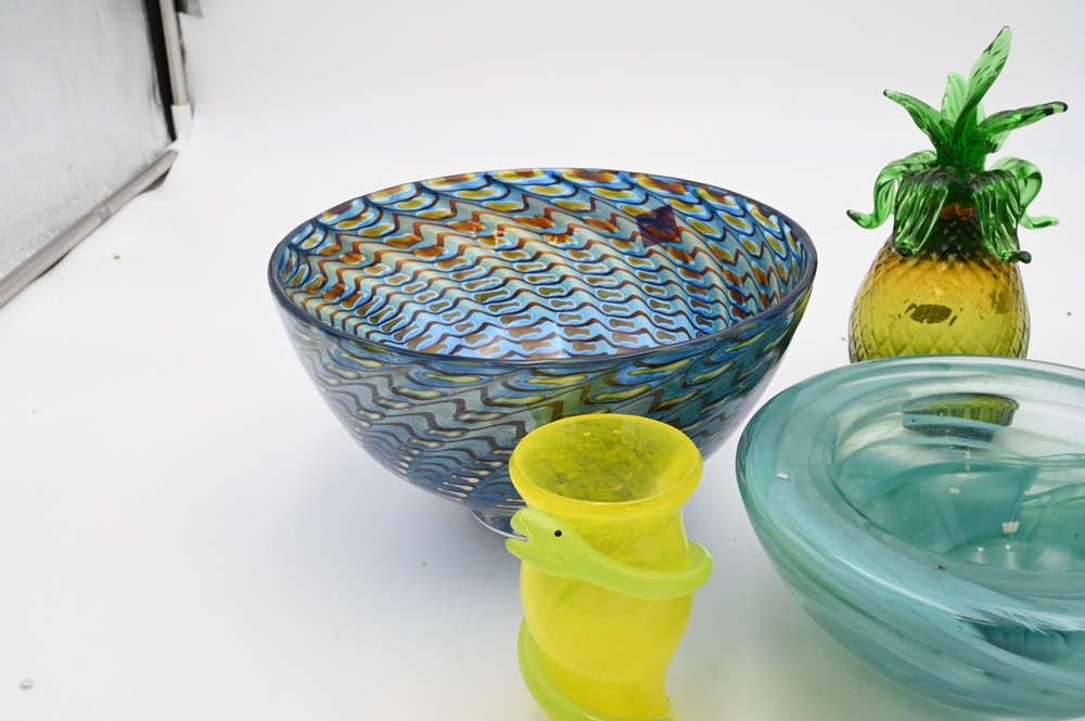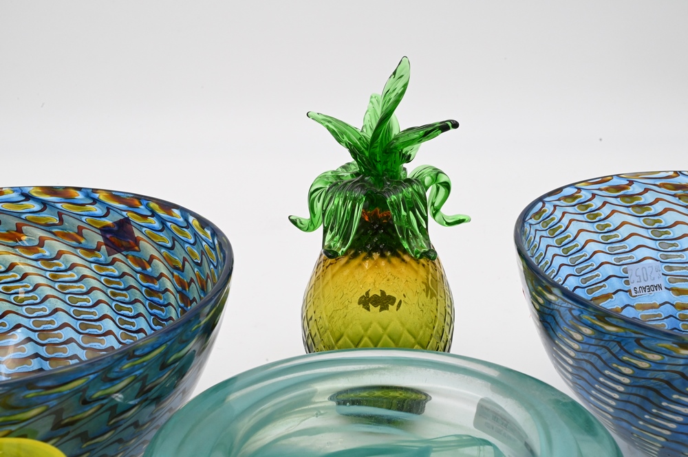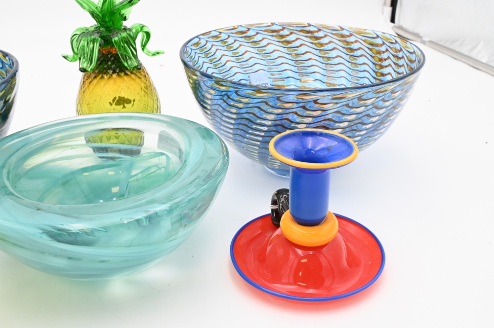 Six Piece Group of Art Glass, to include two Kosta Boda Bertil Vallien bowls, Kosta Boda vase with applied snake, signed U.H. Vallien, multi colored candlesticks, and a murano pineapple, diameter 8 inches.