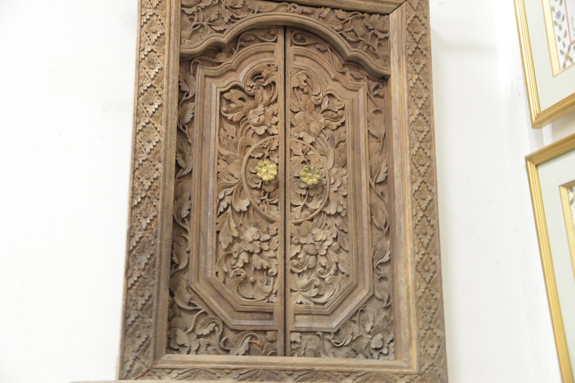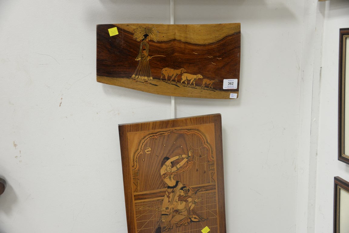 Lot 362: Three carved pieces including two inlaid plaques and a carved double door. smallest: 7 1/2 x 14, largest: 22 1/2 x 21 1/2