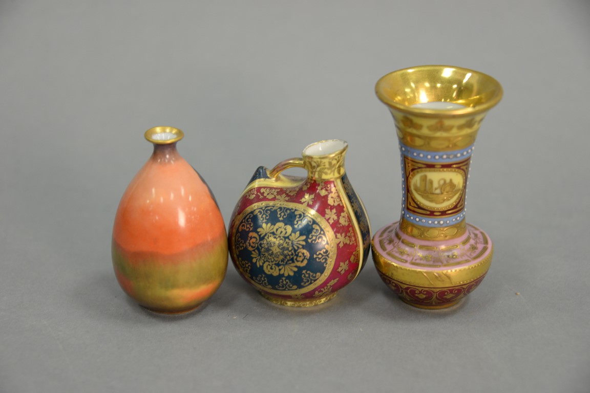 Lot 362: Three porcelain cabinet vases including Luscian ware portrait miniature vase with hand painted peasant girl and two Royal Vienna por…