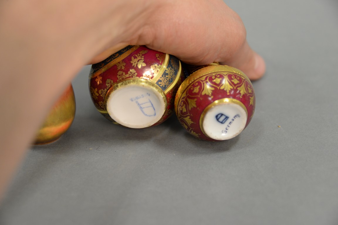 Three porcelain cabinet vases including Luscian ware portrait miniature vase with hand painted peasant girl and two Royal Vienna porcelain gilded cabinet vases both with hand painted romantic scenes. ht. 2 1/4in., 2 1/2in., & 3 1/4in.