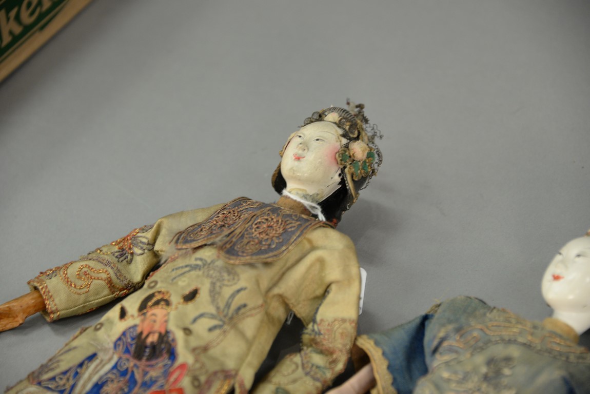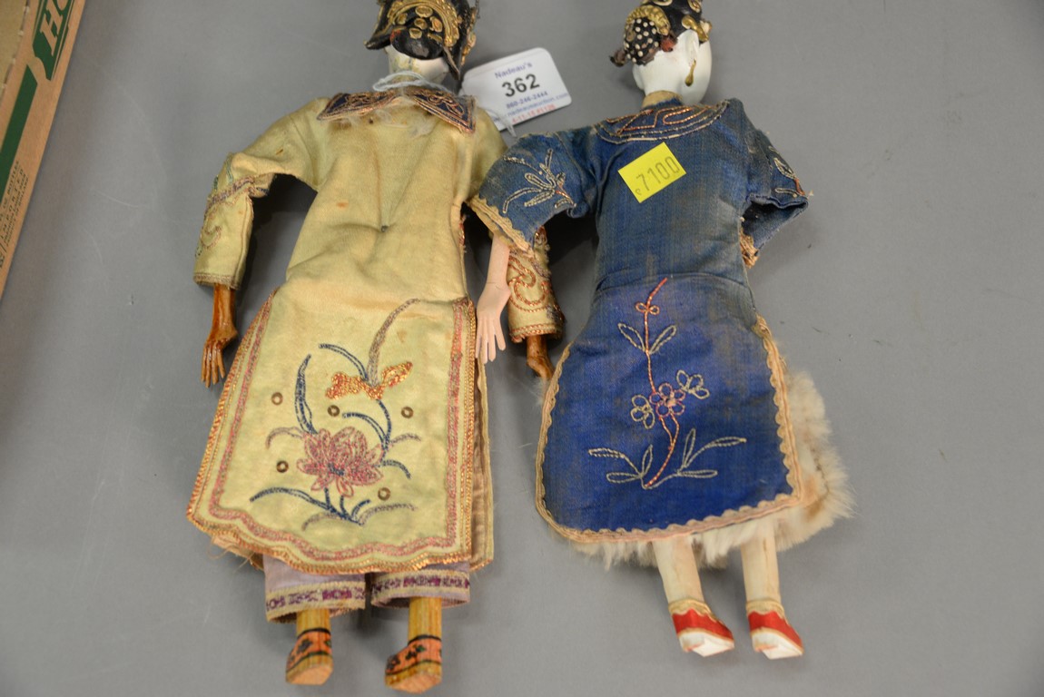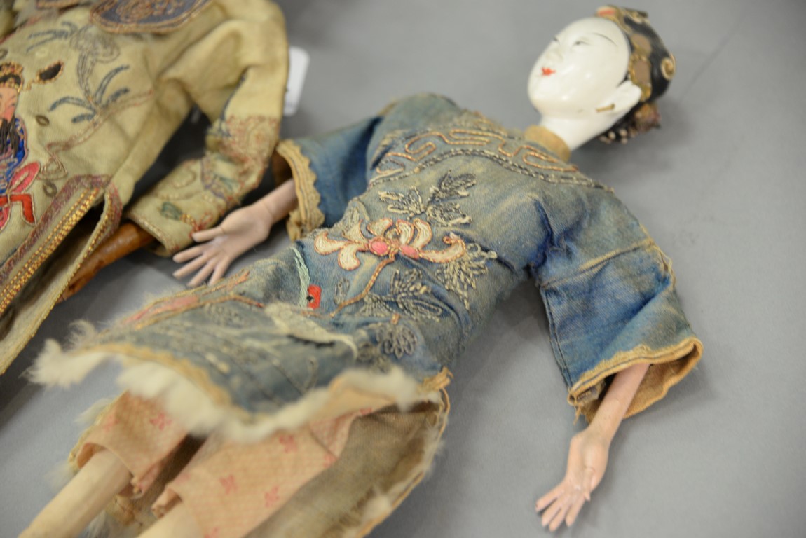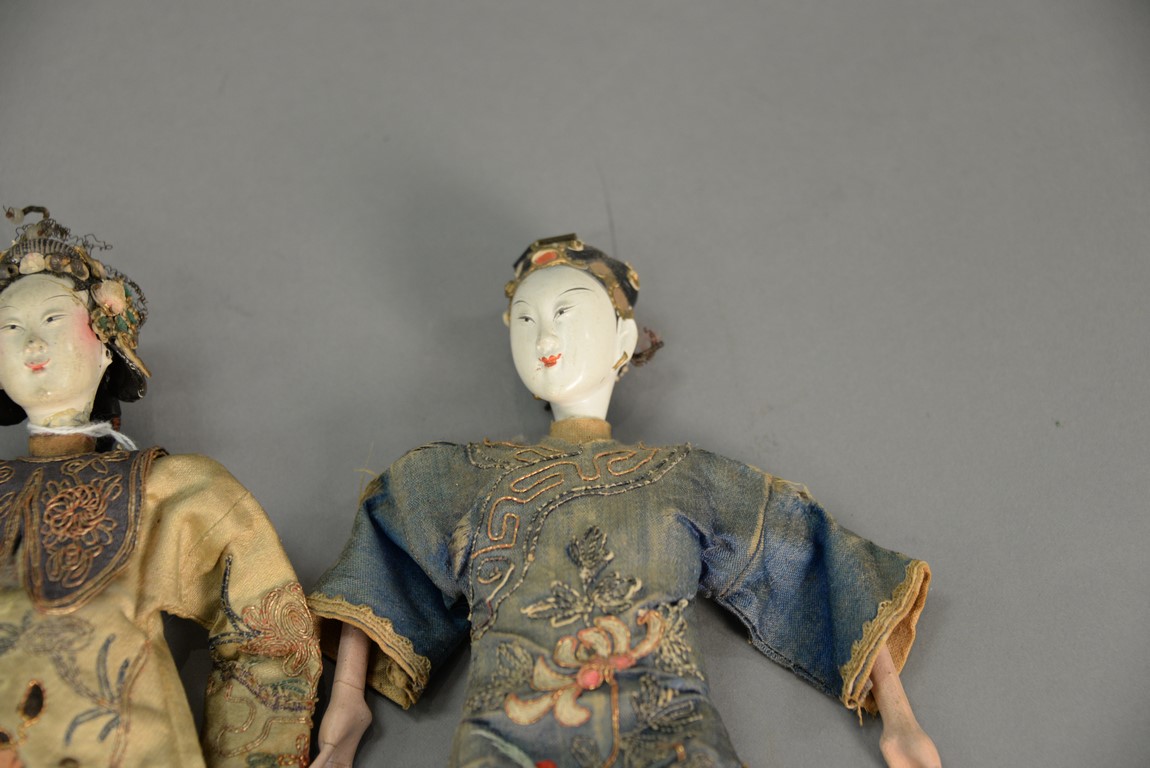 Two Chinese dolls with white painted faces and embroidered robes. ht. 10 1/4 in.